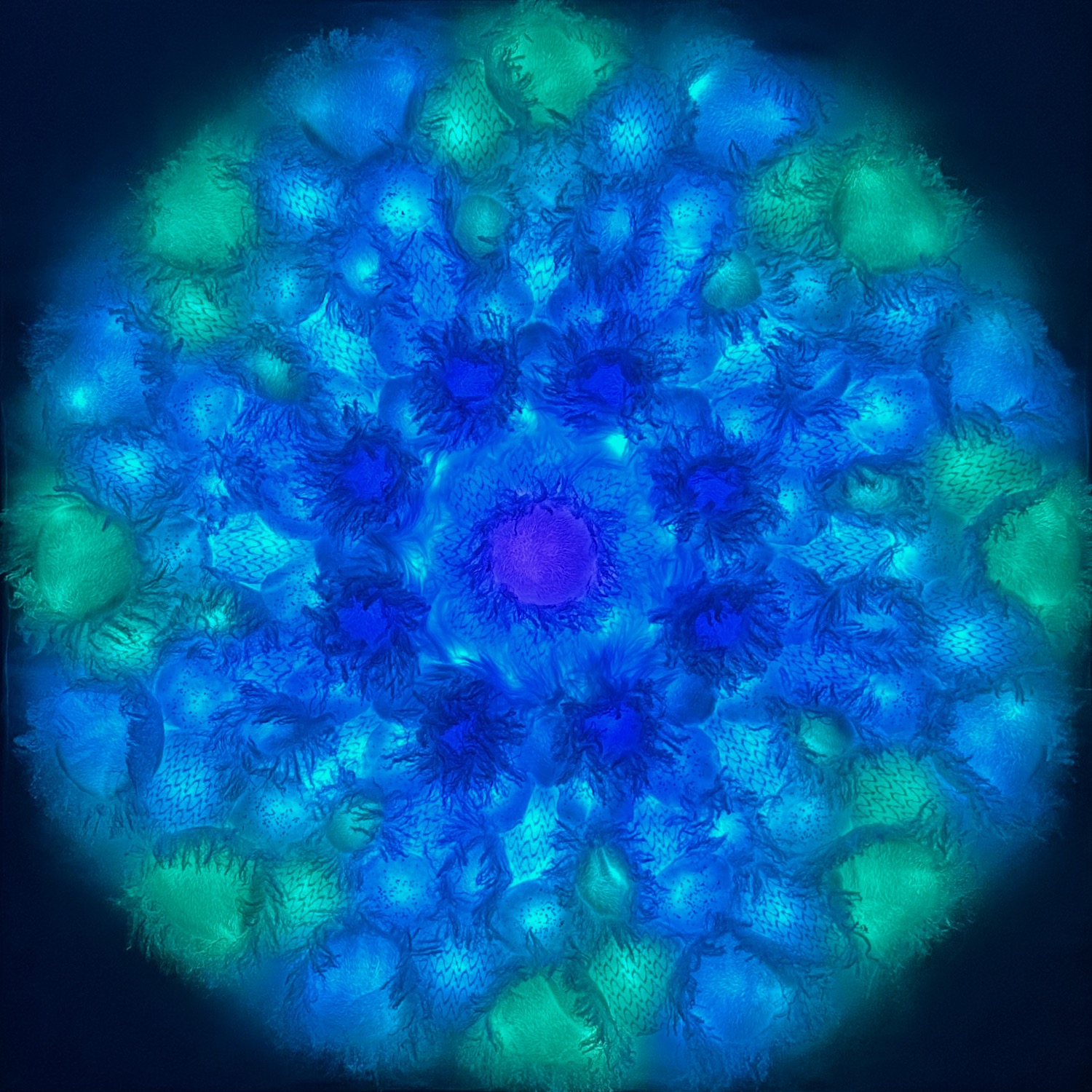 My new piece Framed Comfort 1 was accepted for the show. While the work is abstract, some of the sewn shapes resemble a carpet of sea anemones, and some of the programmed effects are intended to imitate the colors and wave motion of the ocean. It references the ocean theme by using a blue-green color palette for several effects.