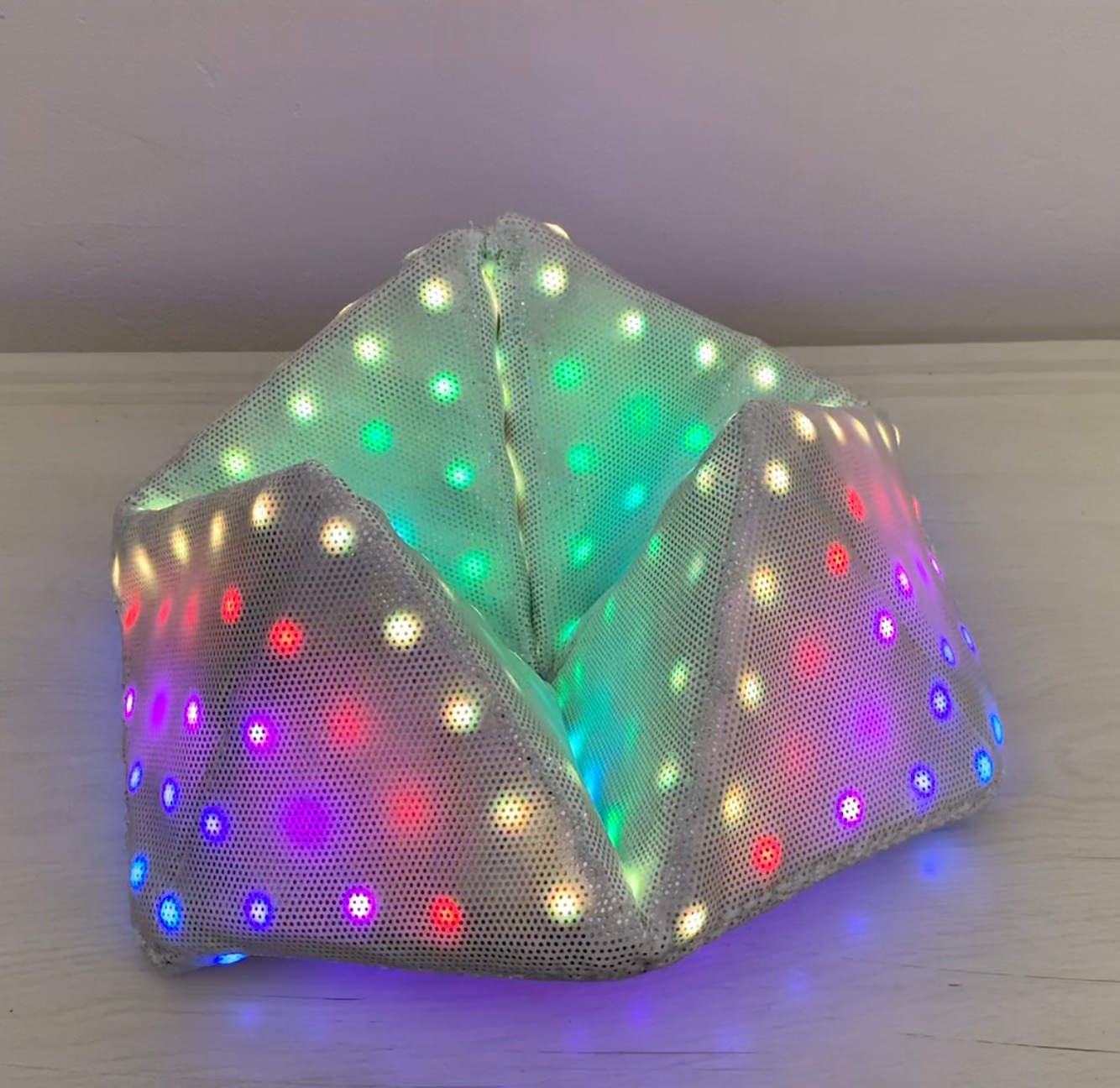 Triangulation (2021) is a soft sculpture made of interconnected triangular shapes, and is also illuminated from within by animated RGB LEDs.