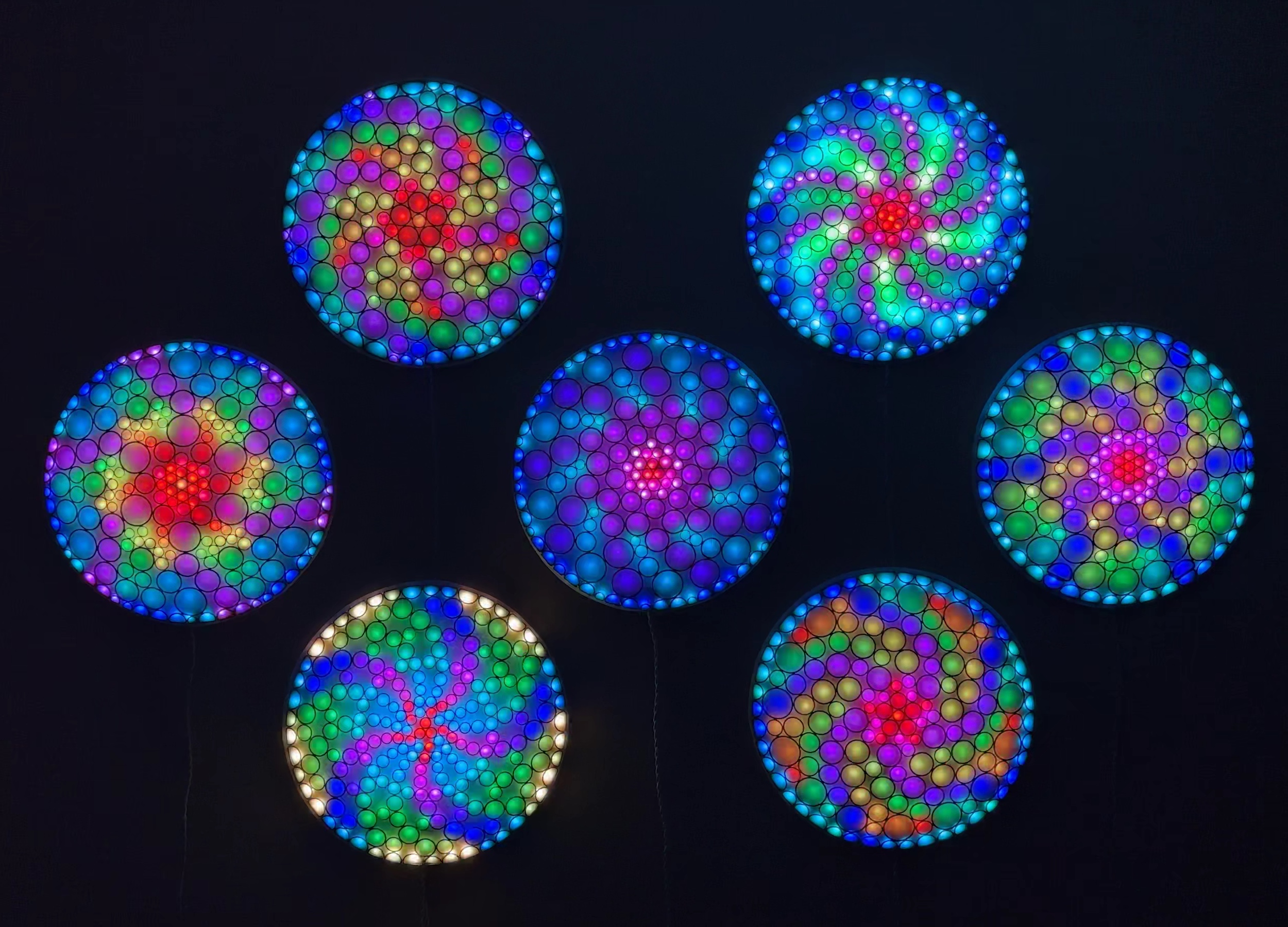 The Illuminated Rings series explores different geometric arrangements of metal rings with embedded animated RGB LED backlighting. These pieces can be enjoyed as individual units, and many can also be displayed as synchronized groups that display a timed sequence of matching effects. The color changes are similar, but the underlying pixel mapping in each piece varies with the type of geometric symmetry within the design. Viewing several pieces simultaneously can help to amplify these differences.