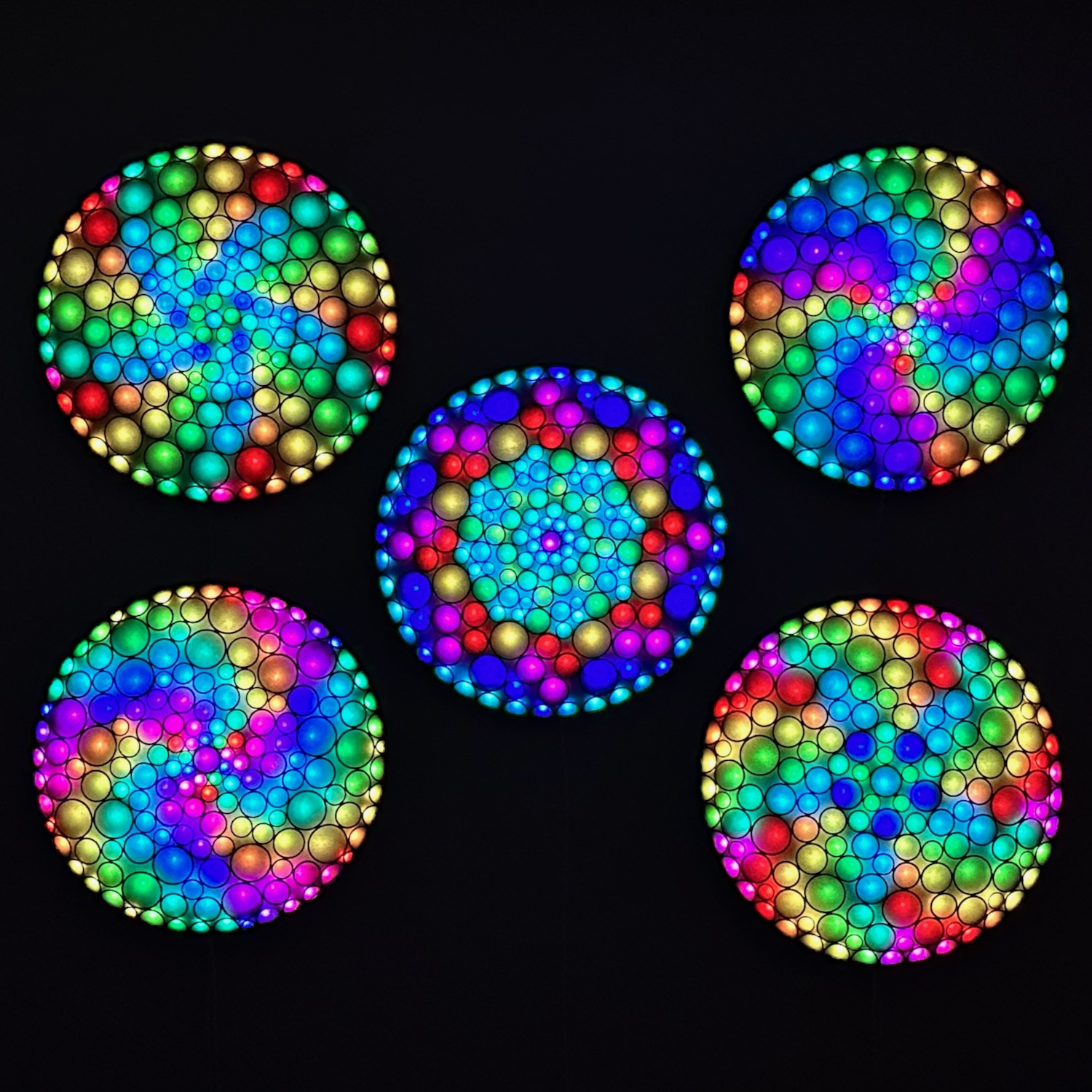The Illuminated Rings series explores different geometric arrangements of metal rings with embedded animated RGB LED backlighting. These pieces can be enjoyed as individual units, and many can also be displayed as synchronized groups that display a timed sequence of matching effects. The color changes are similar, but the underlying pixel mapping in each piece varies with the type of geometric symmetry within the design. Viewing several pieces simultaneously can help to amplify these differences.