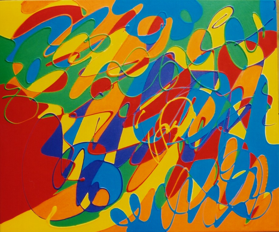 Sometimes I interpret my hard-edge paintings as being symbolic of the times that I "lived in a box”, as a student with a demanding schedule, or as a full-time aerospace engineer that went to work in a cubicle or office every day. Back then, spending my free time working on a canvas with tedious masking and painting steps seemed like a joyful escape. After I started creating custom lighted clothing, I graduated to another level of tedious construction - verifying soldered connections to LEDs and control circuitry, and producing high-quality stitching for all sewn elements. At that point, painting was more fun if it was totally spontaneous and unplanned, so I shifted towards abstract expressionism (the antithesis of hard-edge painting! - see Earth, Rainbow Swirl, Chocolate Swirl). Painting also seemed like a nice way to relax because there was nothing to plug in or turn on at the end. It was just done when the paint dried.