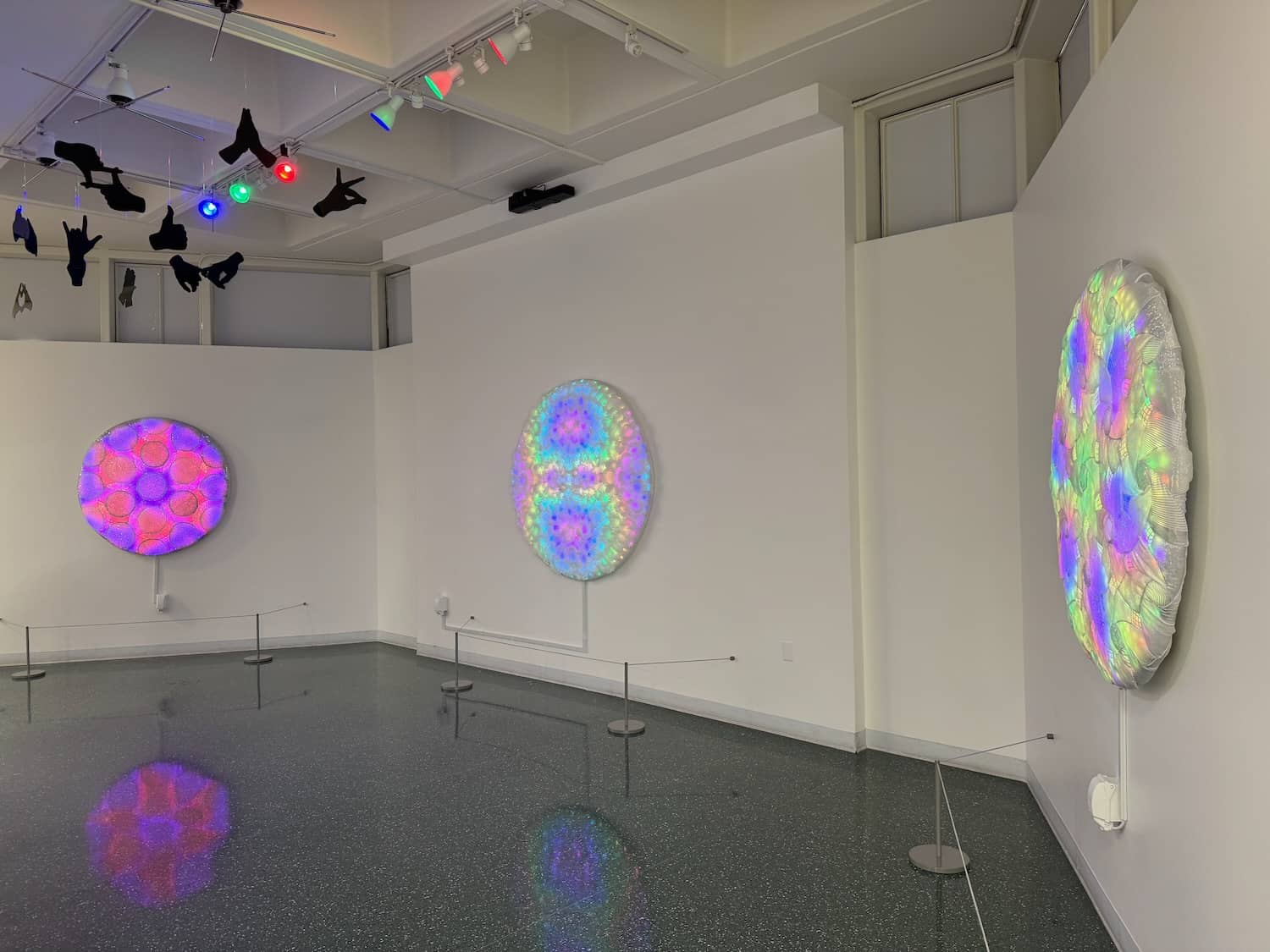 This set of three pieces, entitled Kaleidoscopic Comfort, was created specifically for this location and this exhibition. Additional details for the individual pieces are available on these pages: Kaleidoscopic Comfort 1, Kaleidoscopic Comfort 2, and Kaleidoscopic Comfort 3.