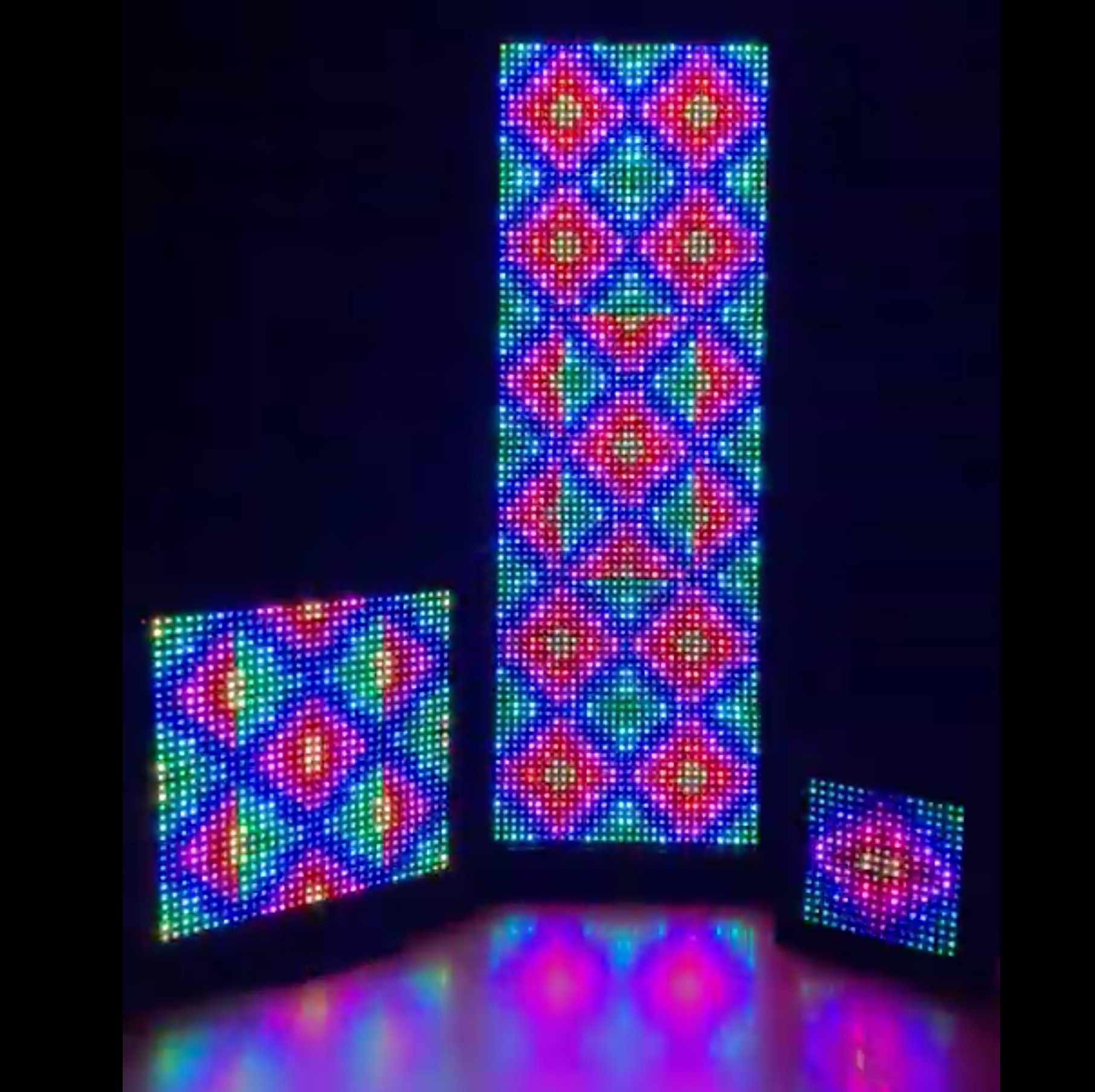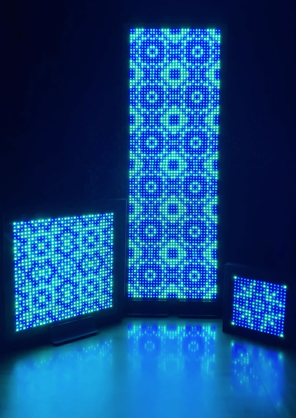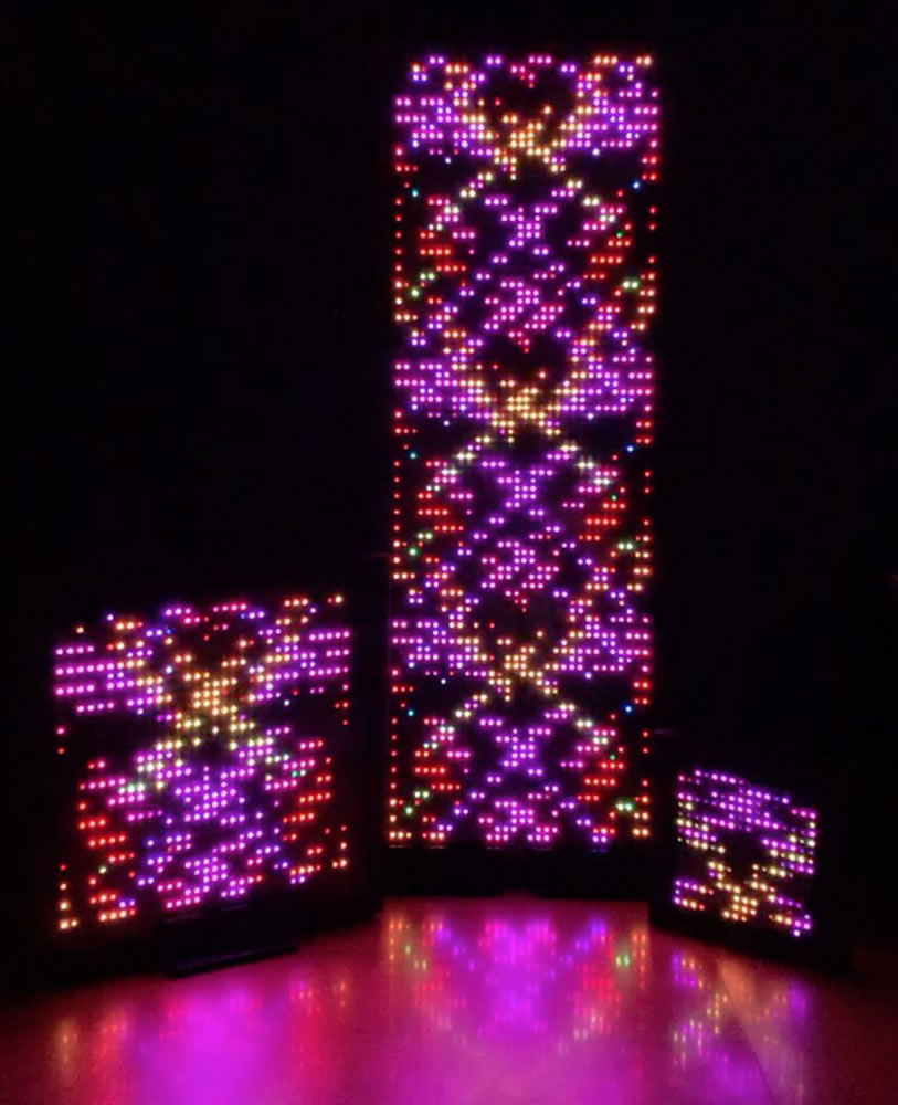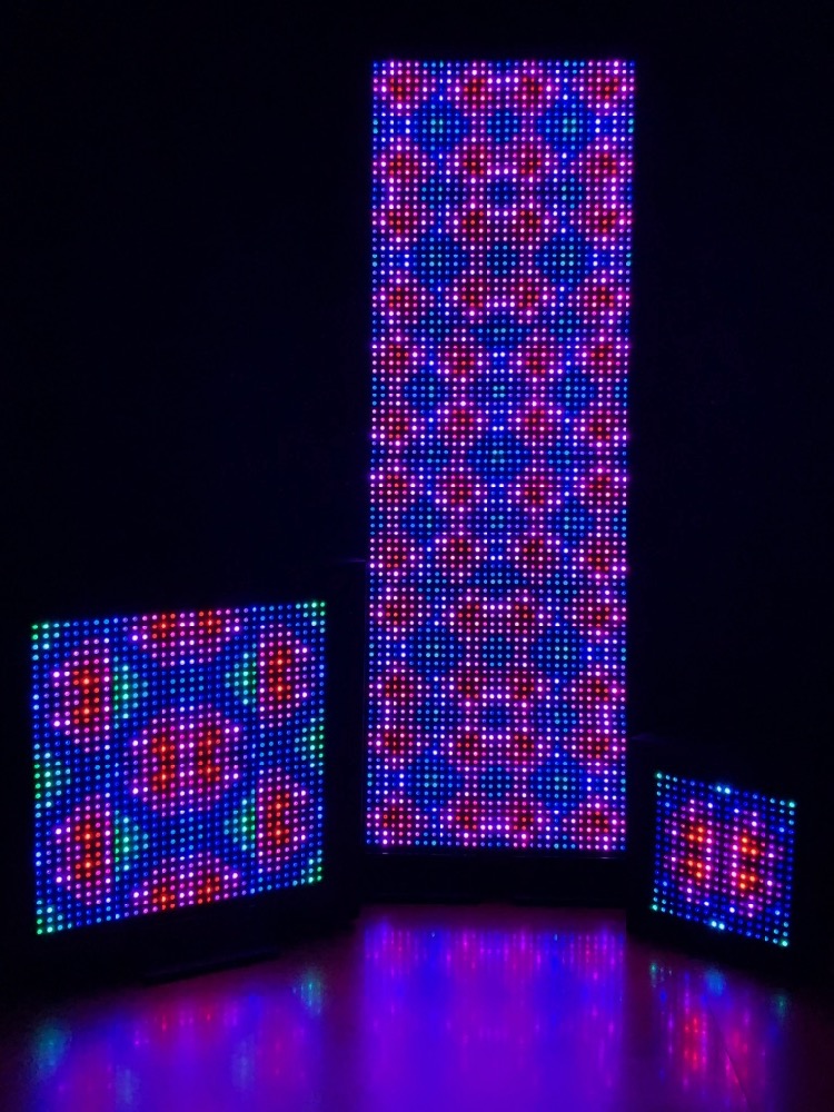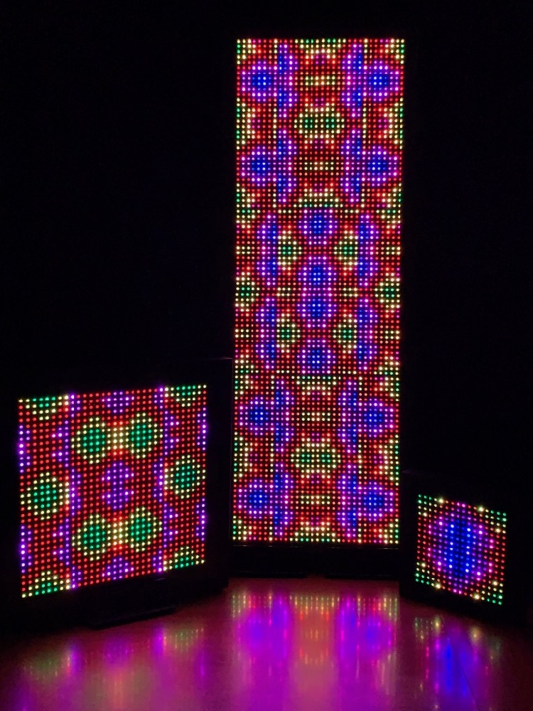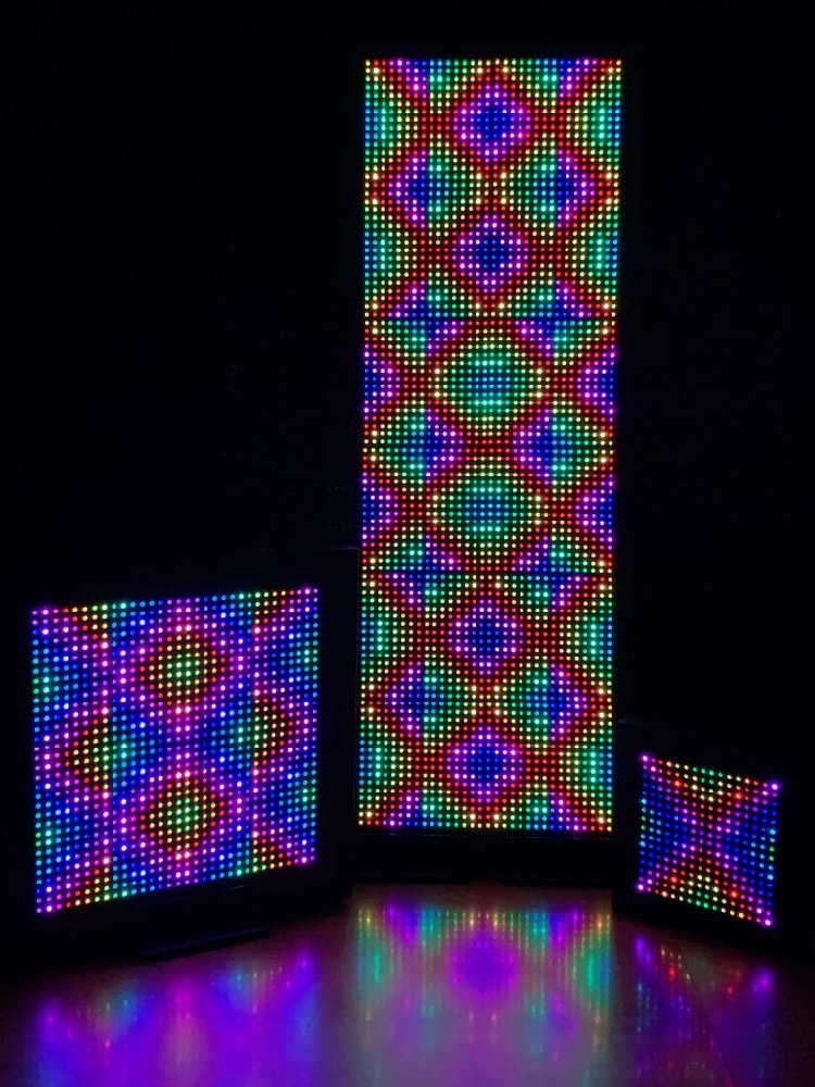 These framed illuminated panels display multi-color geometric patterns that can be customized to match your mood, whether you want a high-energy dance party, or a chill space where you're just relaxing and sitting (and possibly staring). They contain dense grids of individually adressable RGB LED pixels, and are controlled by the same LED drivers that I've developed over the years for my custom lighted clothing, but without the pesky requirements of being flexible, washable, or fitting a specific person.