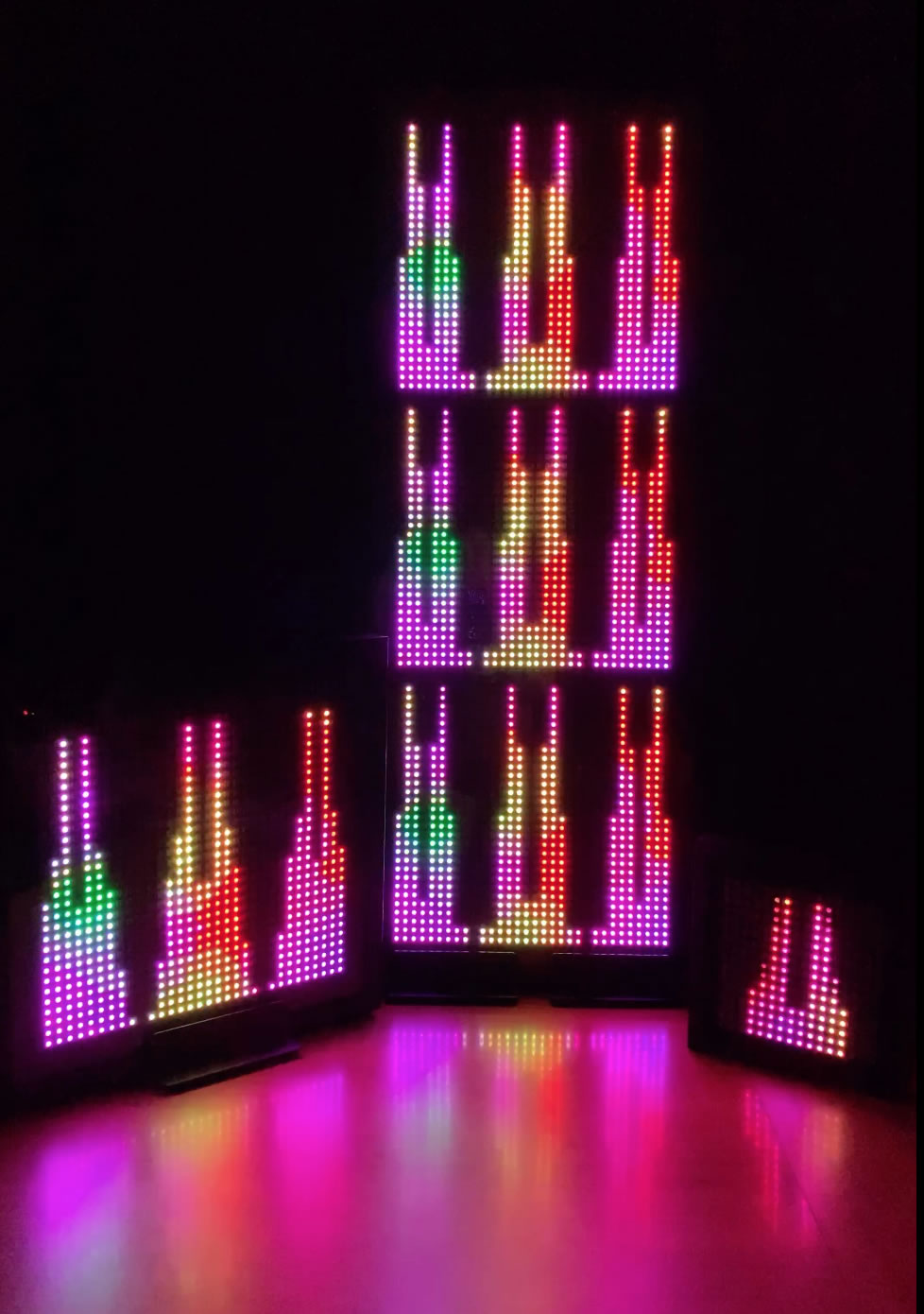 The video below shows the three panel types for Sit 'n Stare 2.0, beginning with a series of sound-reactive effects. The later part of the video (with no sound) shows the modes that do not respond to sound. To sync the panels and have them display similar animation modes at the same time, I am using the Enlighted iOS app, which communicates with a Bluetooth Low Energy (BLE) interface within each panel.