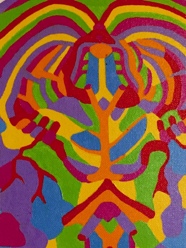 This painting represents the parts of the human brain, painted in a style simlar to Rocket. Colors have been applied to various sections of the brain arbitrarily, with the goal of being visually interesting, and not as a means of showing which parts of the brain are naturally connected.