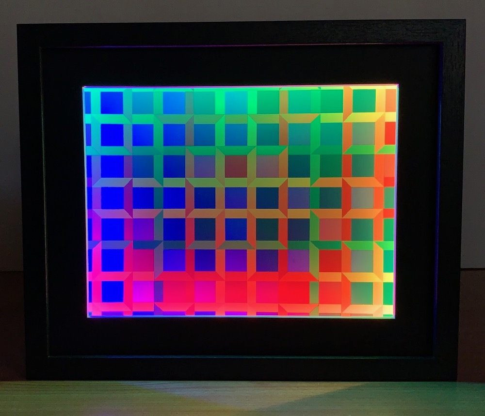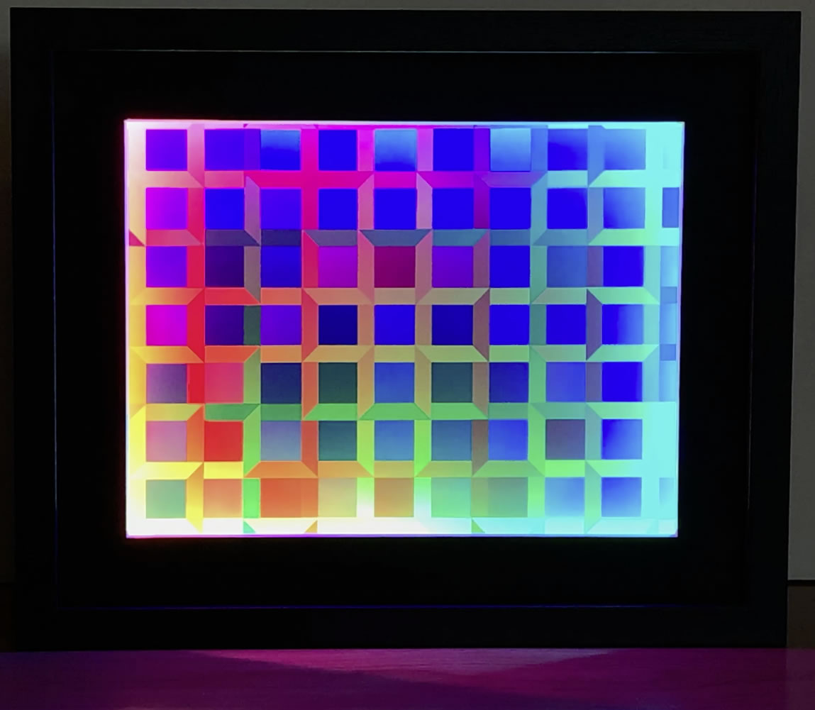 This piece plays with the effects of color-changing light on multi-colored pigments, and combined modern RGB LED illumination techniques with an abstract geometric design created by the artist in 1998 (see Closed Quadrilateral Lattice for information about the original acrylic on canvas version).