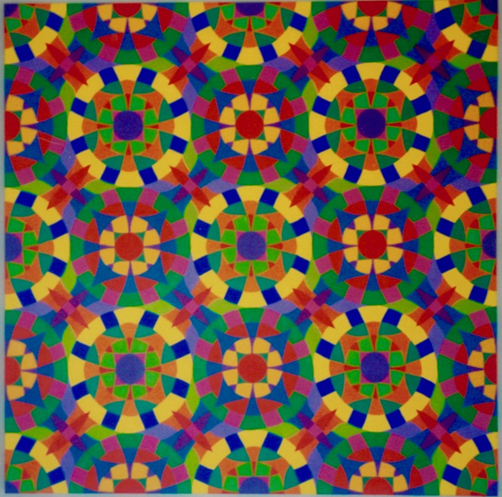 This pattern was constructed from overlapping concentric circles. To obtain more variety in the shapes in the pattern, some of the adjacent regions were merged and painted with the same color. This piece uses the six basic hues of the color wheel, plus intermediates such as yellow-green, blue-green, and magenta.