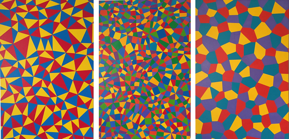 Overall, this piece uses twelve colors spaced equally on the color wheel. The triangulation is filled in with three colors, with no adjacent triangles having the same color. The Voronoi polygons are filled in with four colors. In the center panel, the color of each subdivided region is derived from a combination of the colors used for the same location in the left panel and the right panel. The total number of combinations is 3x4 = 12, the number of colors used.