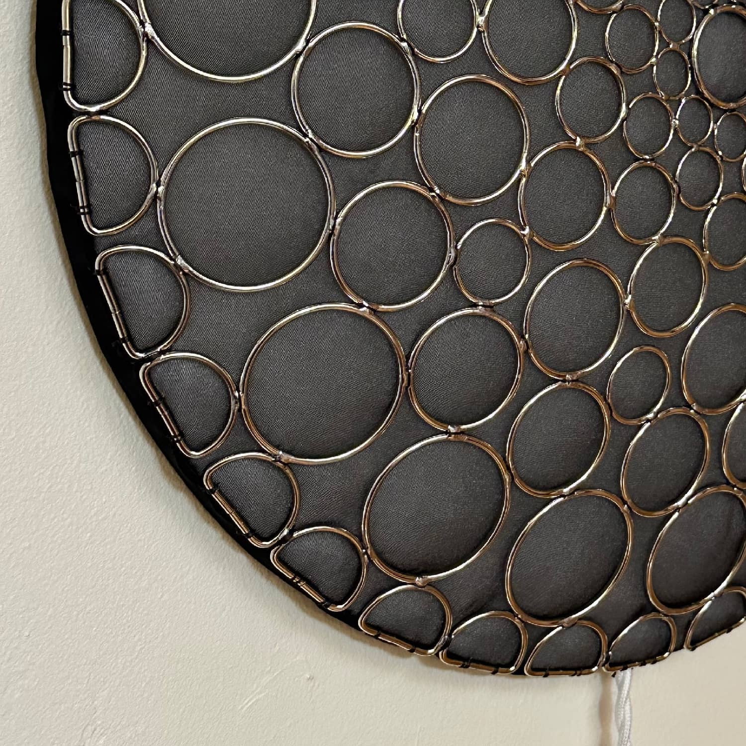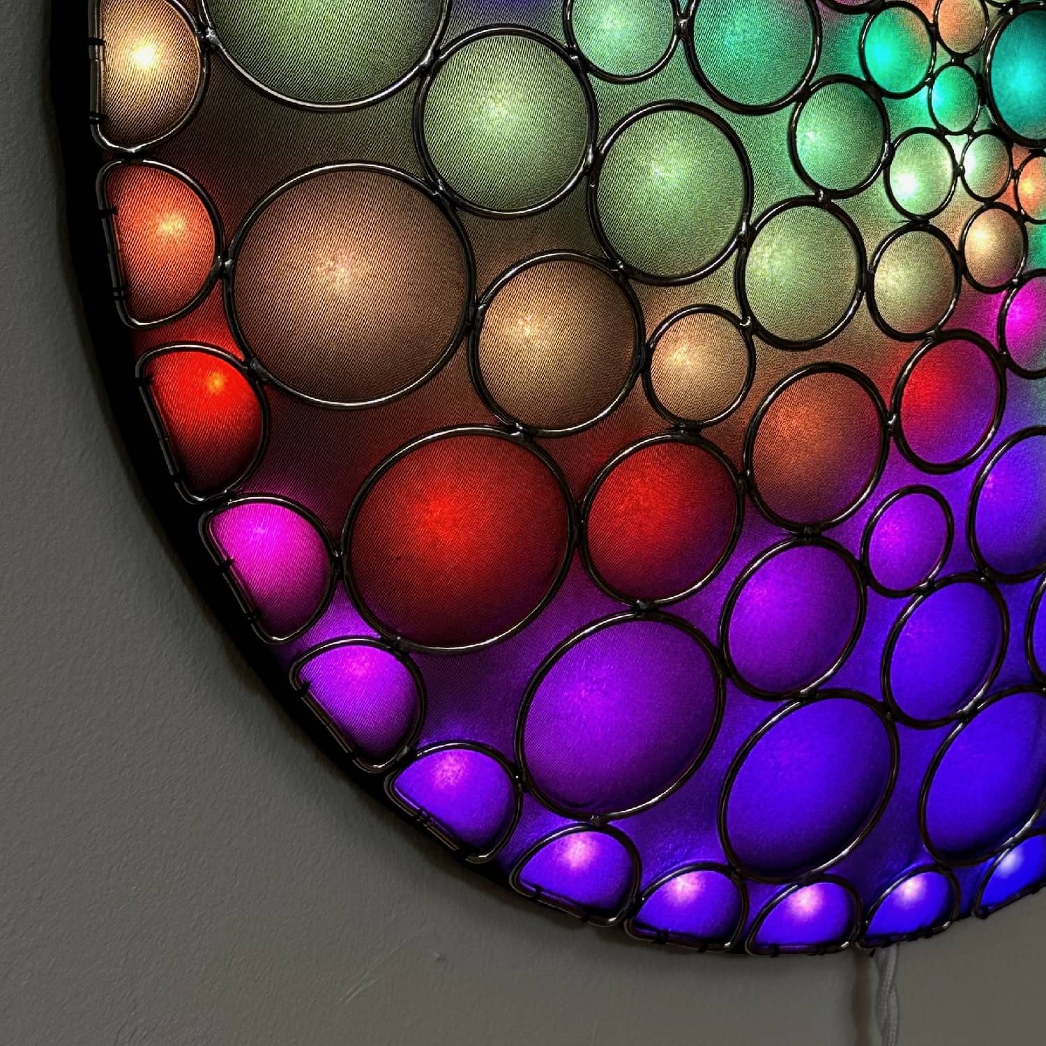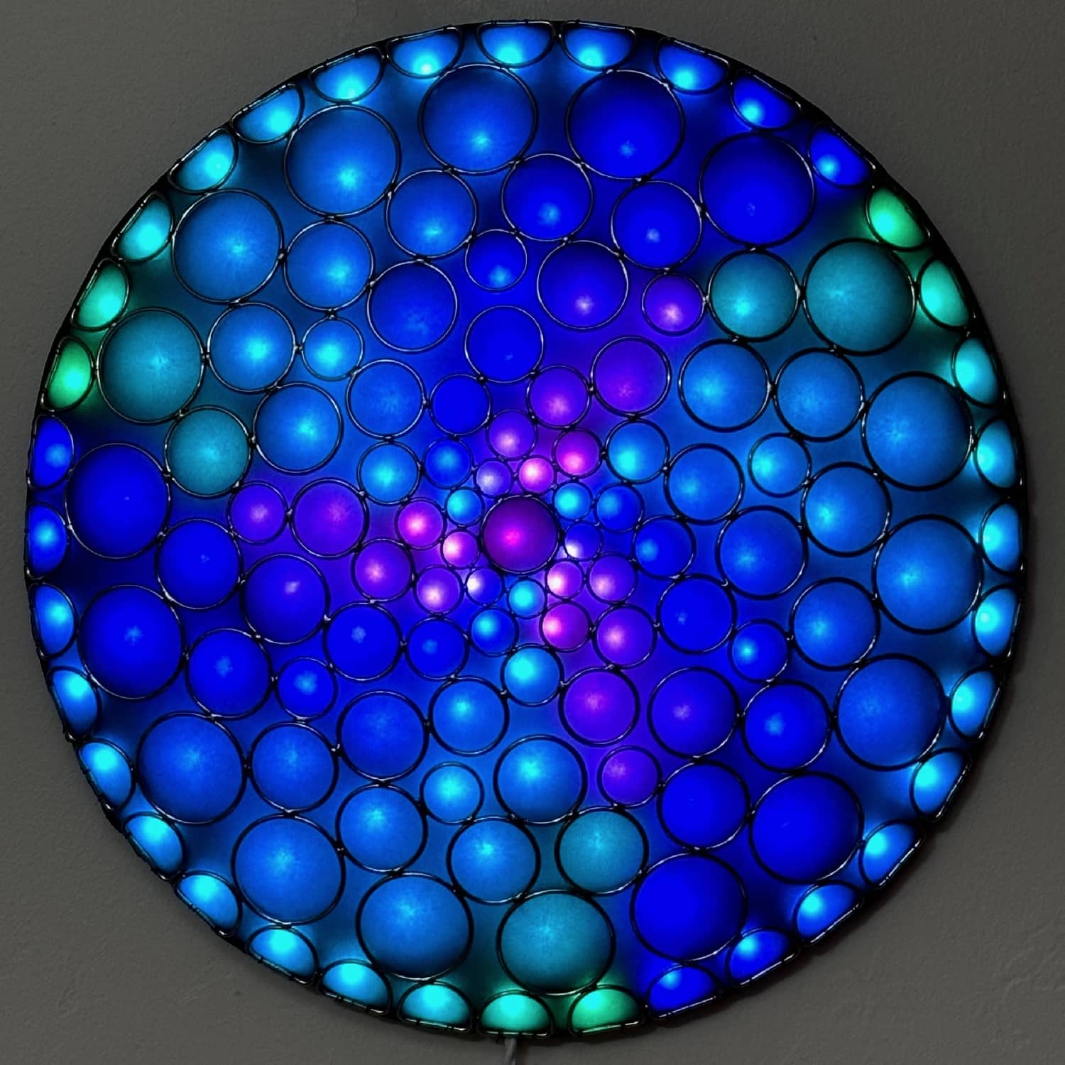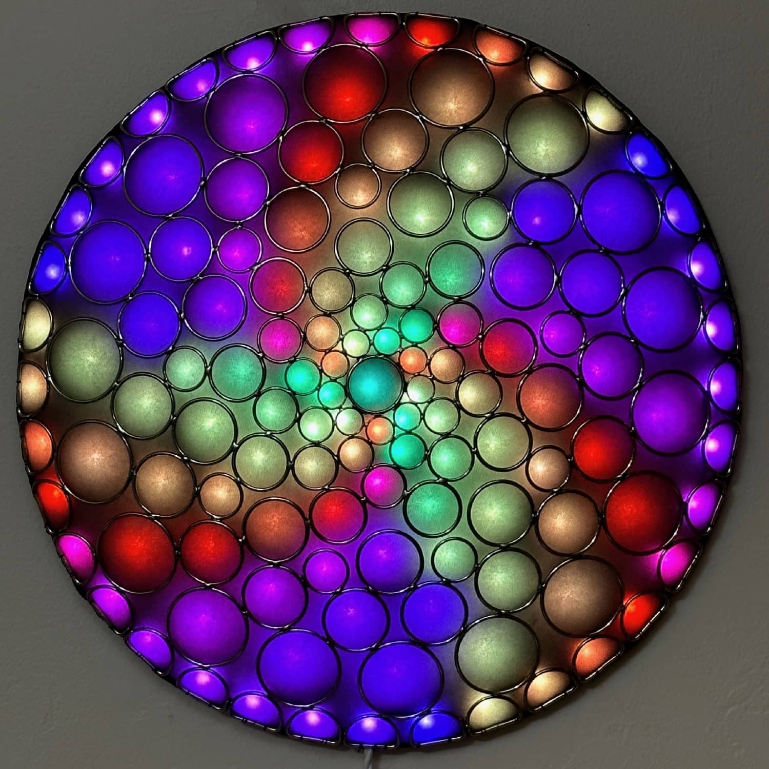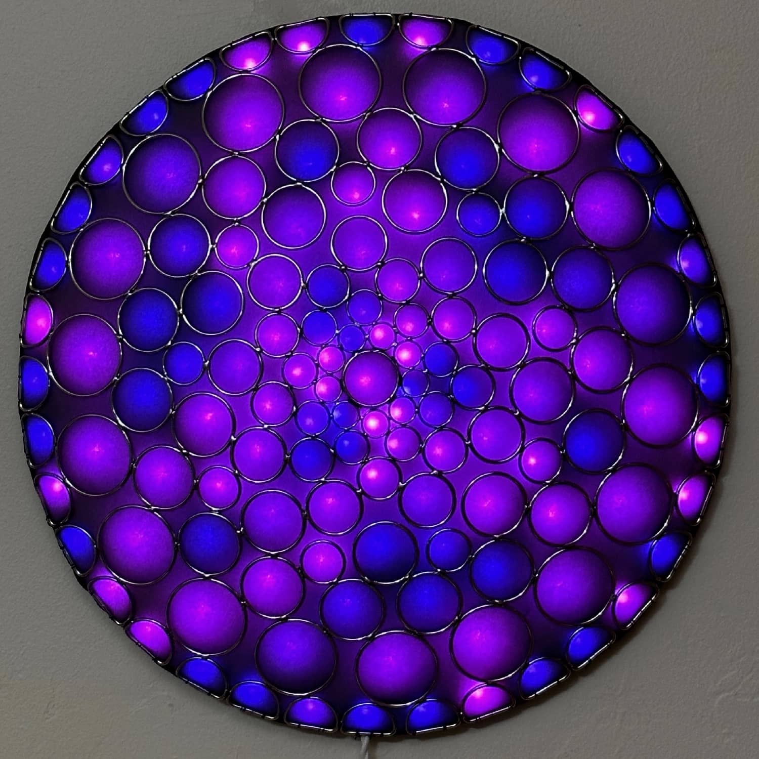 This is part of the Enlighted Rings series of wall-mounted mixed-media art with embedded RGB LEDs. The outermost layer is made with several sizes of silver-colored metal circles and D-rings that have been soldered into a shallow convex dome shape. A fabric diffusing layer is mounted behind the rings, and RGB LED pixels are mounted on an additional internal layer, with one LED aligned with the center of each ring. Some diffused light is also visible through the negative space between rings.