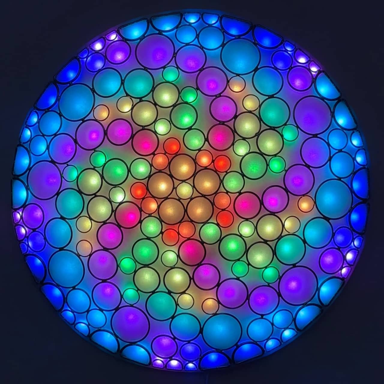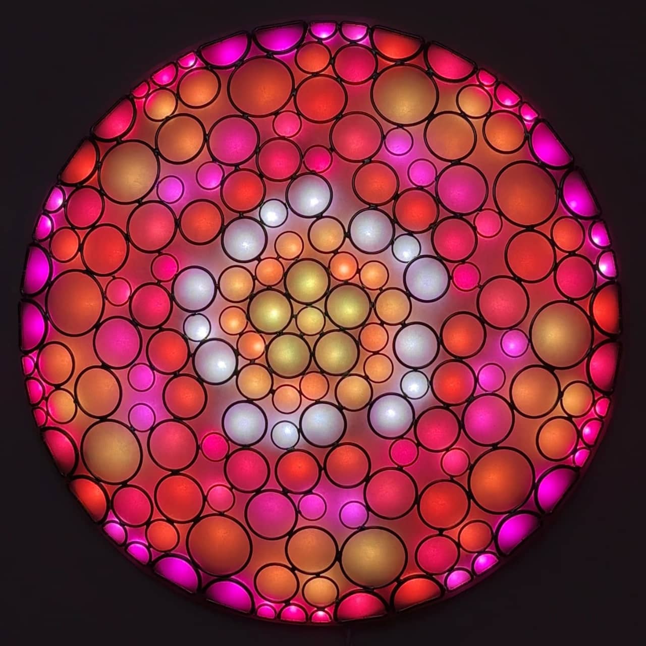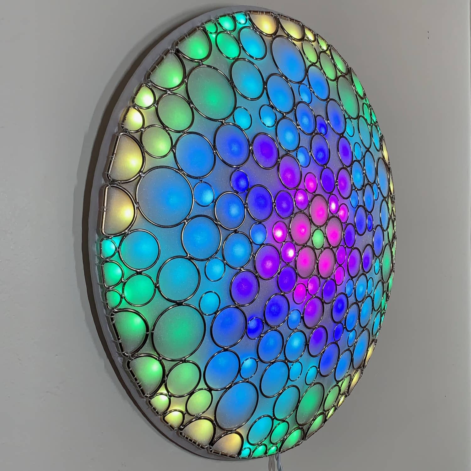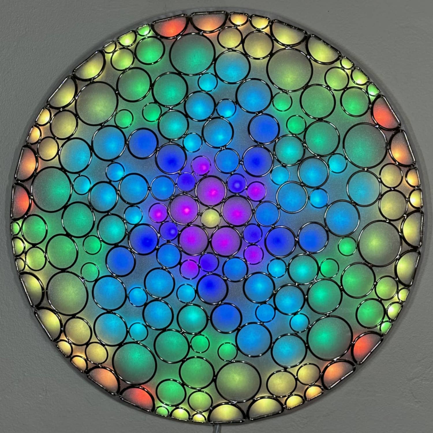 This is part of the Enlighted Rings series of wall-mounted mixed-media art with embedded RGB LEDs. The outermost layer is made with several sizes of silver-colored metal circles and D-rings that have been soldered into a shallow convex dome shape. A fabric diffusing layer is mounted behind the rings, and RGB LED pixels are mounted on an additional internal layer, with one LED aligned with the center of each ring. Some diffused light is also visible through the negative space between rings.