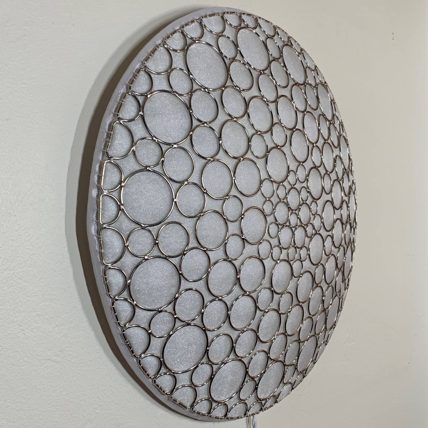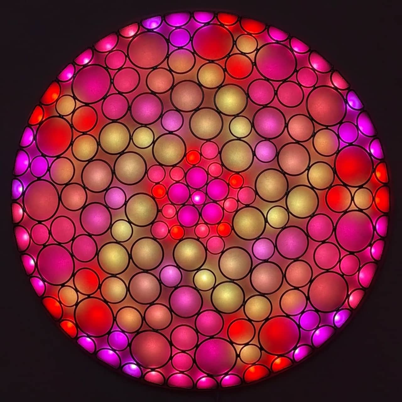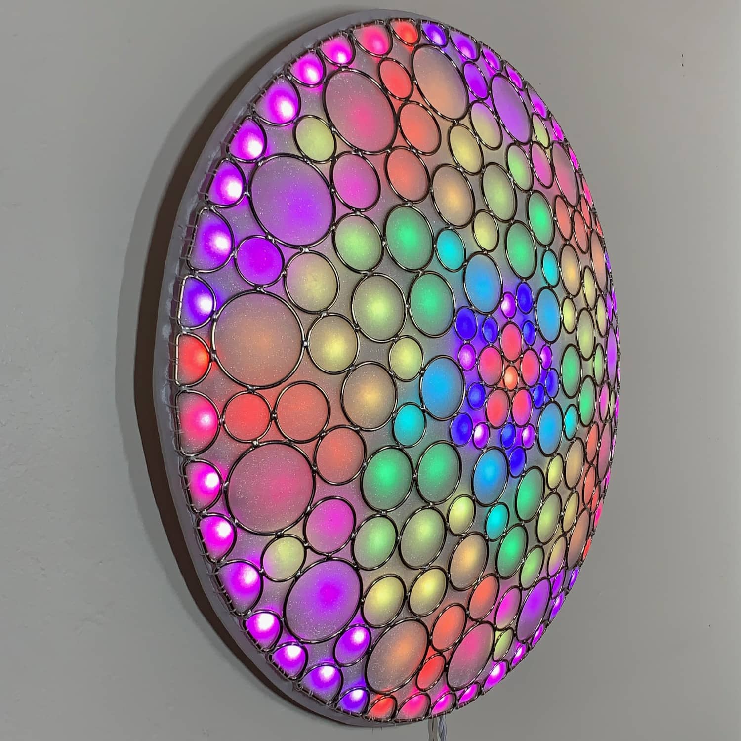 This is part of the Enlighted Rings series of wall-mounted mixed-media art with embedded RGB LEDs. The outermost layer is made with several sizes of silver-colored metal circles and D-rings that have been soldered into a shallow convex dome shape. A fabric diffusing layer is mounted behind the rings, and RGB LED pixels are mounted on an additional internal layer, with one LED aligned with the center of each ring. Some diffused light is also visible through the negative space between rings.