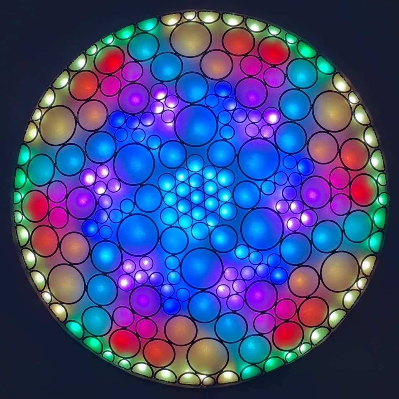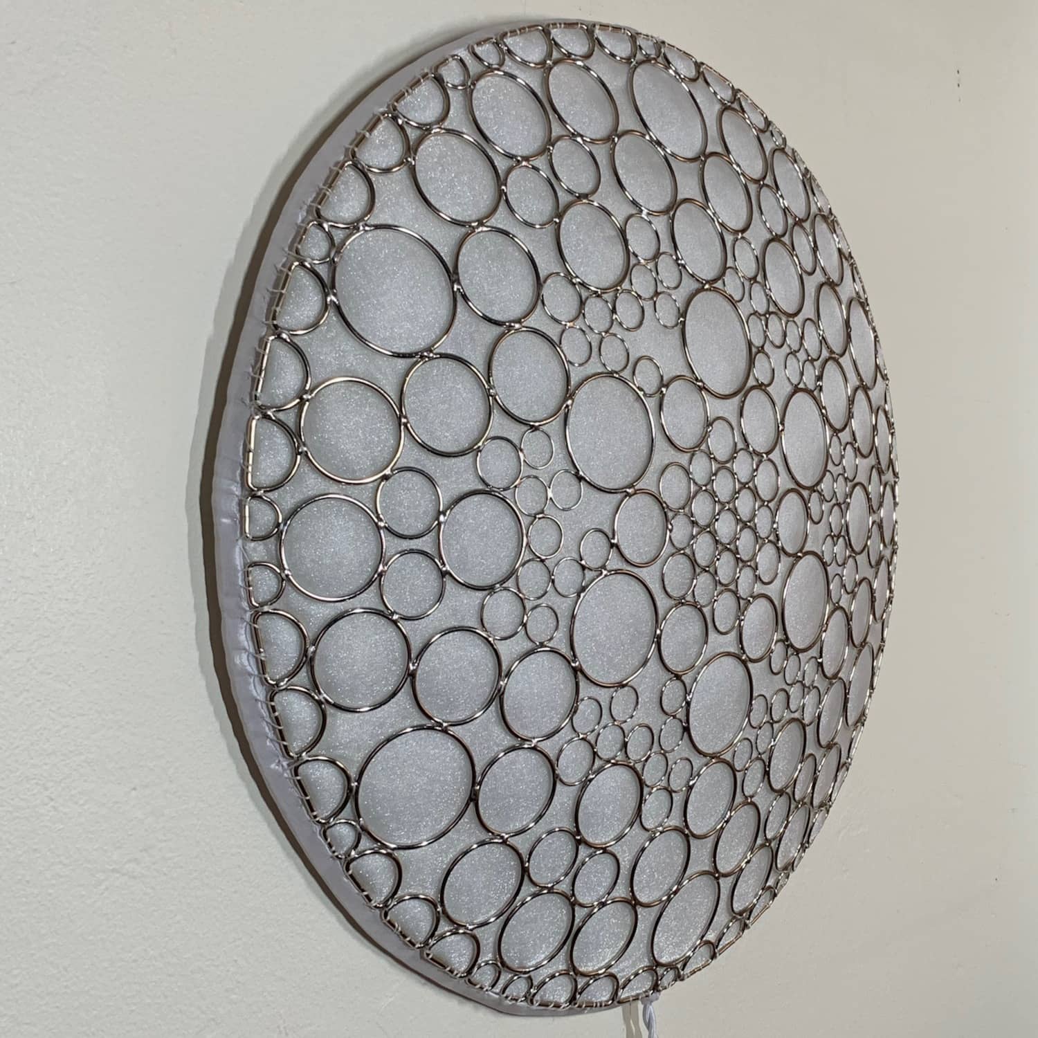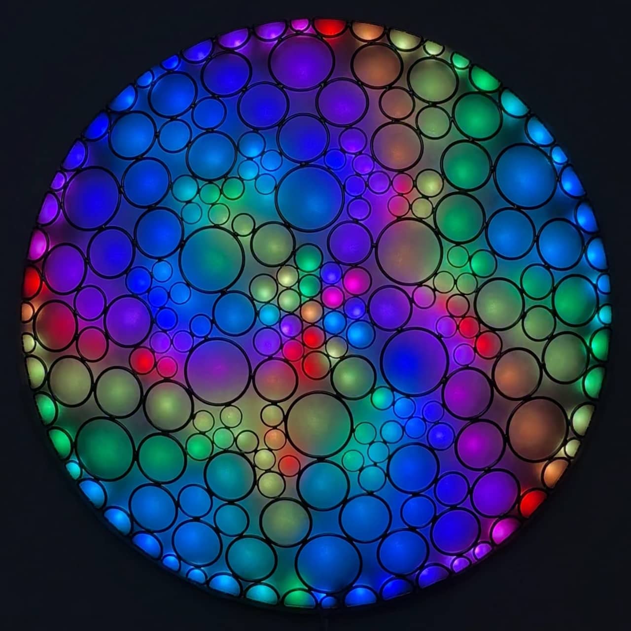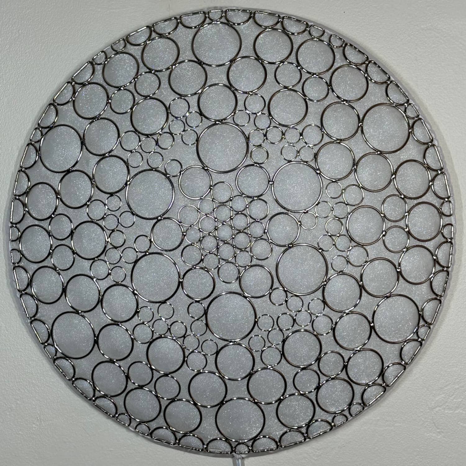 This is part of the Enlighted Rings series of wall-mounted mixed-media art with embedded RGB LEDs. The outermost layer is made with several sizes of silver-colored metal circles and D-rings that have been soldered into a shallow convex dome shape. A fabric diffusing layer is mounted behind the rings, and RGB LED pixels are mounted on an additional internal layer, with one LED aligned with the center of each ring. Some diffused light is also visible through the negative space between rings.