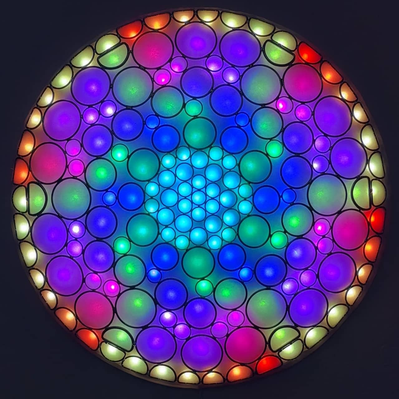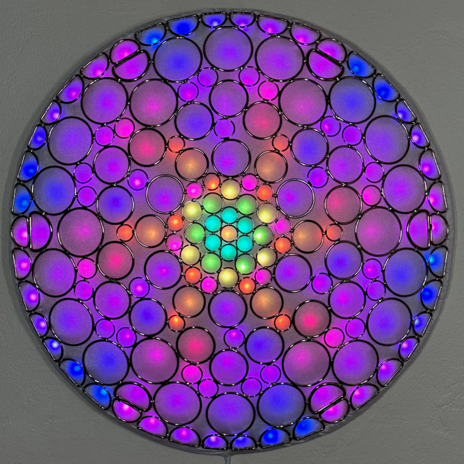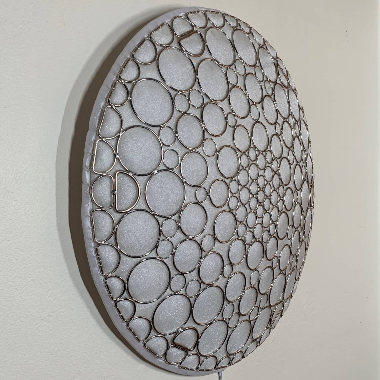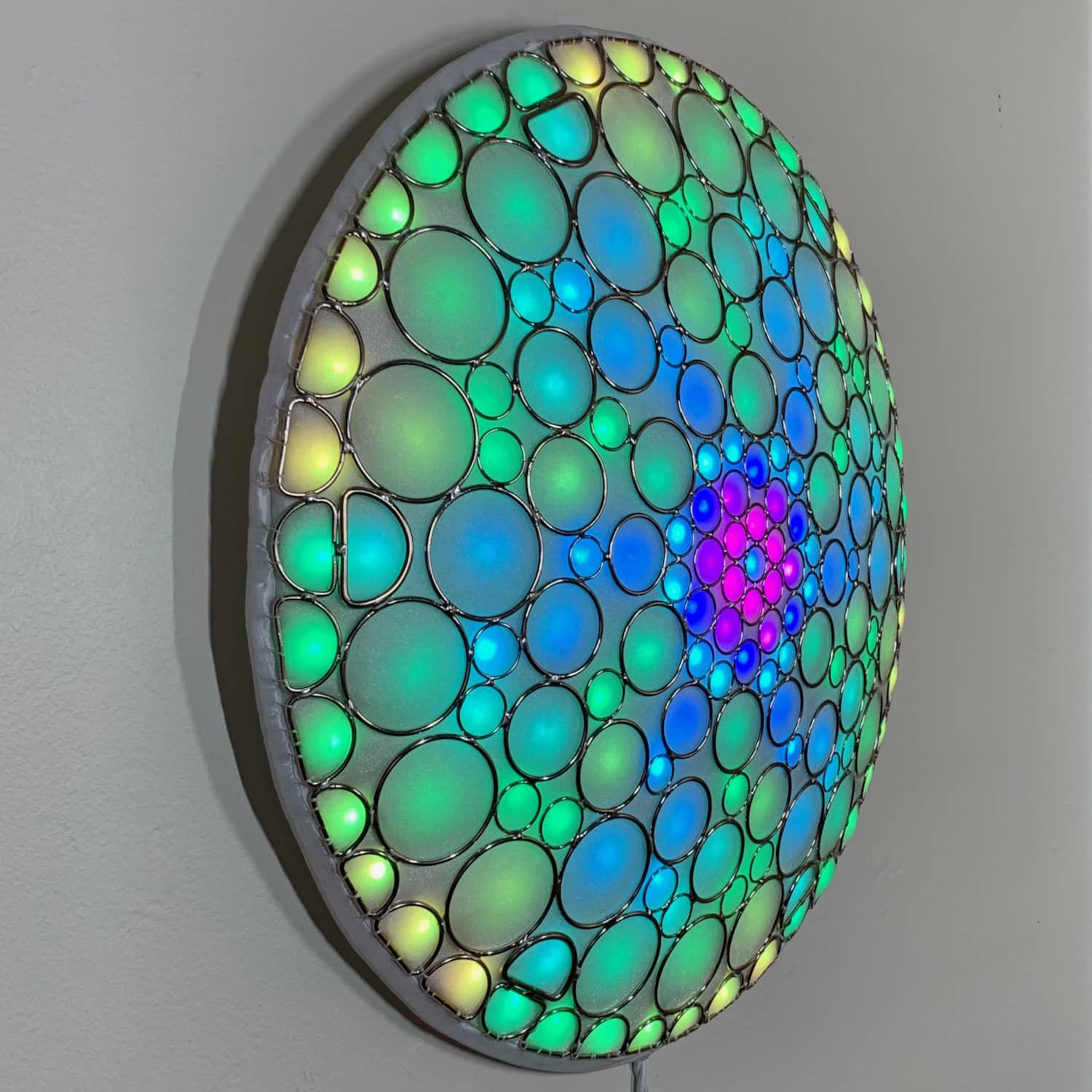 This is part of the Enlighted Rings series of wall-mounted mixed-media art with embedded RGB LEDs. The outermost layer is made with several sizes of silver-colored metal circles and D-rings that have been soldered into a shallow convex dome shape. A fabric diffusing layer is mounted behind the rings, and RGB LED pixels are mounted on an additional internal layer, with one LED aligned with the center of each ring. Some diffused light is also visible through the negative space between rings.