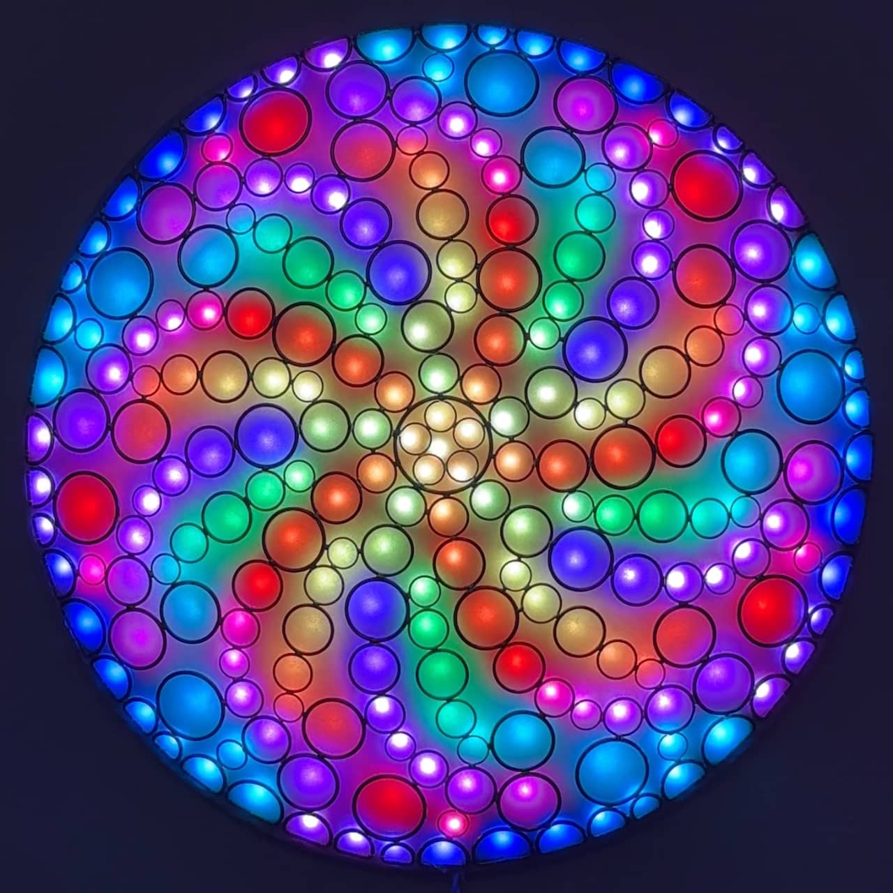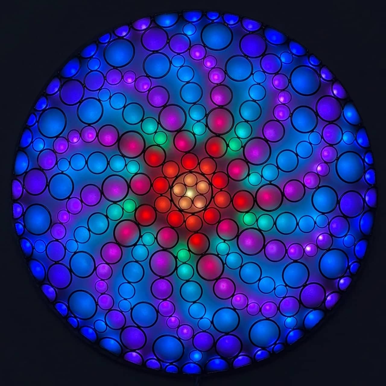 The lights filling the circle are arranged with five-way (and sometimes 10-way) symmetry, and are animated with repeating color sequences that produce a variety of hypnotic patterns and optical illusions.