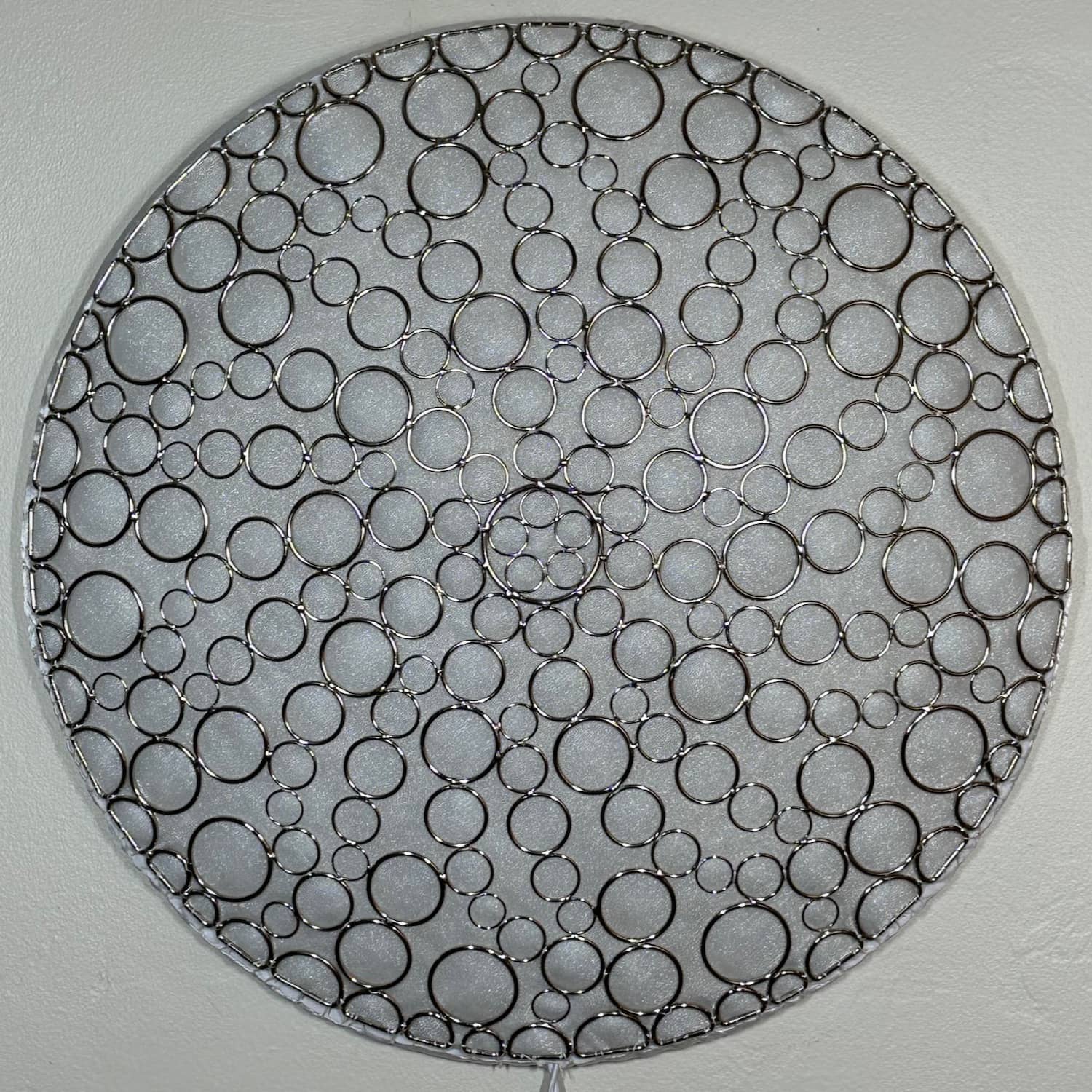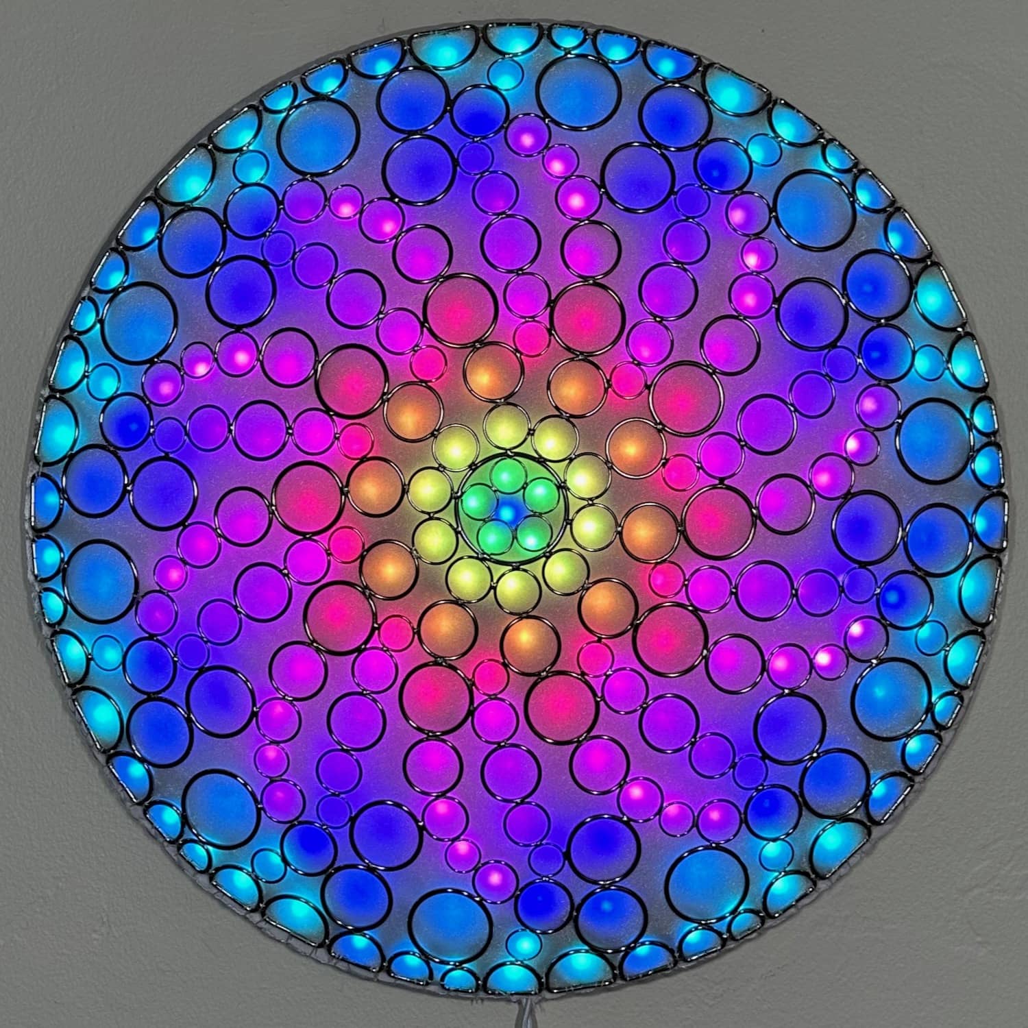 This is part of the Enlighted Rings series of wall-mounted mixed-media art with embedded RGB LEDs. The outermost layer is made with several sizes of silver-colored metal circles and D-rings that have been soldered into a shallow convex dome shape. A fabric diffusing layer is mounted behind the rings, and RGB LED pixels are mounted on an additional internal layer, with one LED aligned with the center of each ring. Some diffused light is also visible through the negative space between rings.