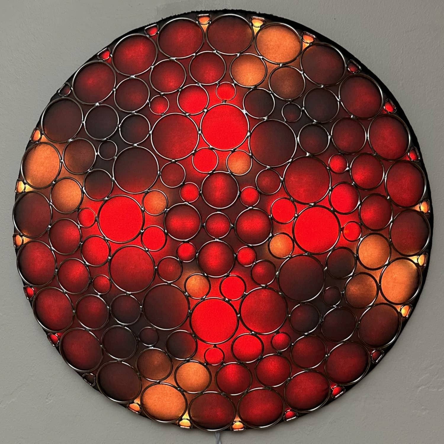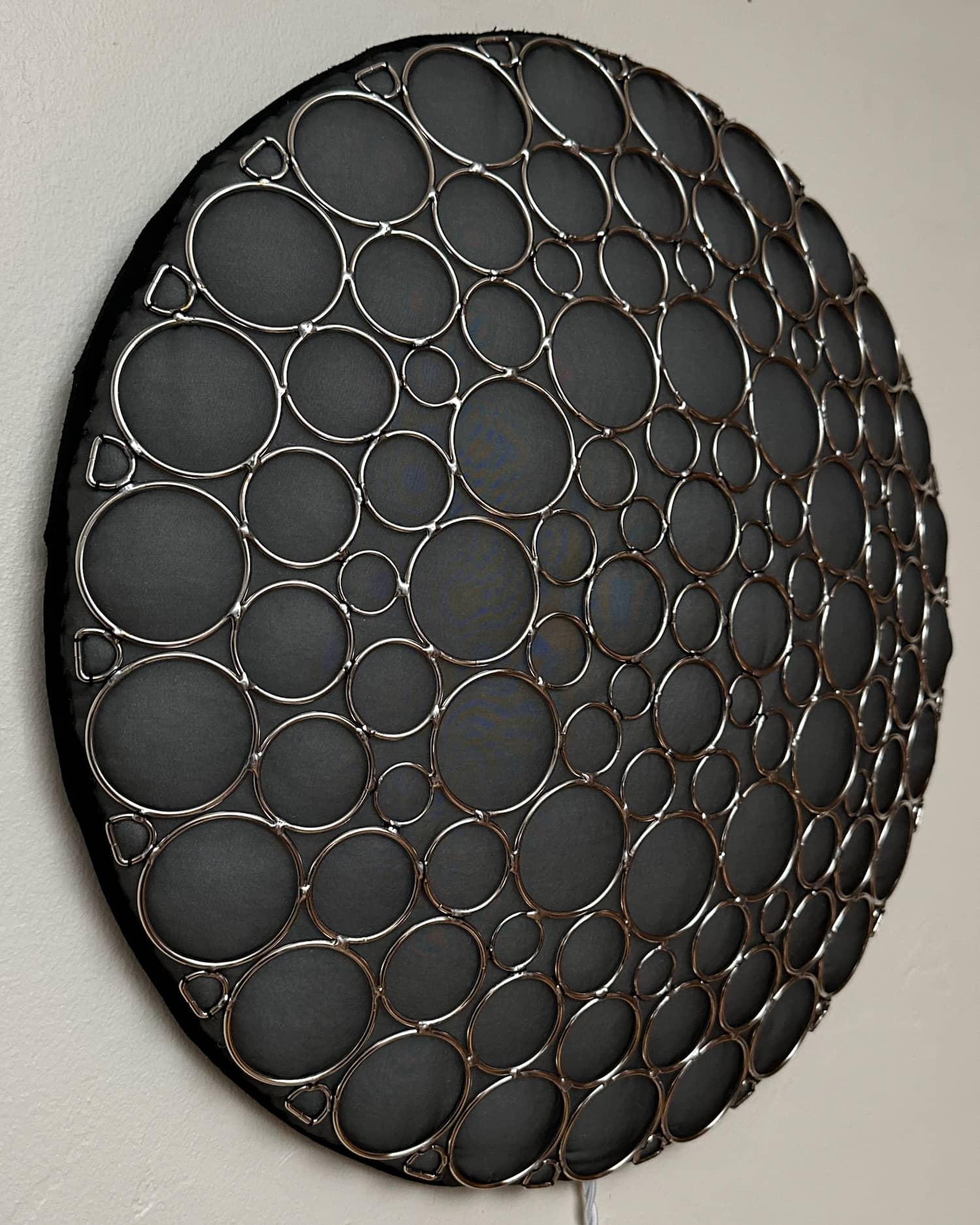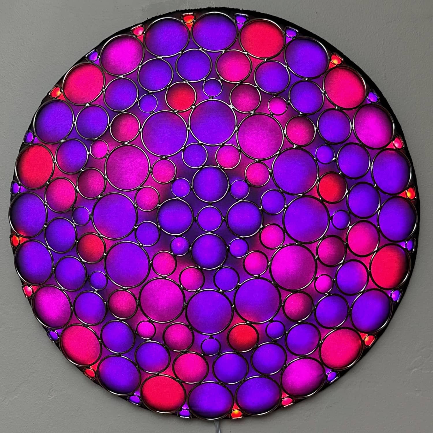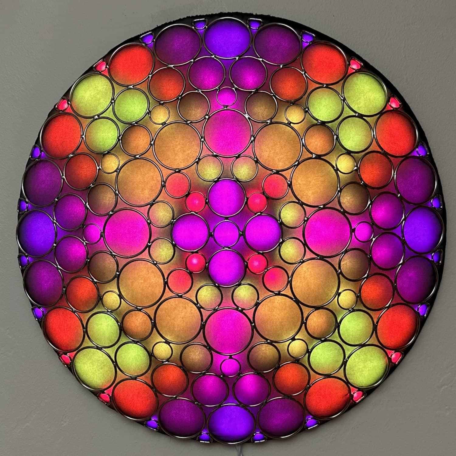 This is part of the Enlighted Rings series of wall-mounted mixed-media art with embedded RGB LEDs. The outermost layer is made with several sizes of silver-colored metal circles and D-rings that have been soldered into a shallow convex dome shape. A fabric diffusing layer is mounted behind the rings, and RGB LED pixels are mounted on an additional internal layer, with one LED aligned with the center of each ring. Some diffused light is also visible through the negative space between rings.
