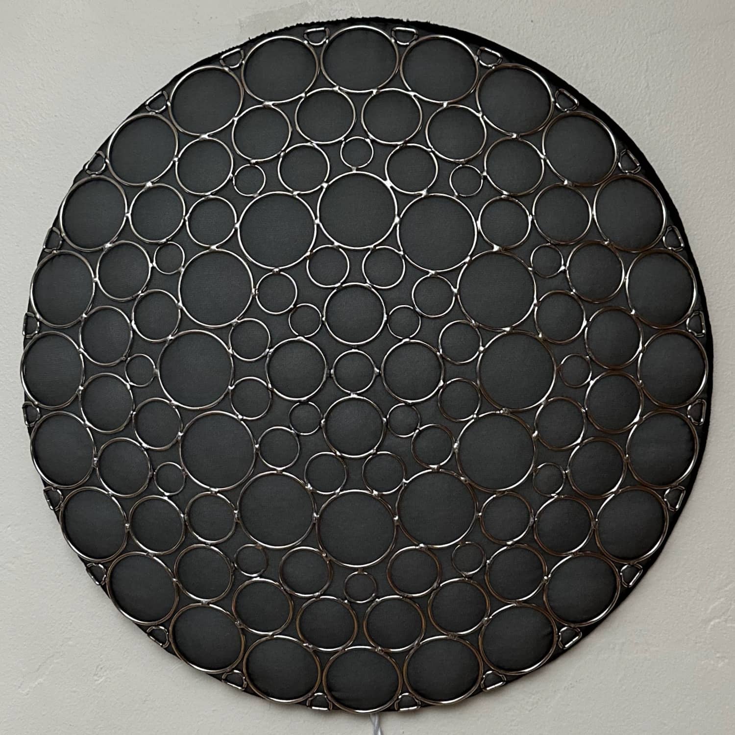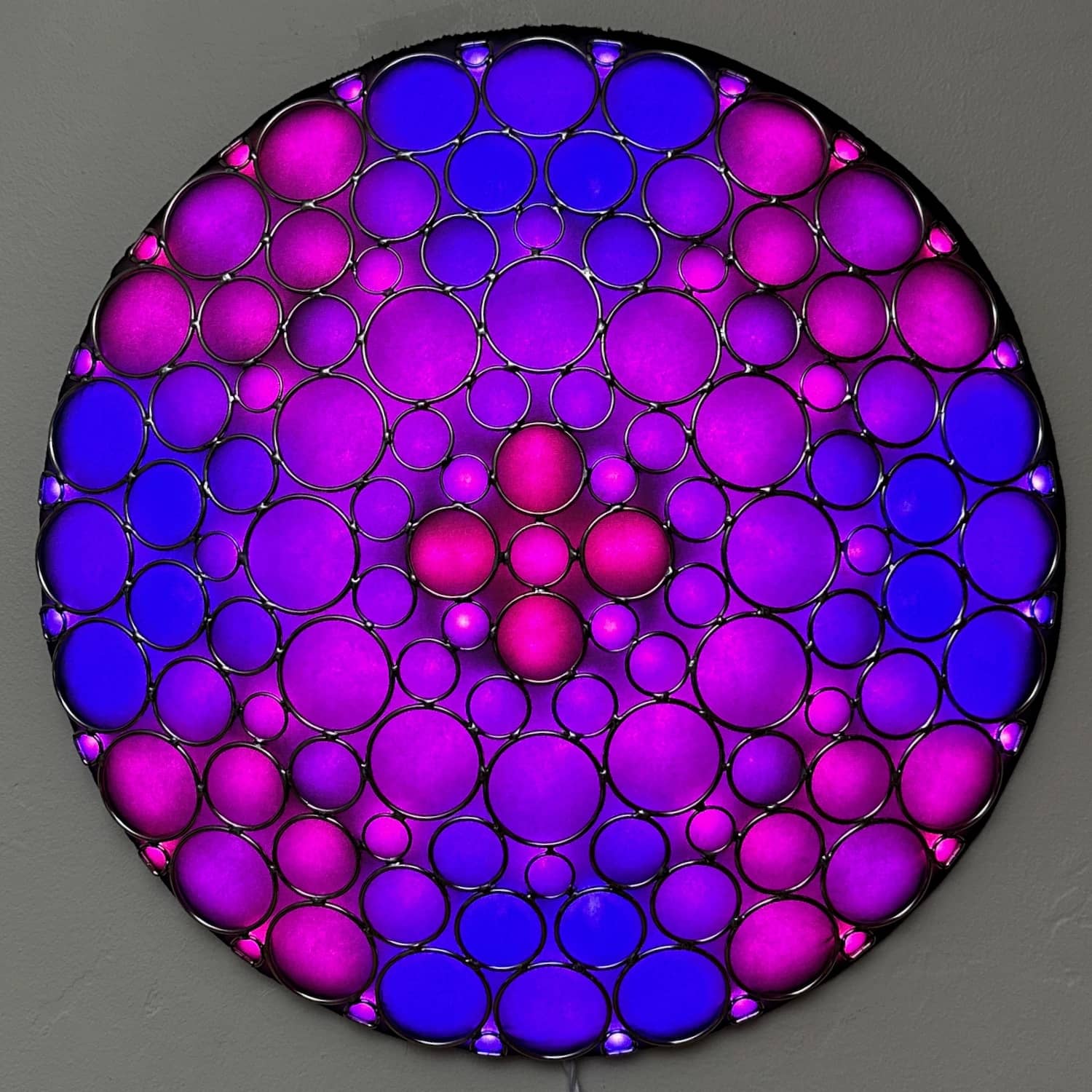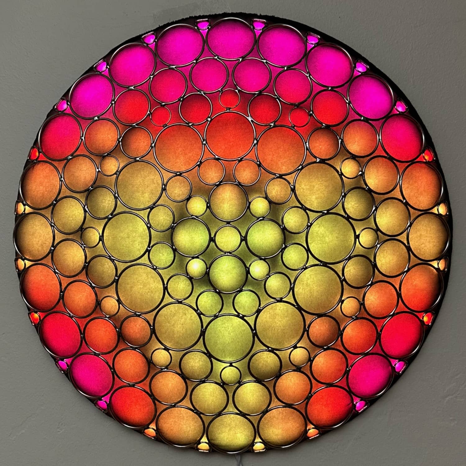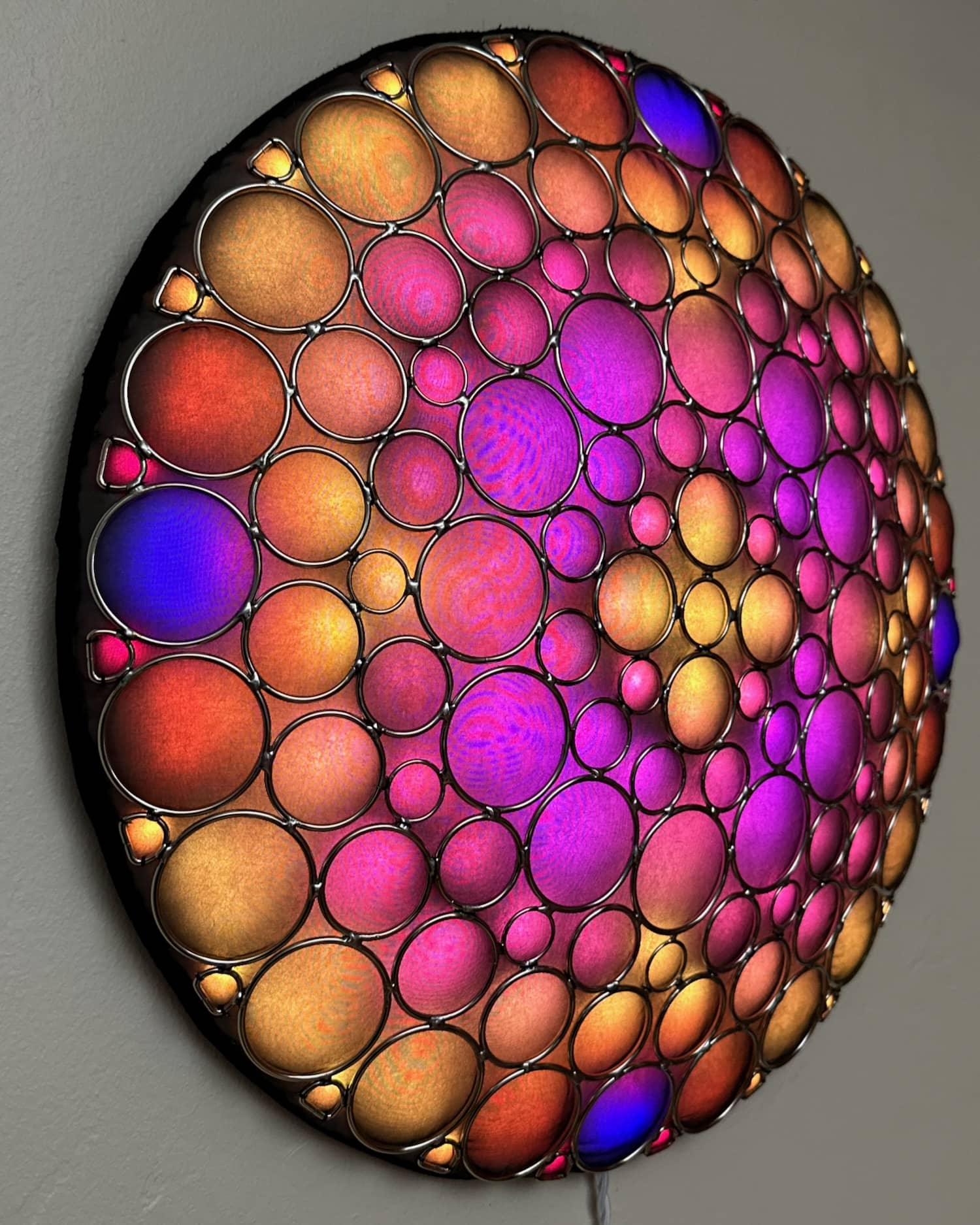 This is part of the Enlighted Rings series of wall-mounted mixed-media art with embedded RGB LEDs. The outermost layer is made with several sizes of silver-colored metal circles and D-rings that have been soldered into a shallow convex dome shape. A fabric diffusing layer is mounted behind the rings, and RGB LED pixels are mounted on an additional internal layer, with one LED aligned with the center of each ring. Some diffused light is also visible through the negative space between rings.