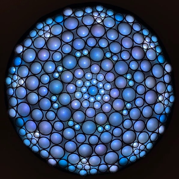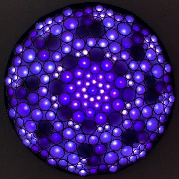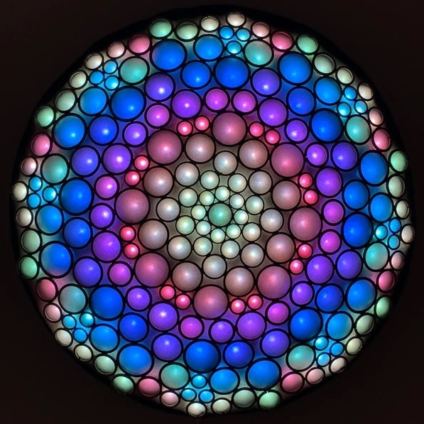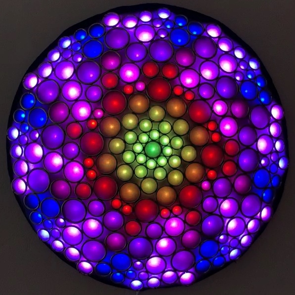 The RGB LED pixels are mounted behind the rings, with one LED near the center of each ring. A layer of black organza and diffusing material lies above the LEDs but behind the steel rings, to partially smooth out the hot spots. Some diffused light is also visible through the negative space between rings.