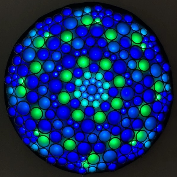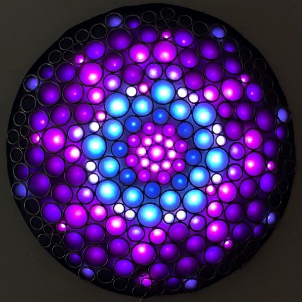 The LEDs are animated in a variety of hypnotic patterns. By default, it will cycle between these patterns when it is first powered up. It can also be set to play one of the patterns continuously, with a built-in mode switch on the back panel. This piece can also be controlled wirelessly with the Enlighted iOS BLE App.