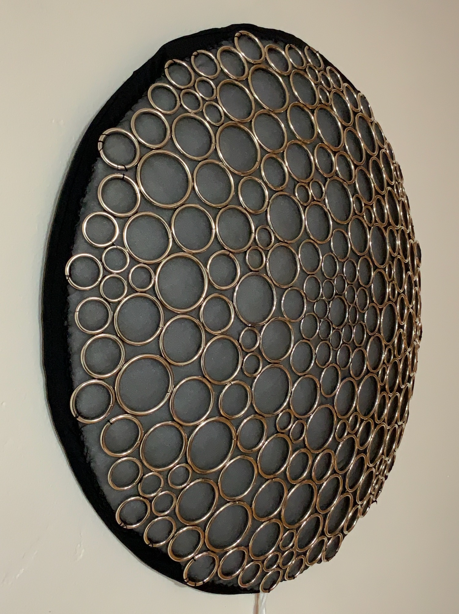 This piece is round, but arches out in the center in a shallow convex dome shape. The outermost layer is made of silver-colored soldered metal rings, and provides most of the structure. The rings are slightly different sizes, and fill in the dome with an 8-way repeating pattern. The back panel is covered in black fabric.