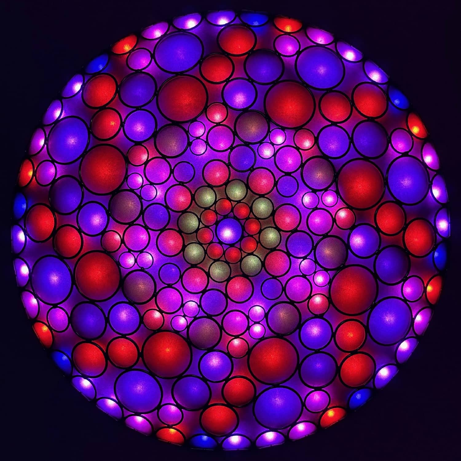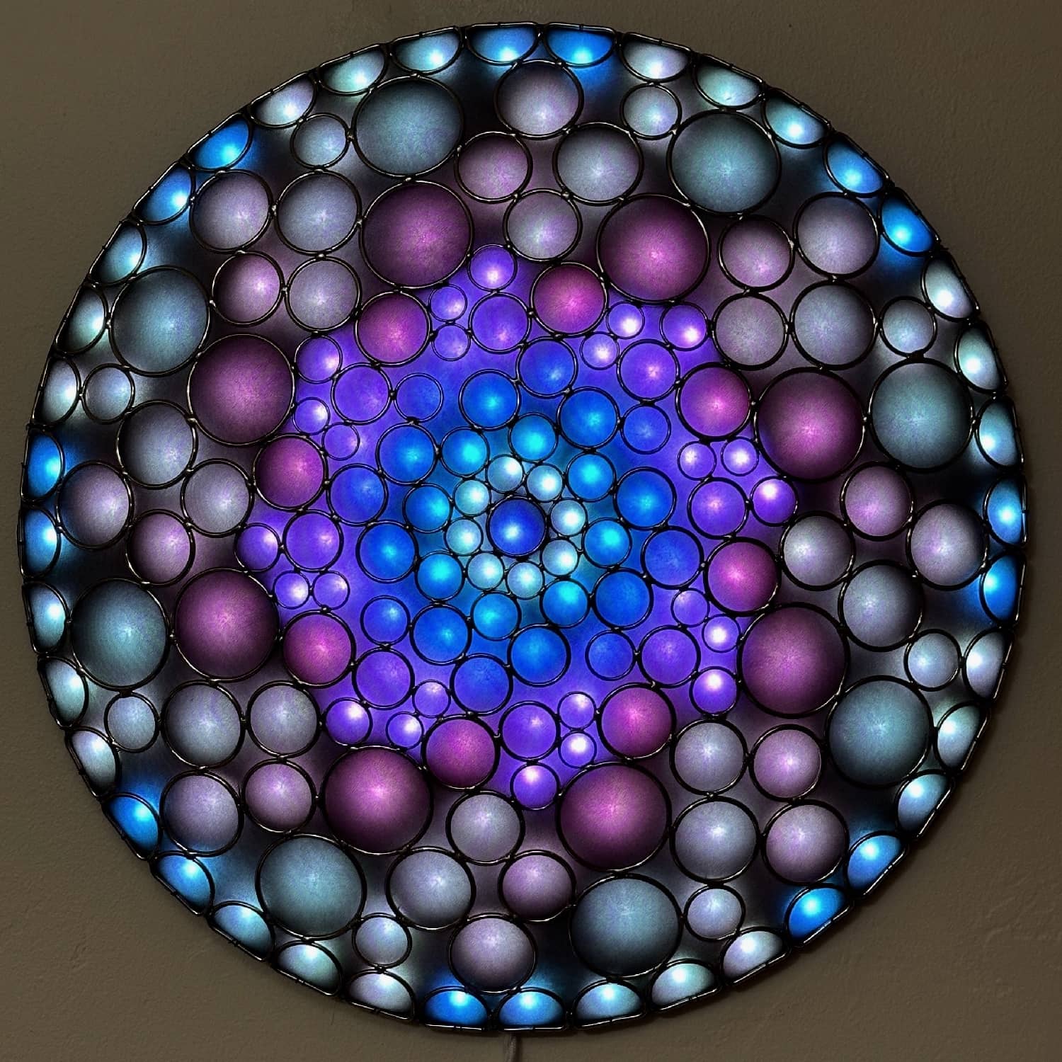 This is part of the Enlighted Rings series of wall-mounted mixed-media art with embedded RGB LEDs. The outermost layer is made with several sizes of silver-colored metal circles and D-rings that have been soldered into a shallow convex dome shape. A fabric diffusing layer is mounted behind the rings, and RGB LED pixels are mounted on an additional internal layer, with one LED aligned with the center of each ring. Some diffused light is also visible through the negative space between rings.