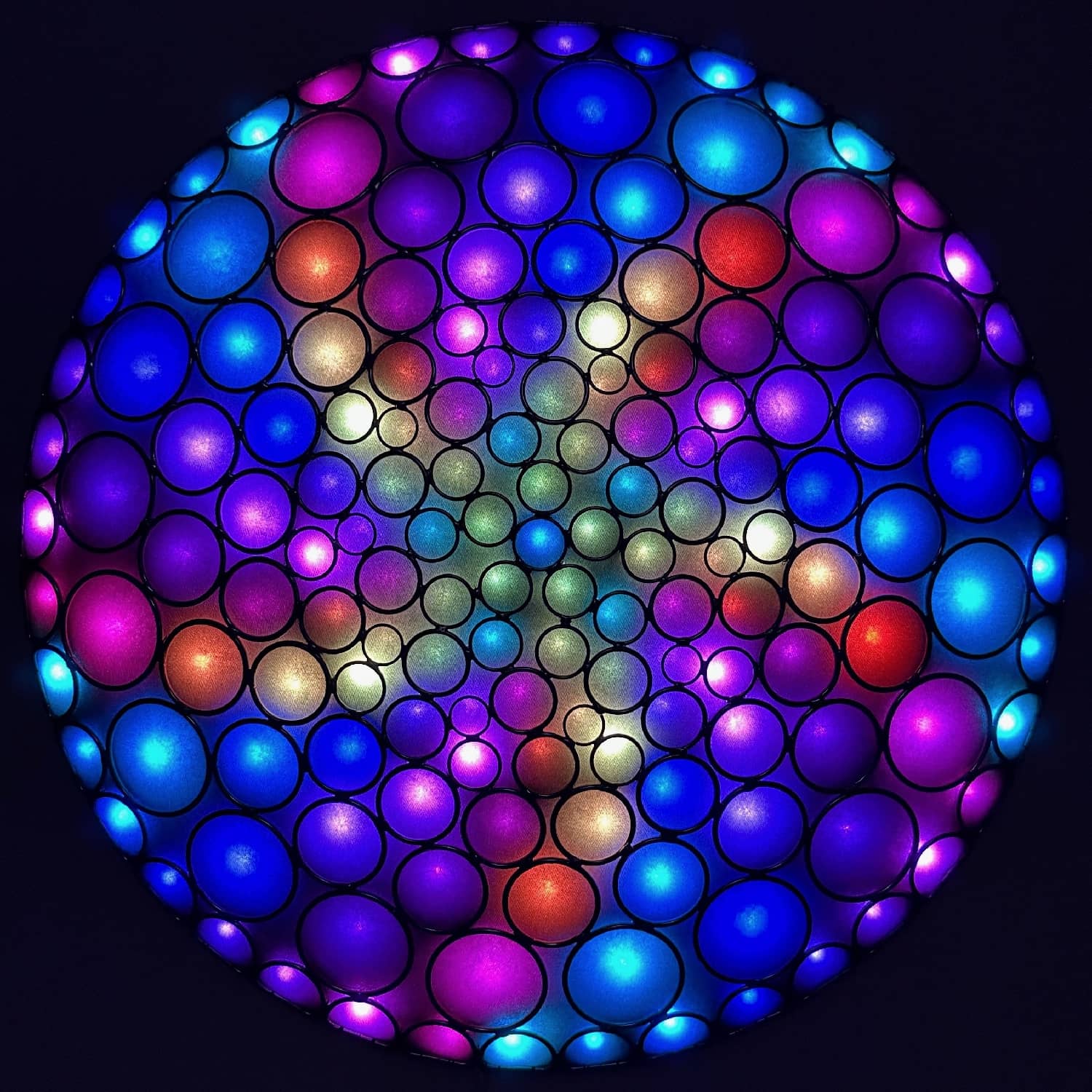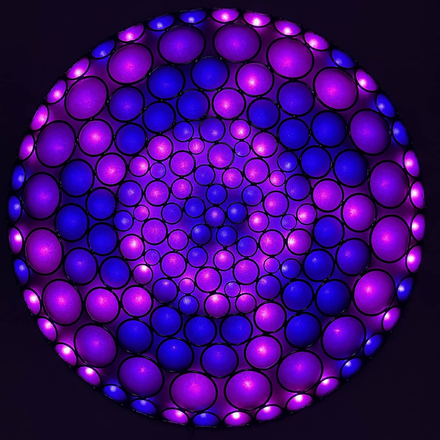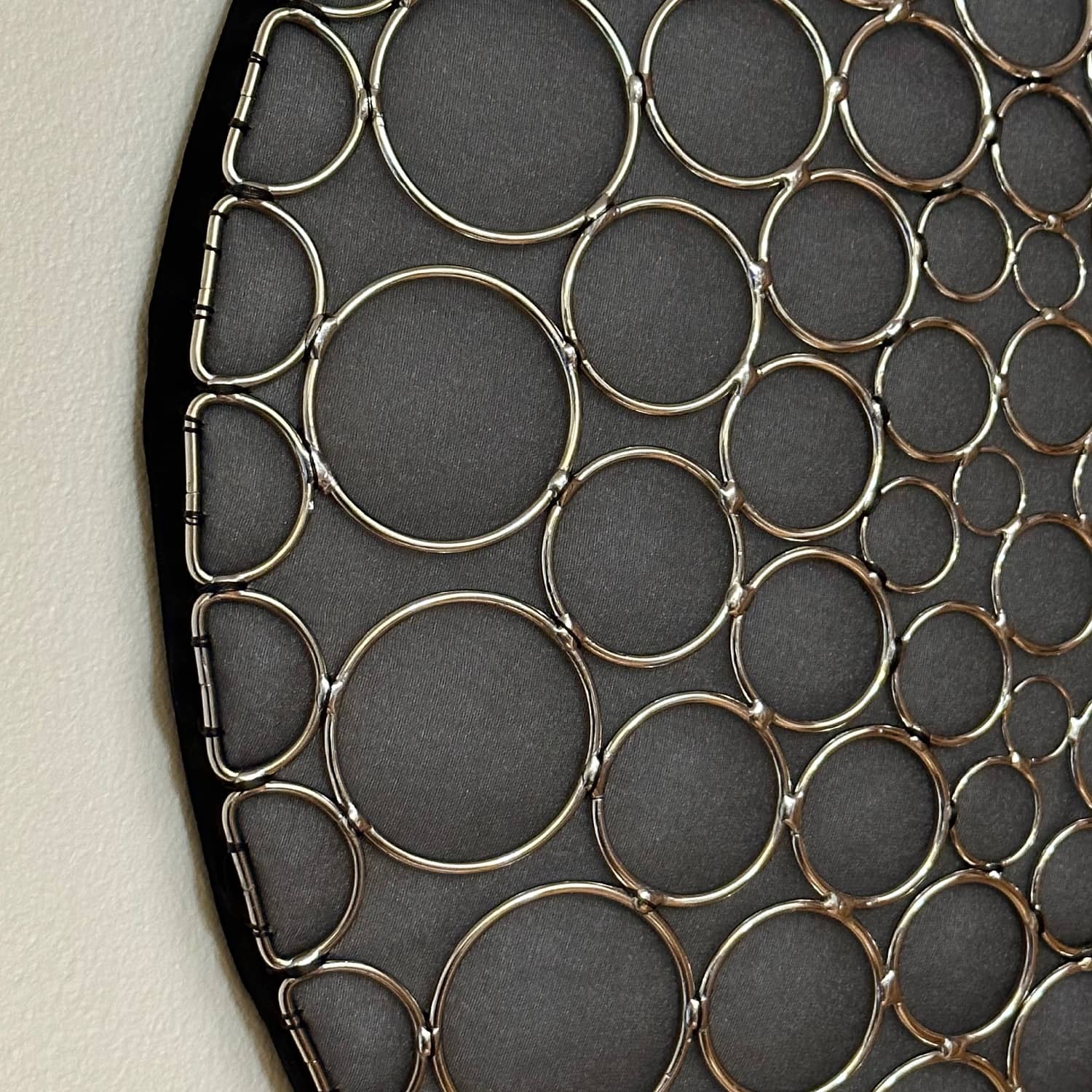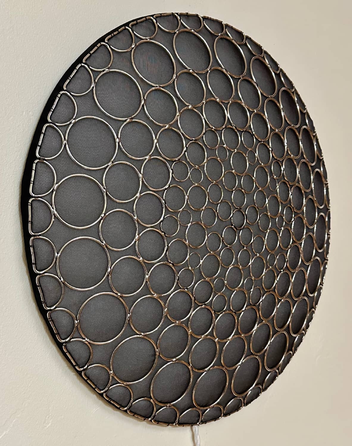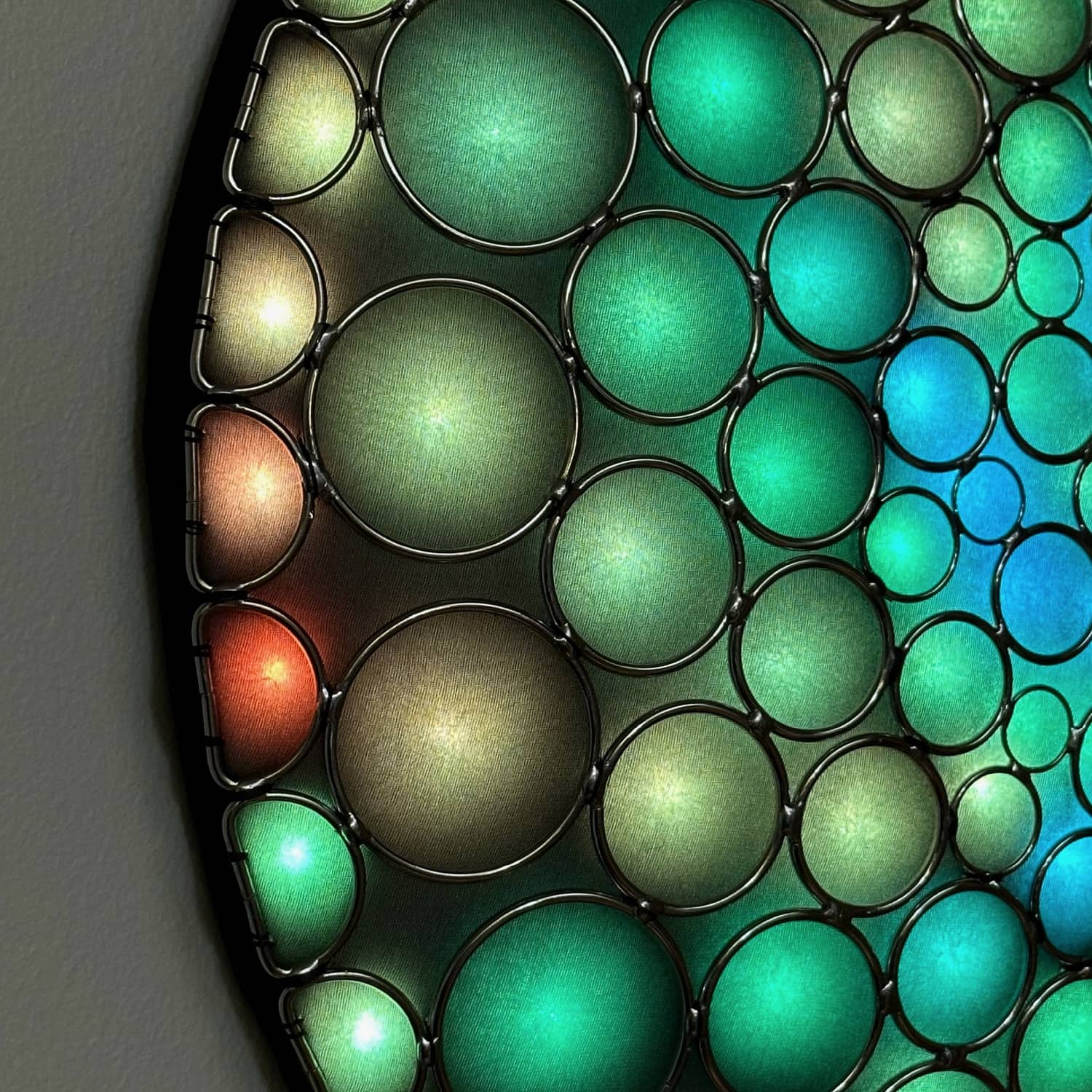 This is part of the Enlighted Rings series of wall-mounted mixed-media art with embedded RGB LEDs. The outermost layer is made with several sizes of silver-colored metal circles and D-rings that have been soldered into a shallow convex dome shape. A fabric diffusing layer is mounted behind the rings, and RGB LED pixels are mounted on an additional internal layer, with one LED aligned with the center of each ring. Some diffused light is also visible through the negative space between rings.