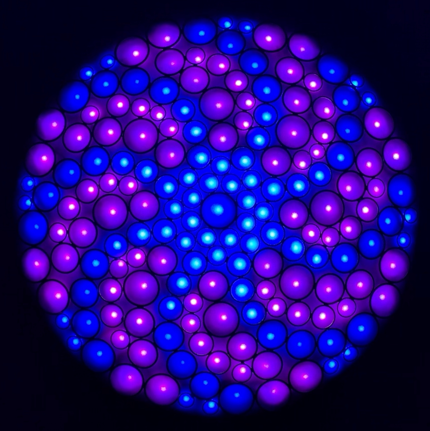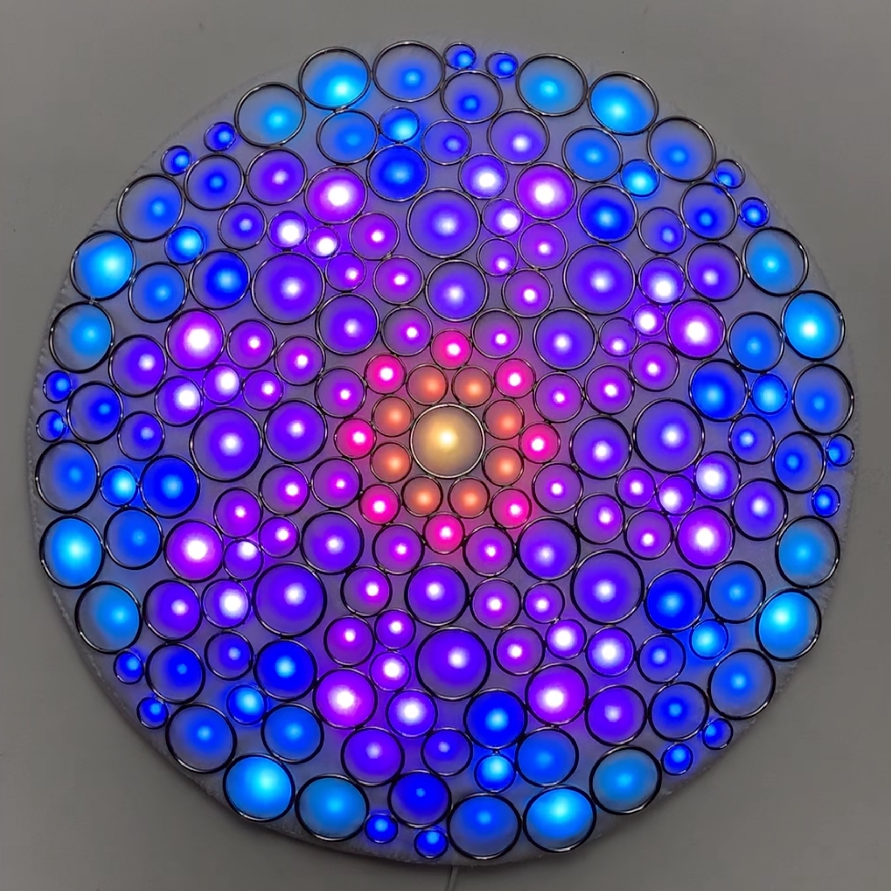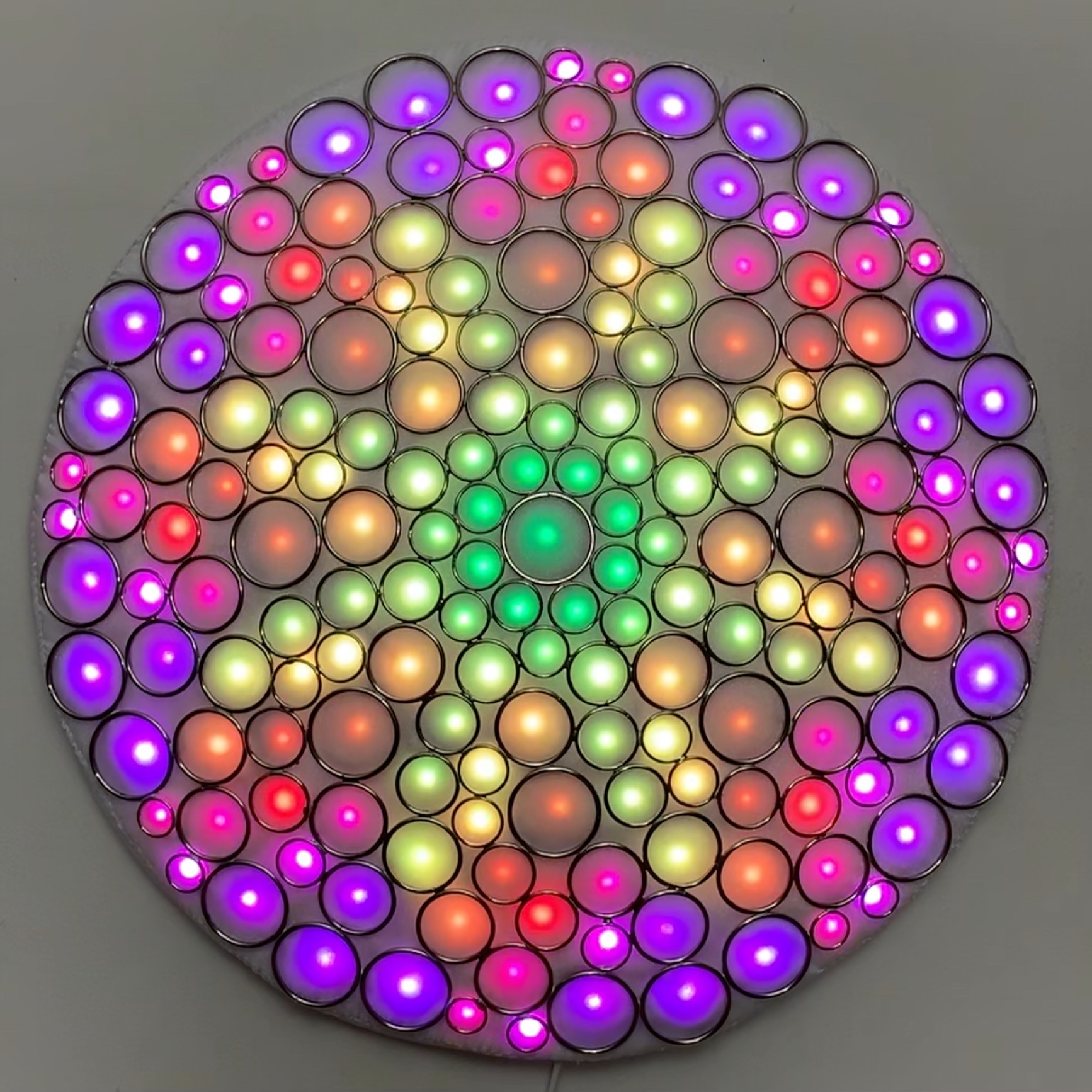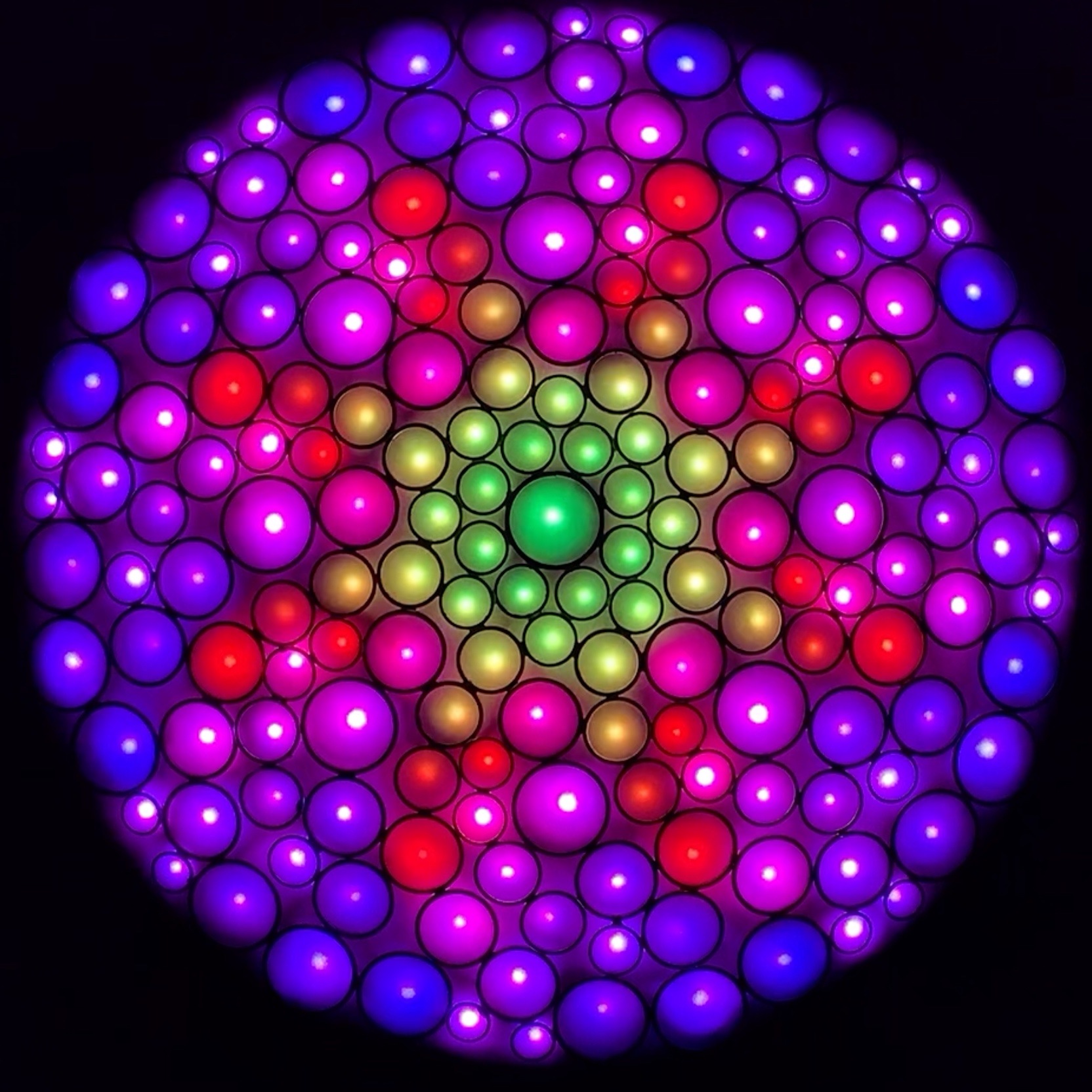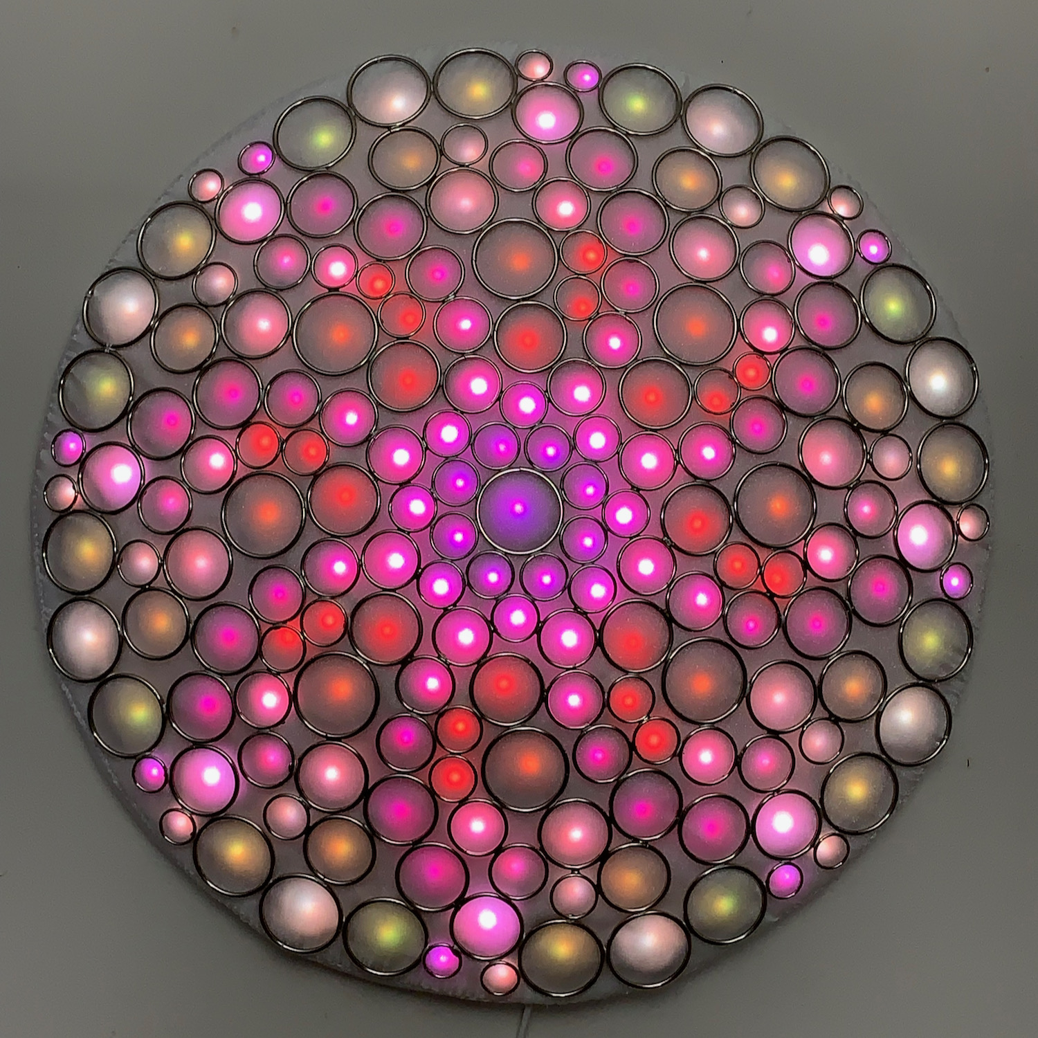 The RGB LED pixels are mounted behind the rings, with one LED near the center of each ring. A layer of white organza and diffusing material lies above the LEDs but behind the steel rings, to partially smooth out the hot spots. Some diffused light is also visible through the negative space between rings.