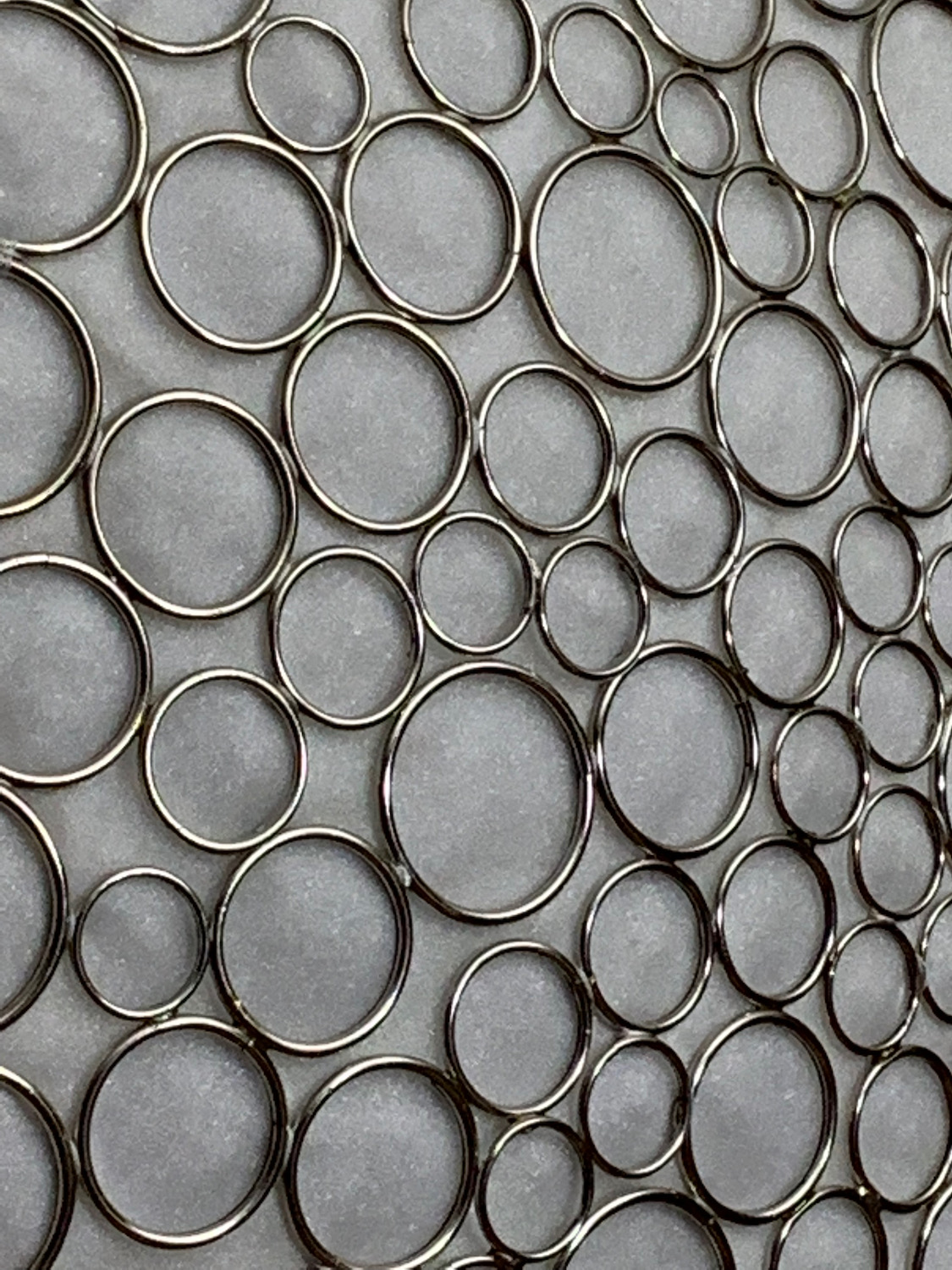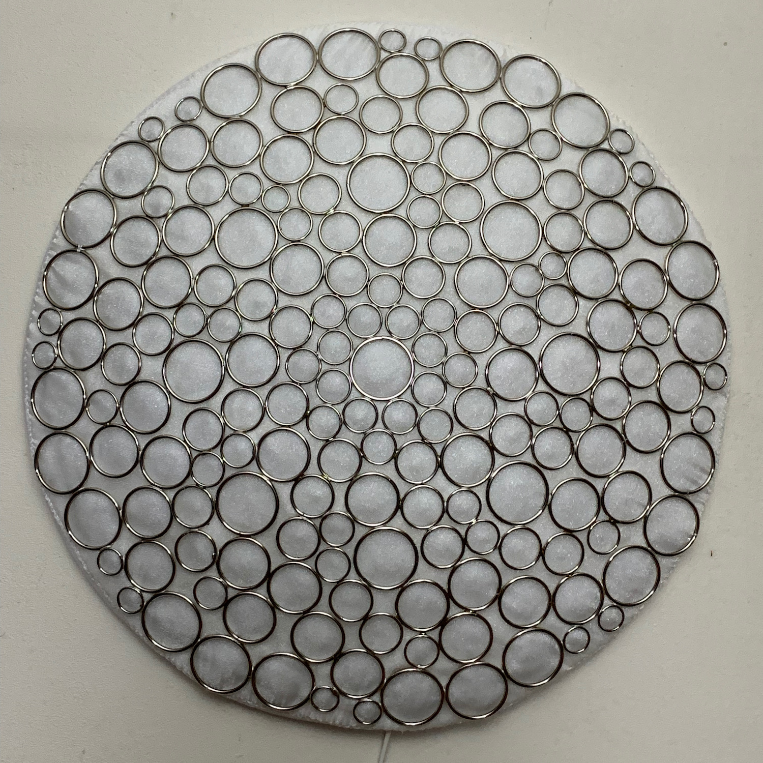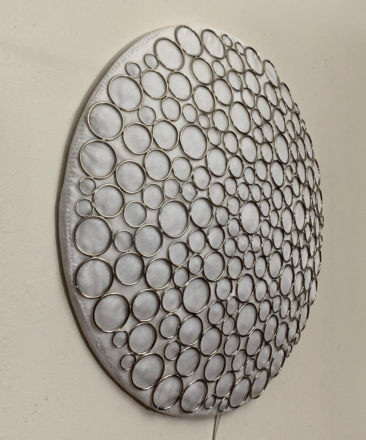 This piece is round, but arches out in the center in a shallow convex dome shape. The outermost layer is made of silver-colored soldered metal rings, and provides most of the structure. The rings are slightly different sizes, and fill in the dome with an 8-way repeating pattern. The back panel is covered in white fabric.