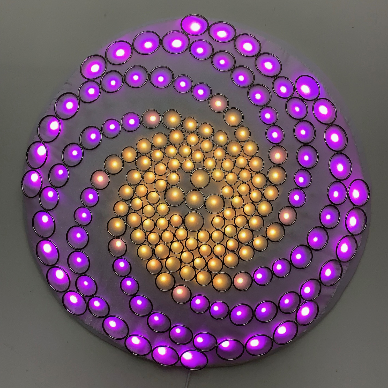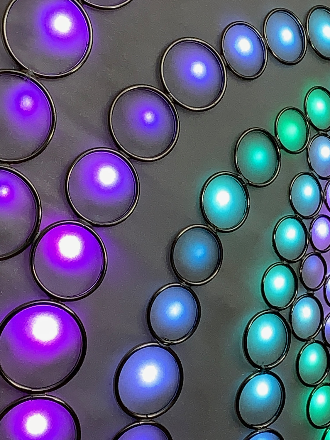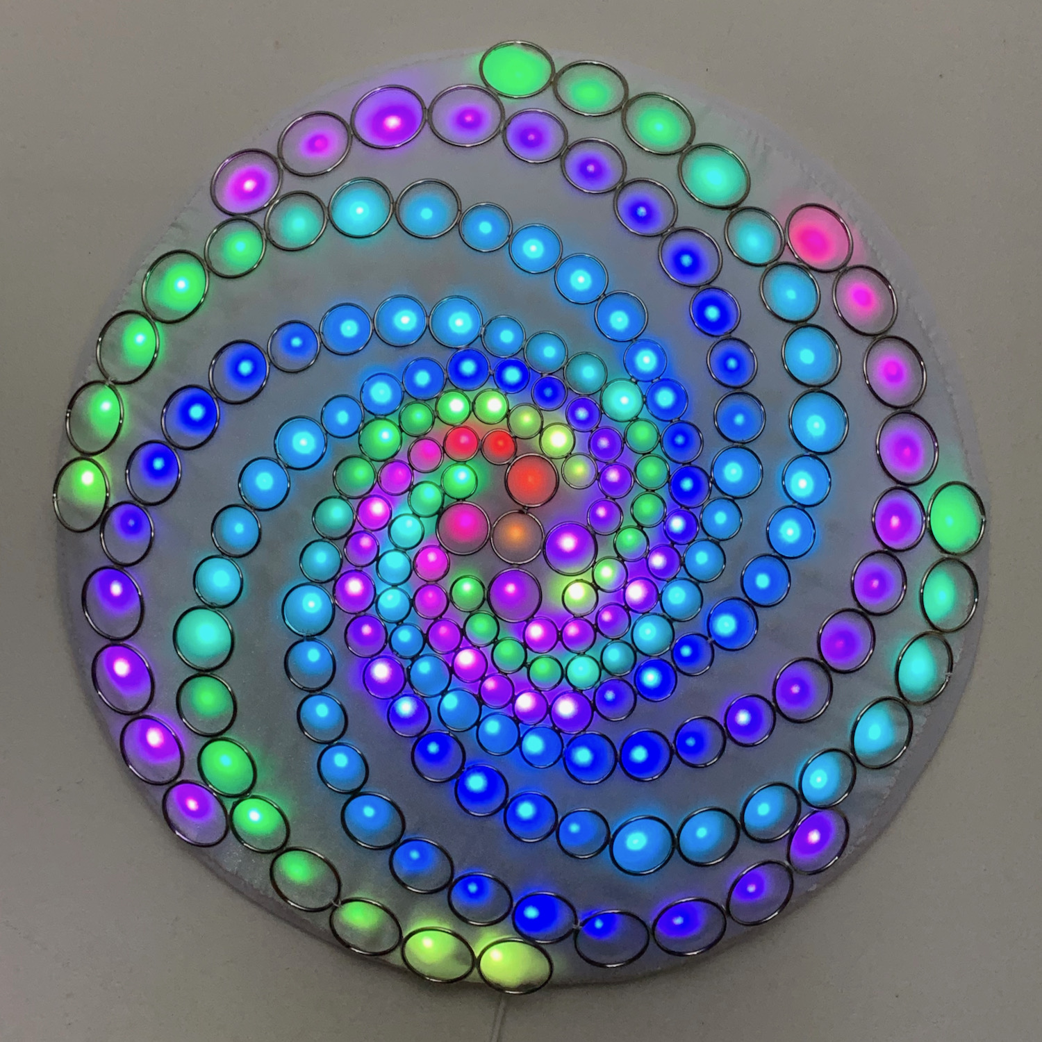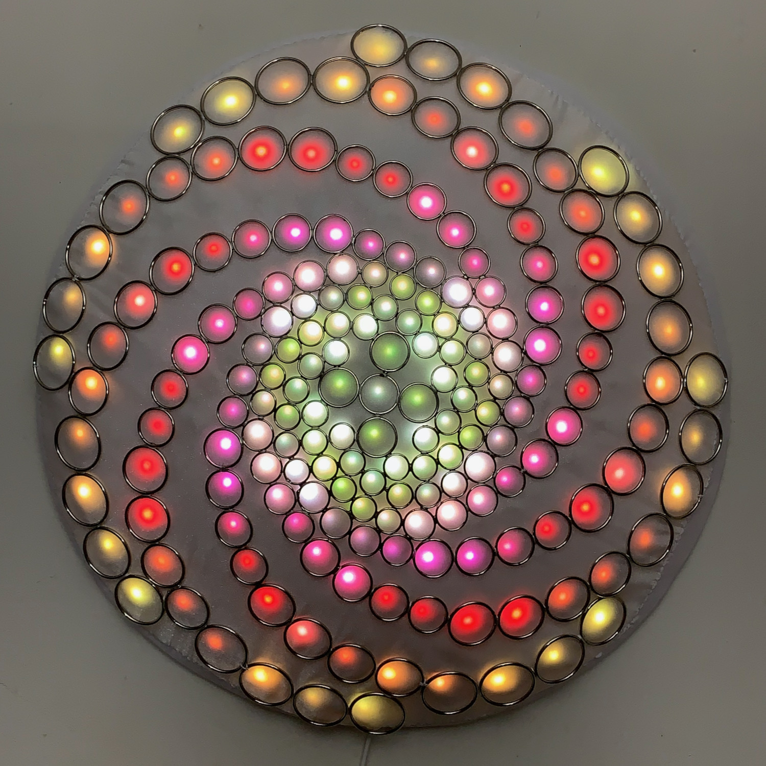 The RGB LED pixels are mounted behind the rings, with one LED near the center of each ring. A layer of white organza and diffusing material lies above the LEDs but behind the steel rings, to partially smooth out the hot spots. Some diffused light is also visible through the negative space between rings.