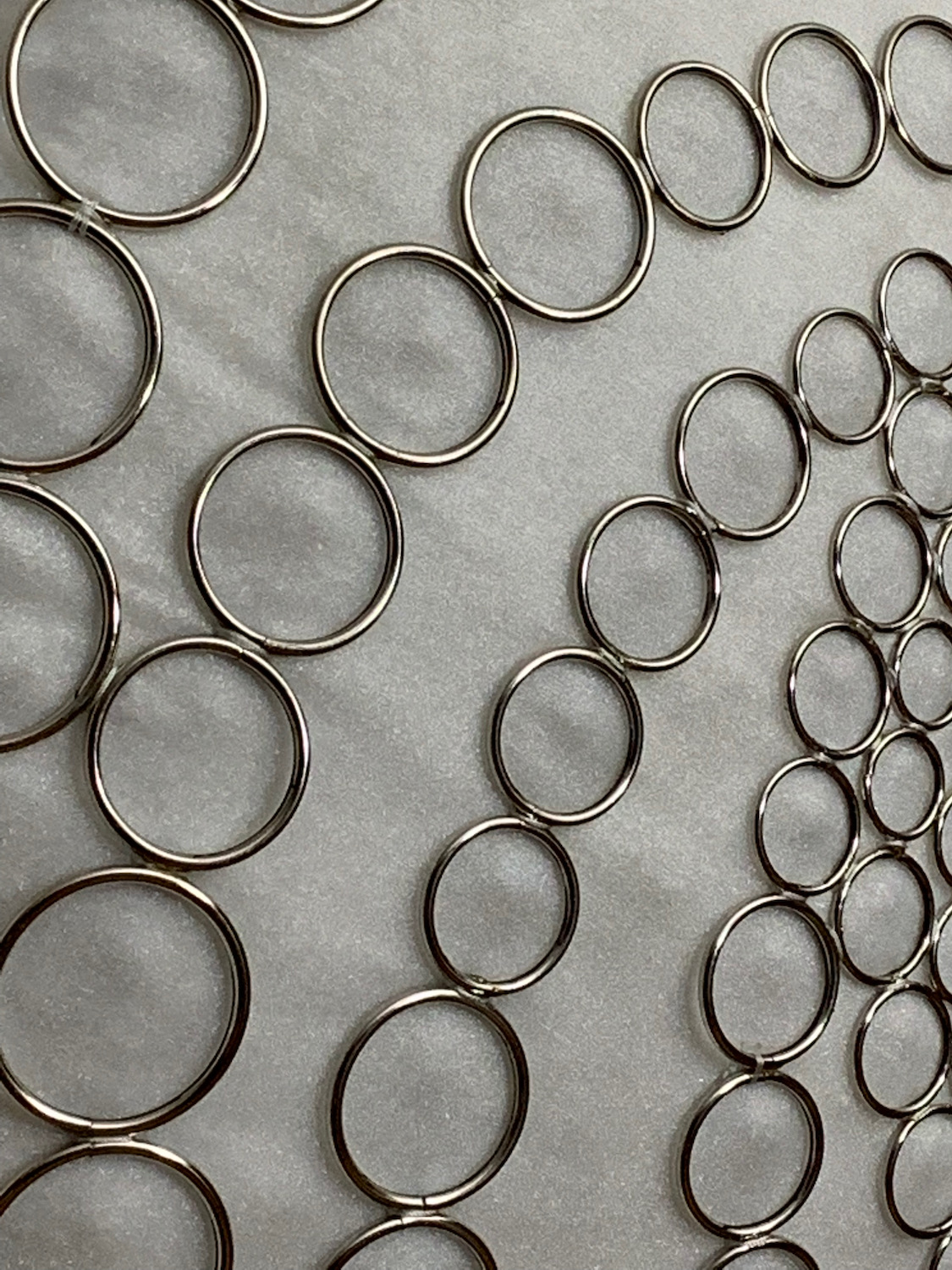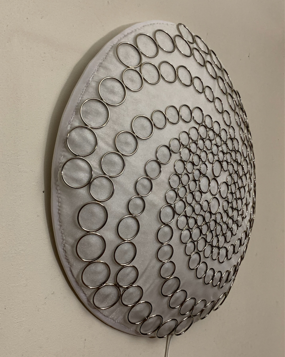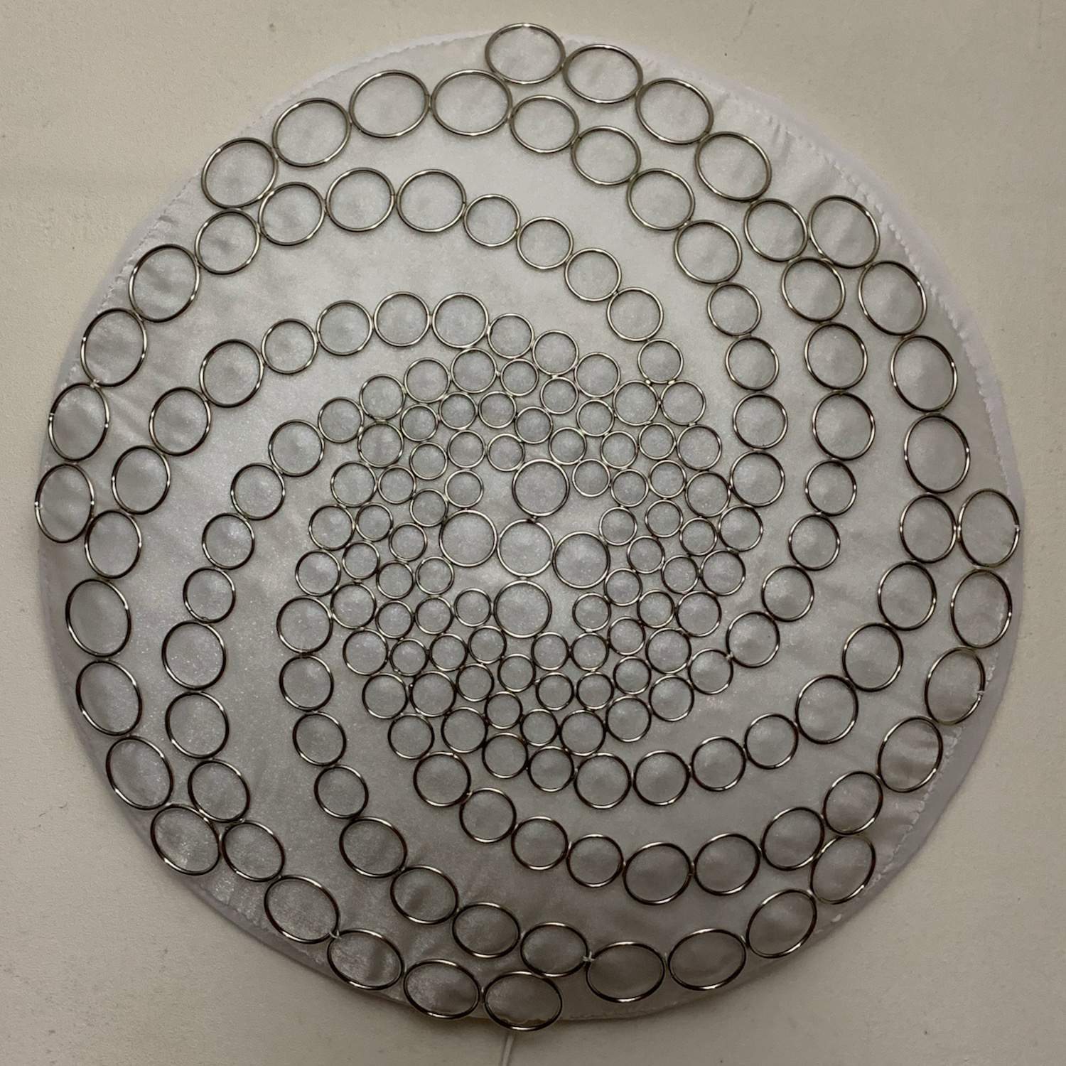 This piece is round, but arches out in the center in a shallow convex dome shape. The outermost layer is made of silver-colored soldered metal rings, and provides some of the structure. The rings are slightly different sizes, and fill in the dome with a 8-way repeating spiral pattern. The back panel is covered in white fabric.