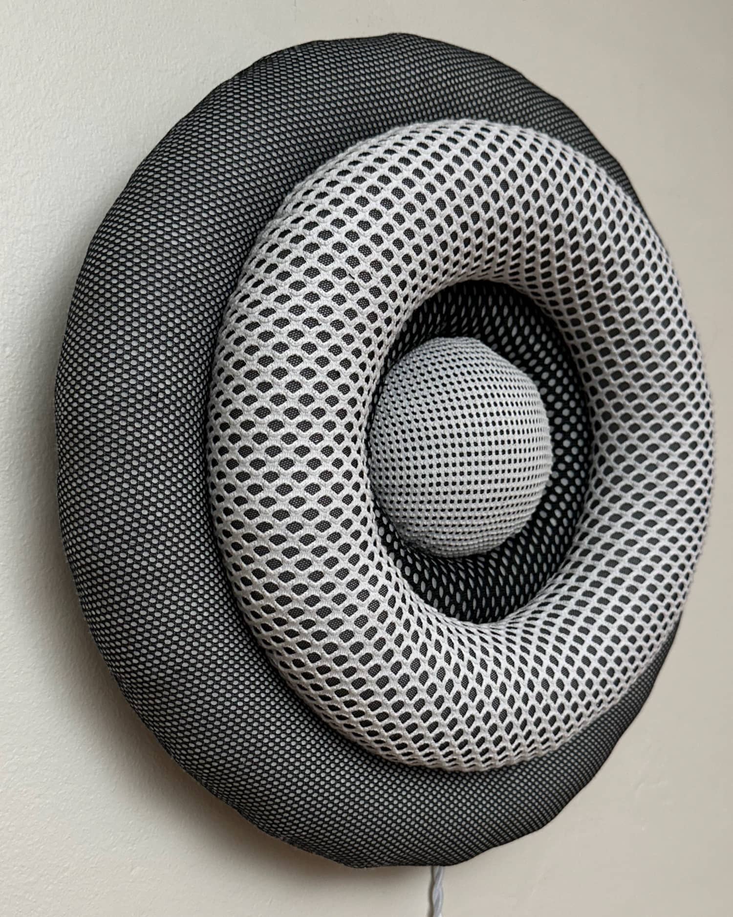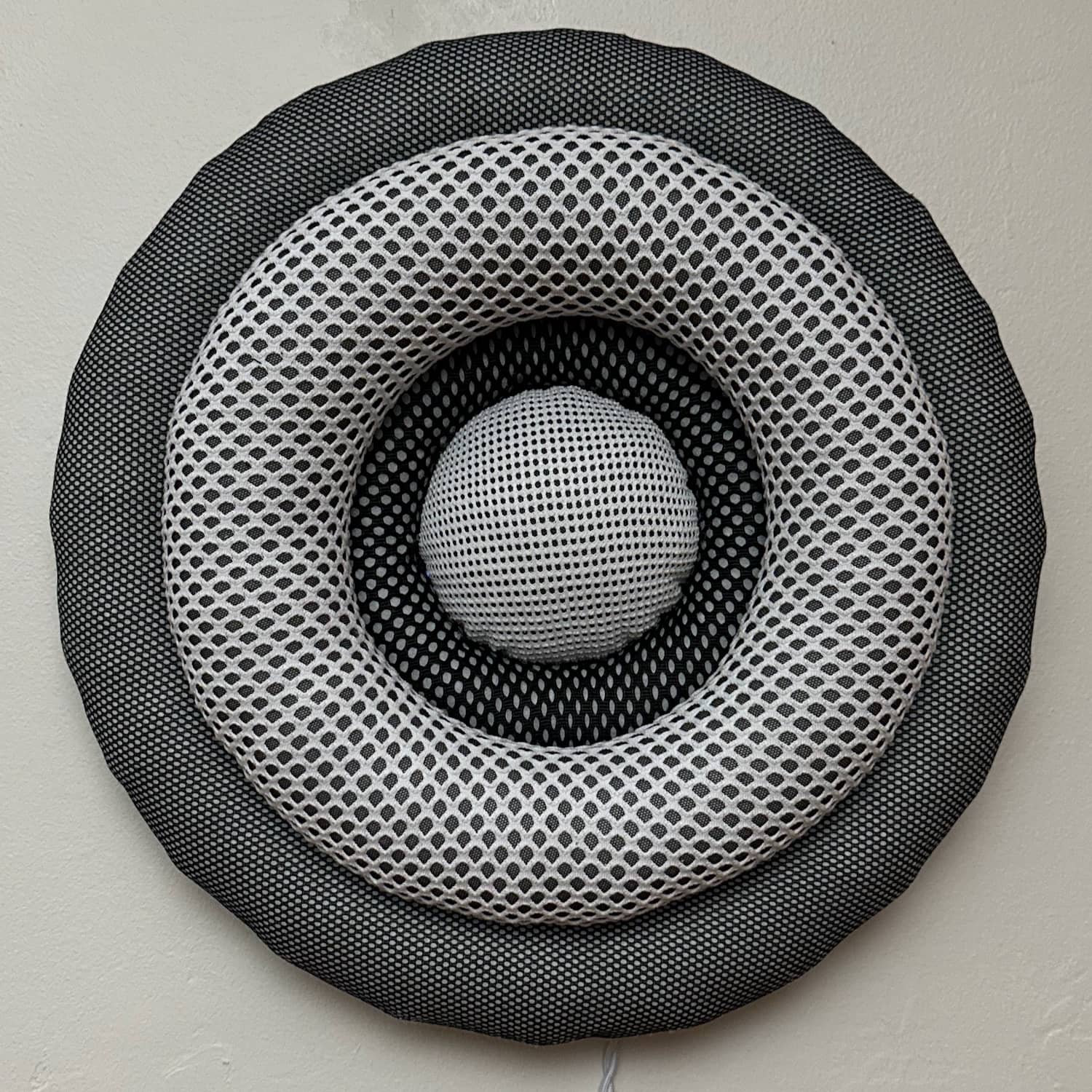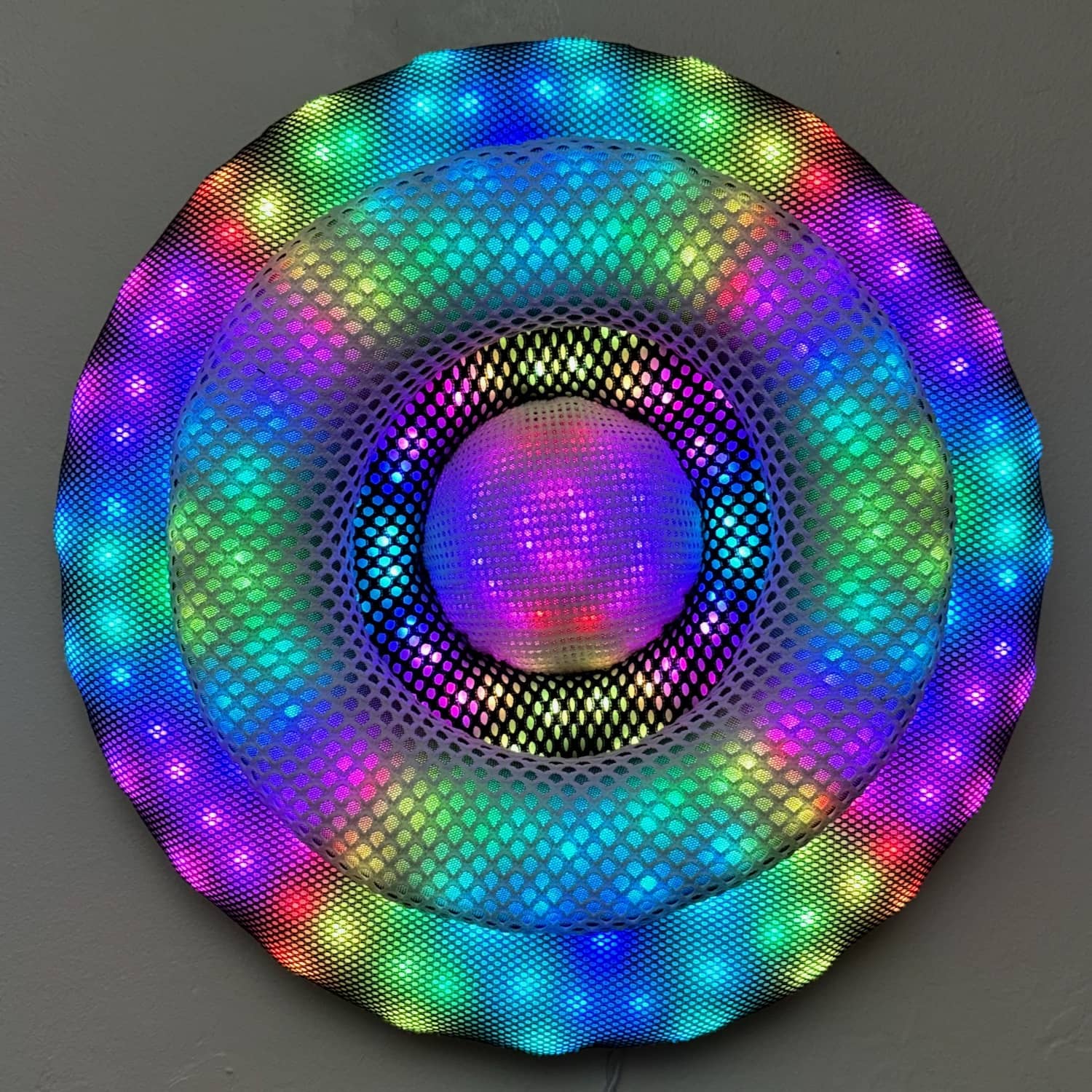 This piece is part of a series made with nested toroid shapes. The outer surfaces are illuminated with RGB LEDs and covered with a fabric diffusing layer as well as various contrasting colors of mesh fabric. Enlighted Toroid 3 has alternating rings with a light or dark background and a constrasting mesh overlay.