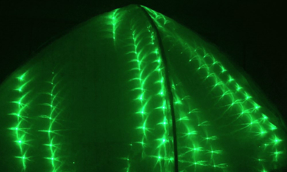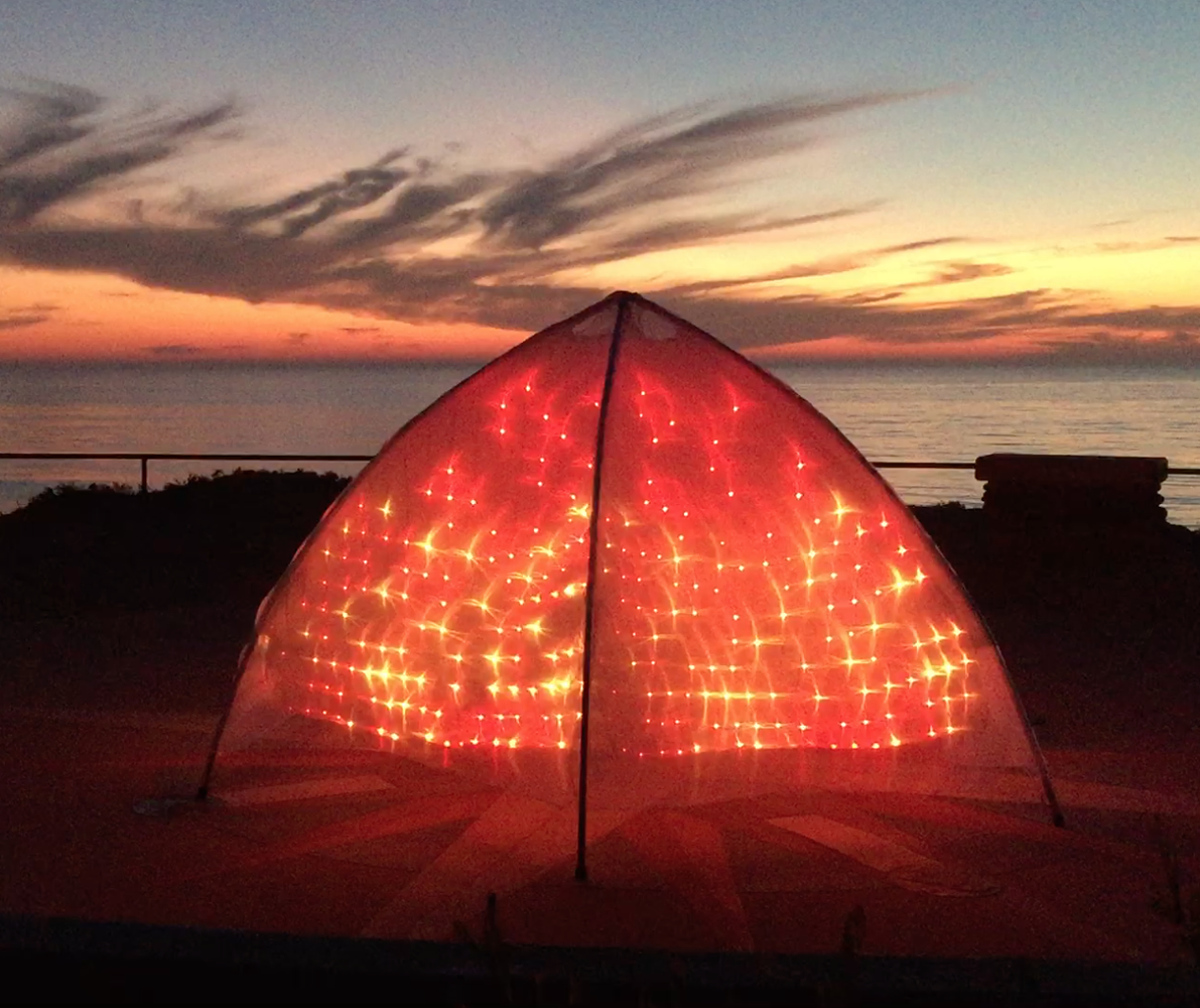At first glance, it resembles a dome-shaped rescue vessel that has been launched from a larger spaceship. It sits on a hexagonal foundation, with six curved metal supports that rise from the corners and meet at the center top. The structure is decorated with a triangular grid of RGB LED pixels embedded within a translucent white fabric cover.
