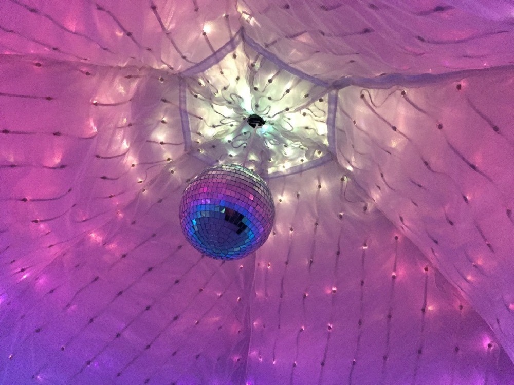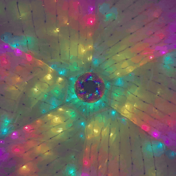 The piece can also be enjoyed from the inside, by lifting one of the lower flaps and crawling underneath. The reflected internal light creates an immersive environment suitable for dynamic color therapy, relaxation, or whatever form of "escape" is needed. A mirrored ball hanging in the center adds a festive touch.