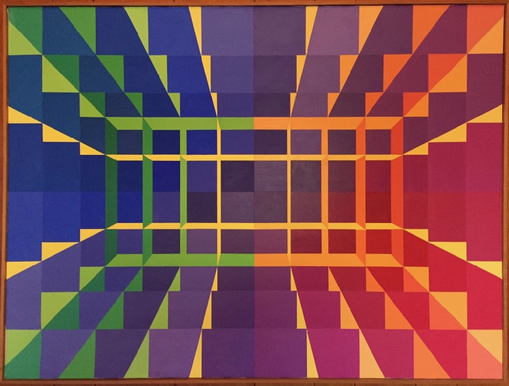 This piece represents the artist's introduction into what would become one of her favorite styles of abstract painting. As an engineering student at Harvey Mudd College, she had access to classes at the other Claremont schools, including painting at Pomona College. Janet took several classes from Karl Benjamin, who specialized in geometric abstractions, painted in a hard-edge colorist style.