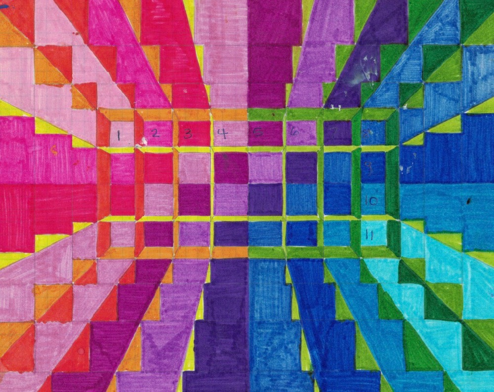 This painting, "Gateway", was the second piece she created in his class. The design was planned on graph paper with colored pens before it was re-created on canvas with paint. The original sketch is included in the set of images on this page.