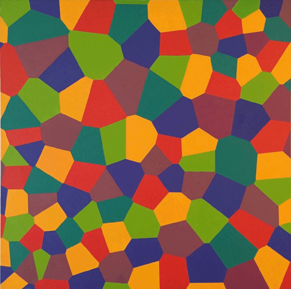 The second panel has been modified by a mechanical "relaxation" procedure in which the center defining point of each cell is moved to the centroid of that cell. The areas of these regions are more uniform, and they resemble a living system in which the expansion of each unit is limited by its immediate neighbors.