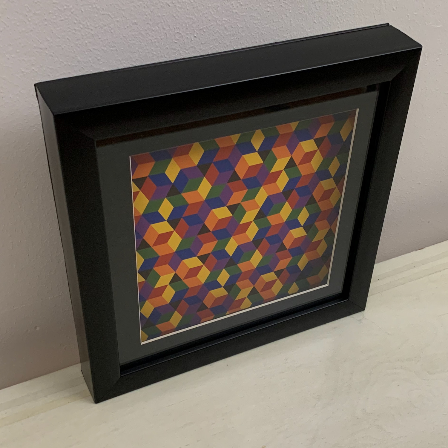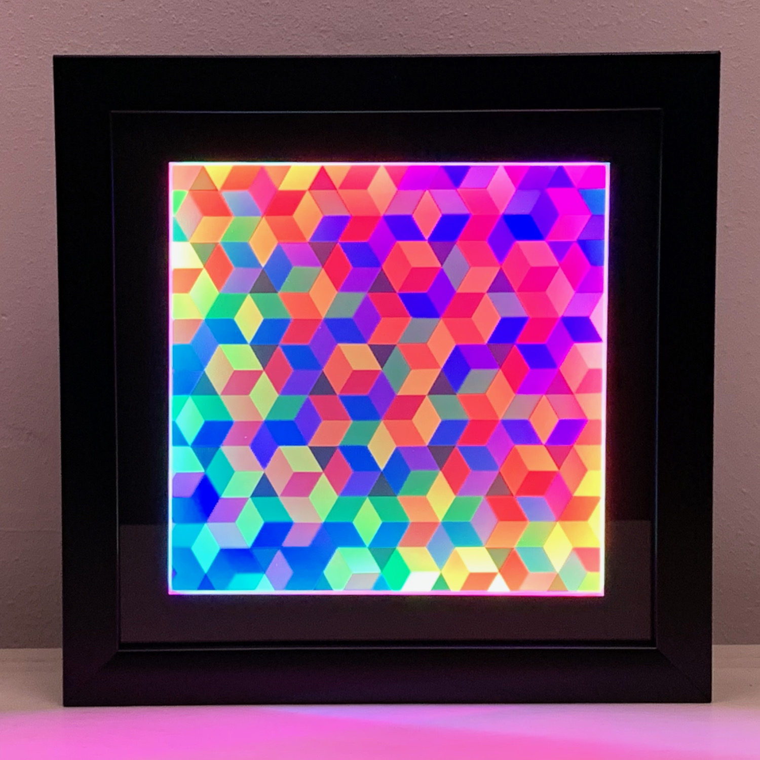 As the light color changes, the printed image appears to move and change. The graphic used in this case is a square-cropped version of an abstract geometric design created by the artist in 1996 (see Open Hexagonal Lattice I for information about the original acrylic on canvas version). While the Escher-esque impossible shape illusion is noticeable in the original, it becomes even more dramatic when viewed under sweeps of rotating color.