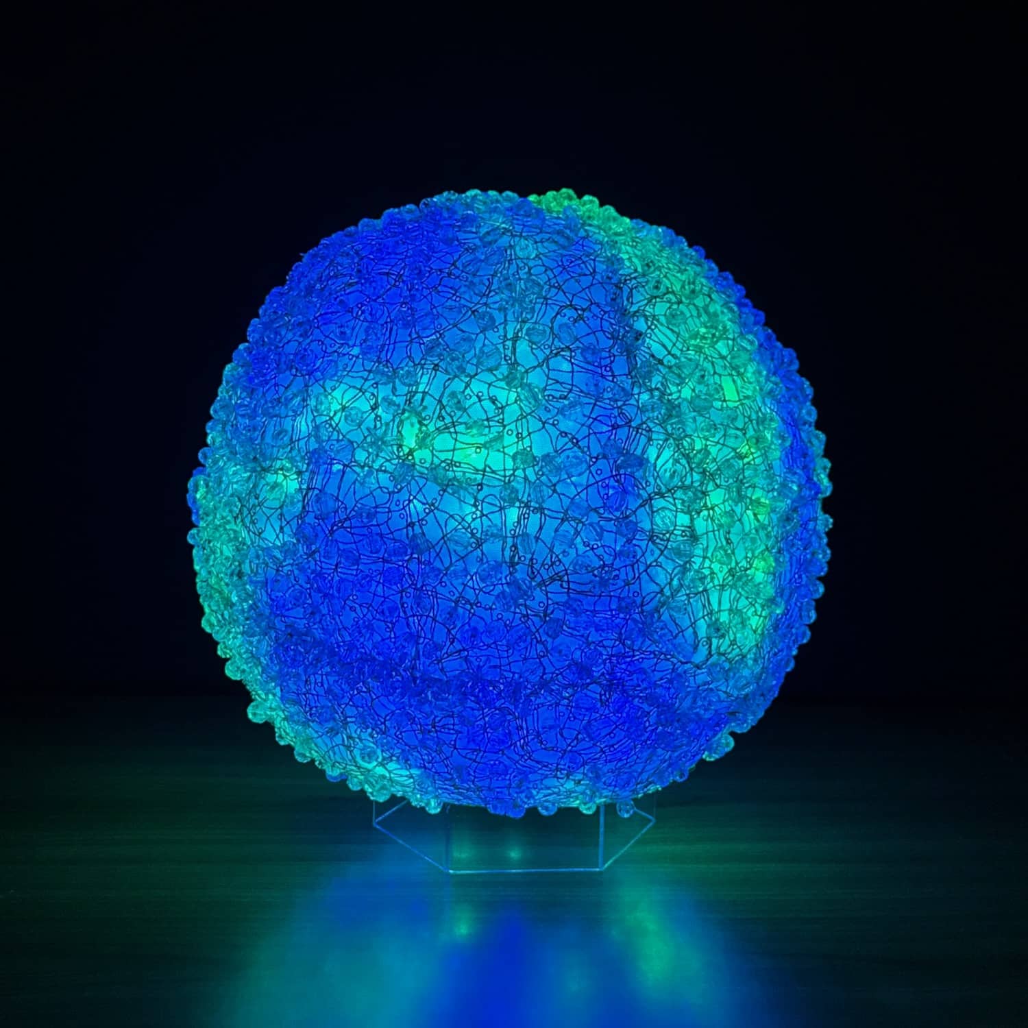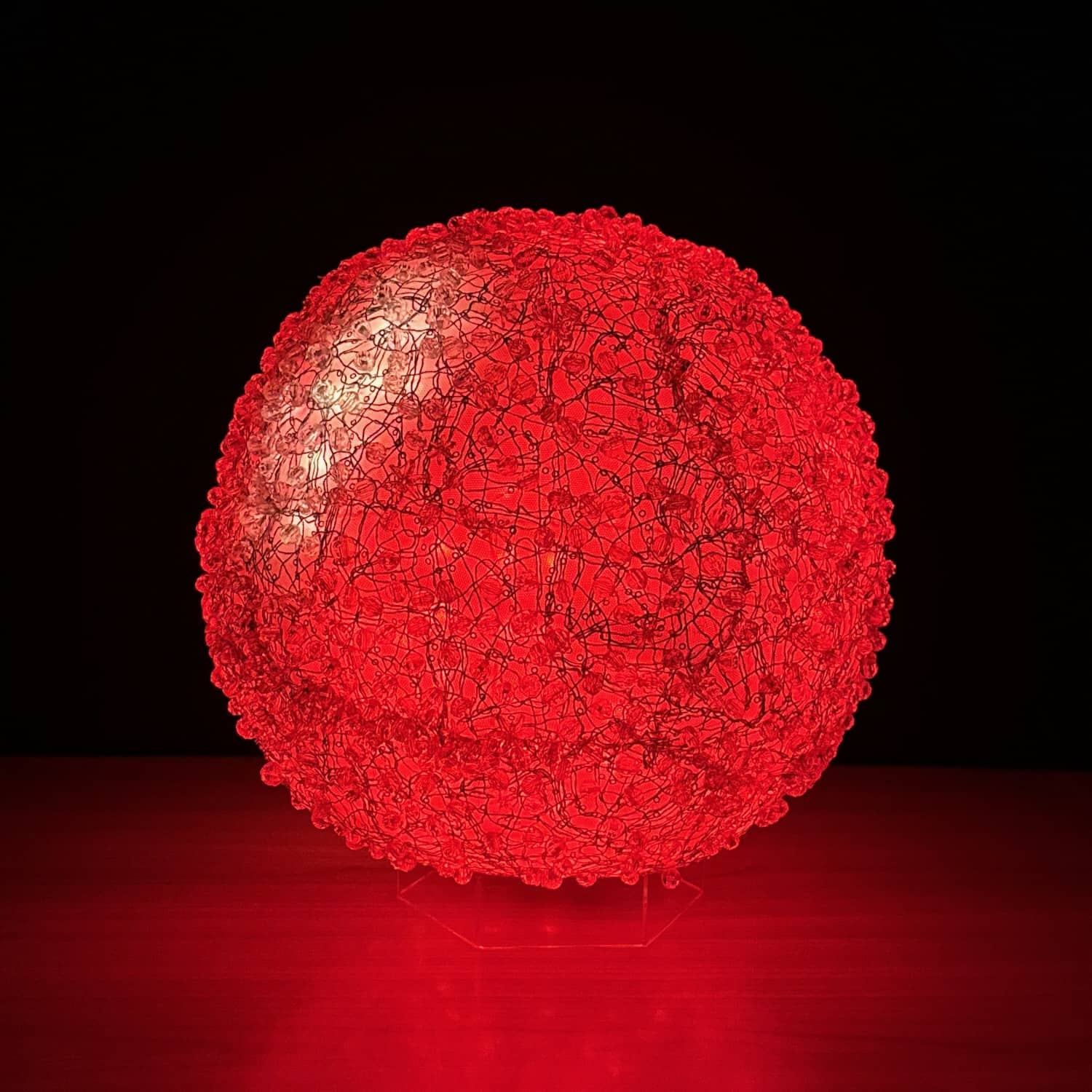 This piece evokes images of a world becoming consumed by unbearable heat, in the form of an aesthetically pleasing distraction of flowing lights on the surface of a shimmering sphere.