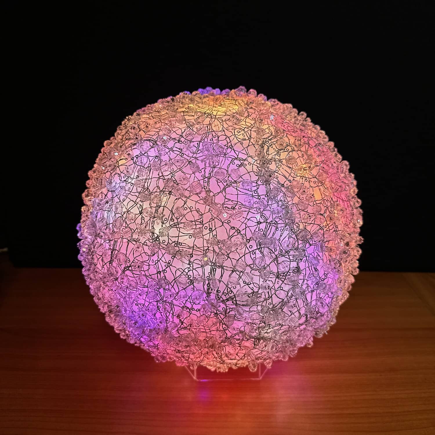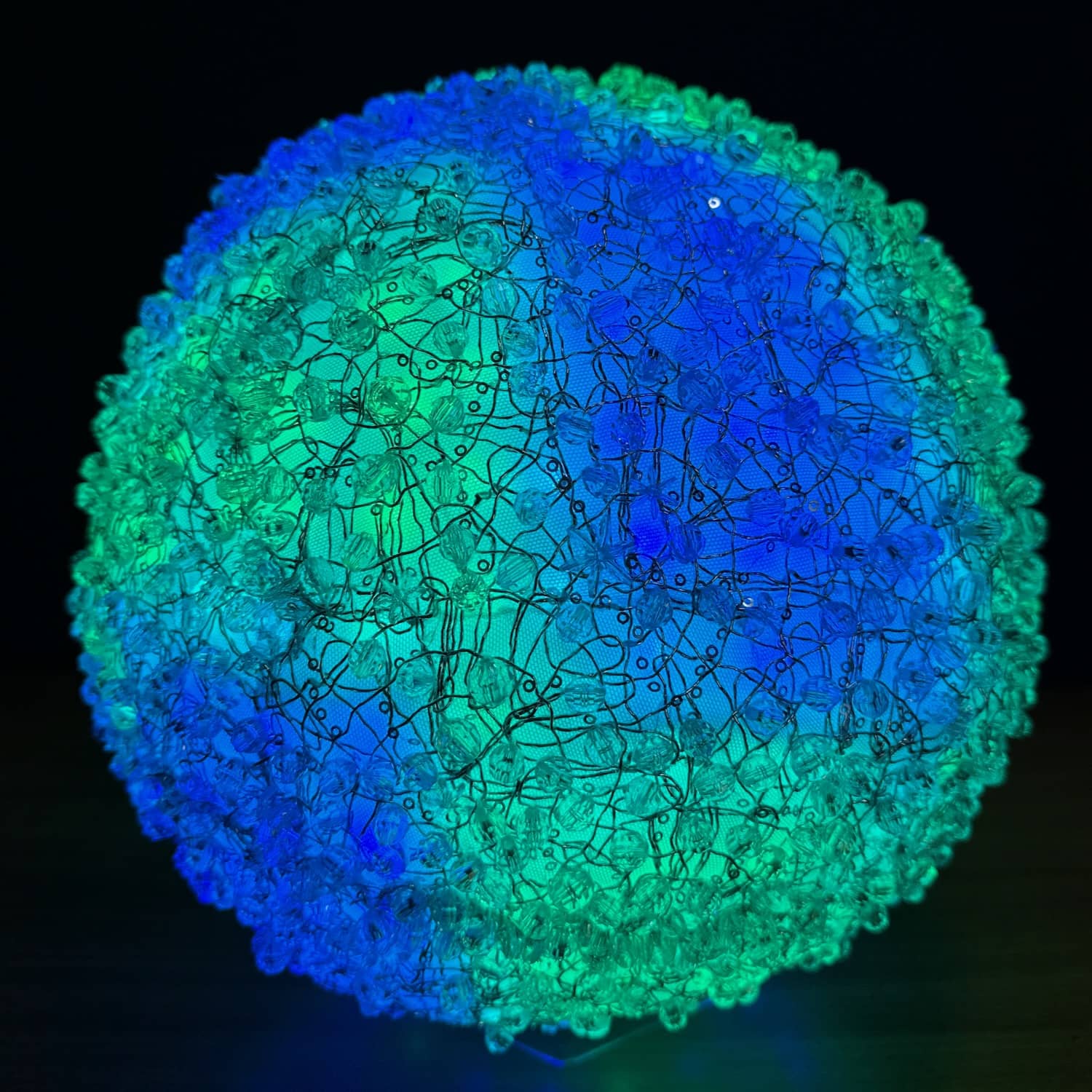 The materials used are all synthetic, ranging from the acrylic foundation and plastic internal structures, to the outer layers of fabric and other decorative trims. The internal lighting is derived from RGB LED pixels, with control circuitry mounted on printed circuit boards. The piece also requires electricity from an external wall adapter. All of these components could be considered to be a contributing factor to the harmful effects of climate change.