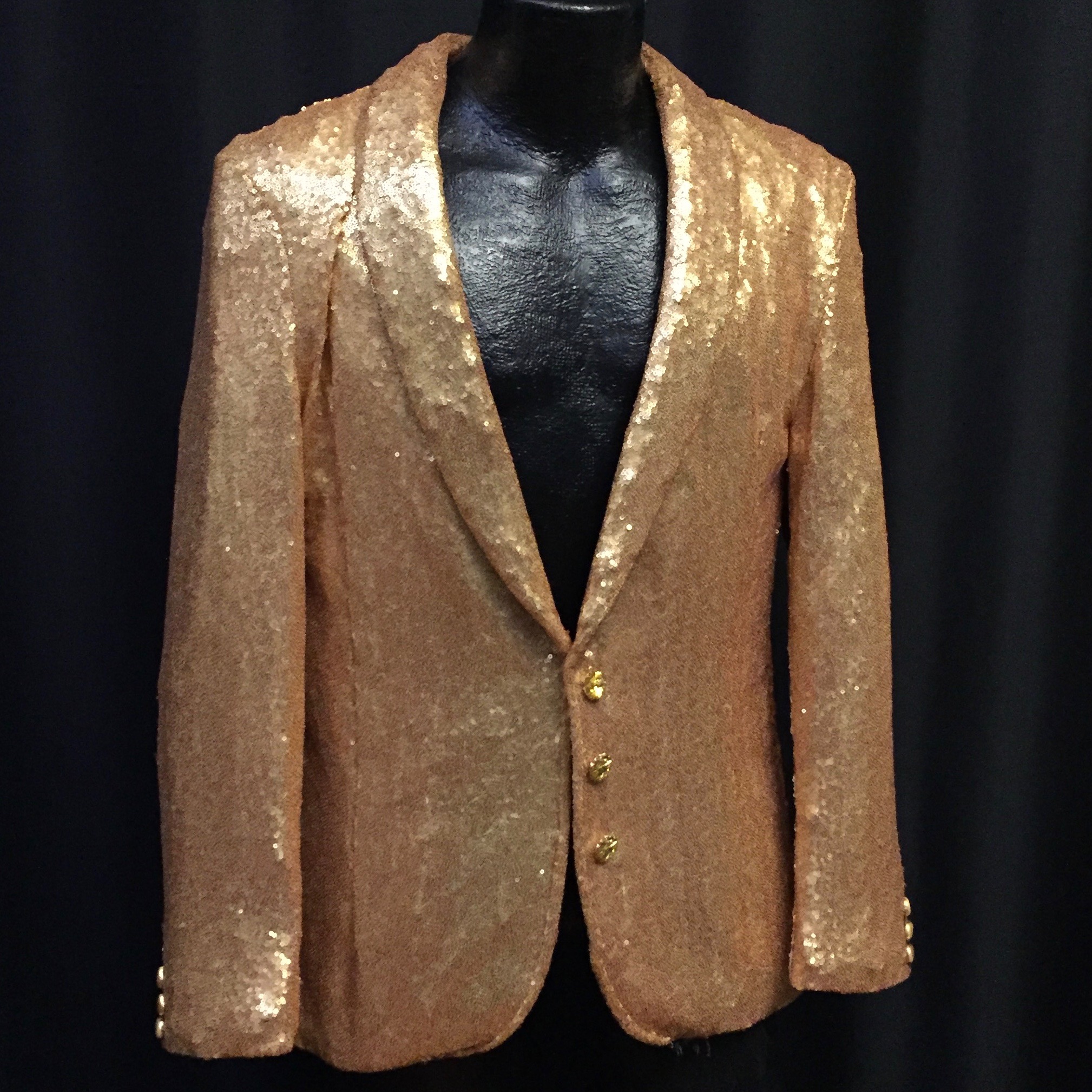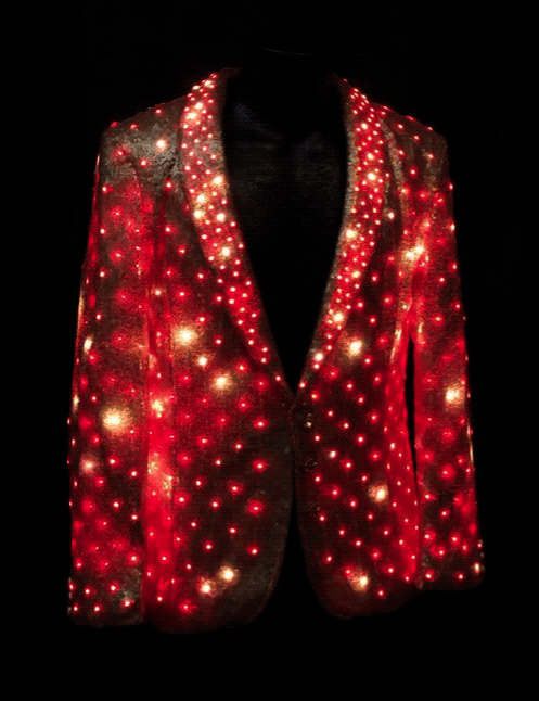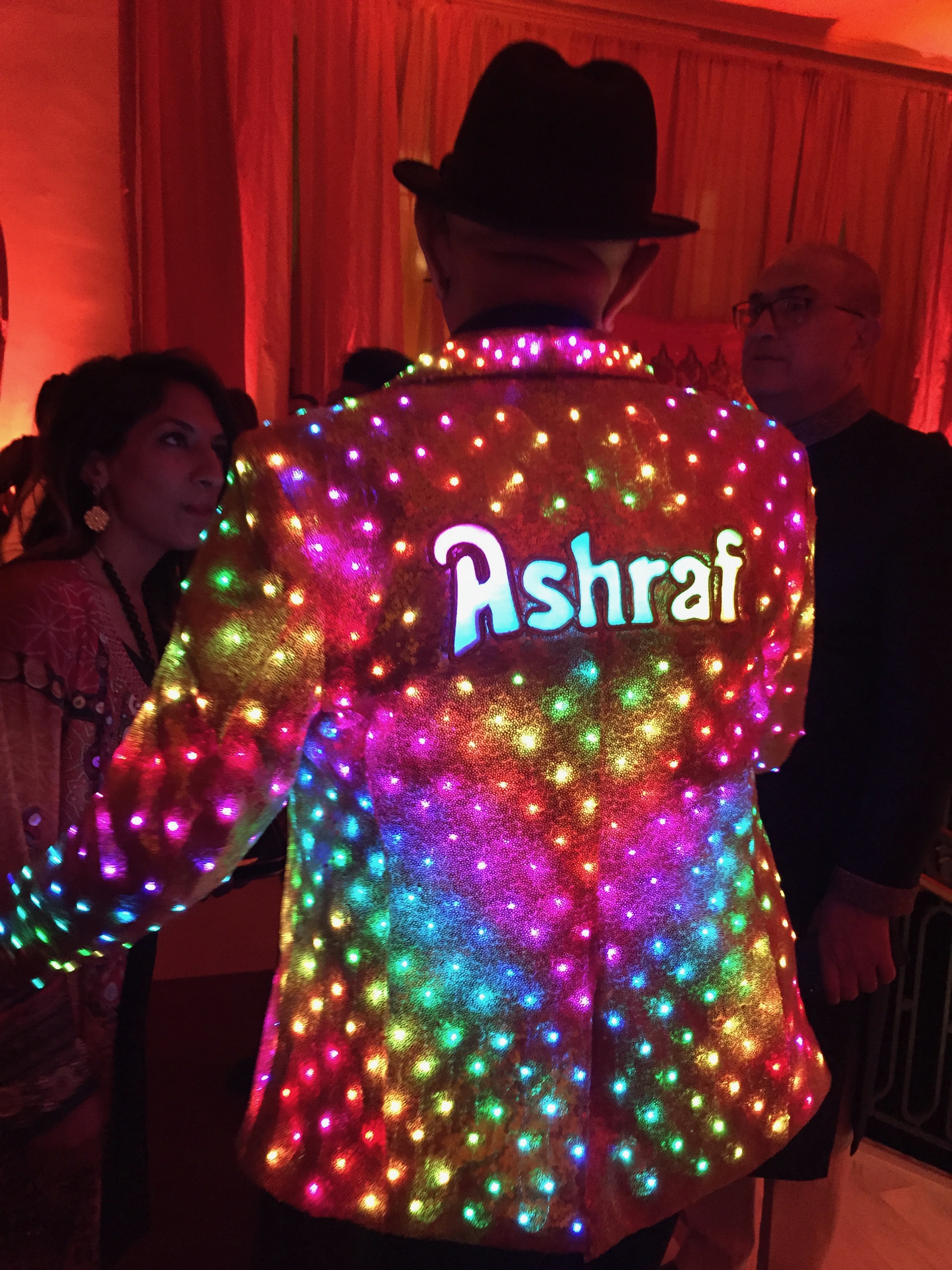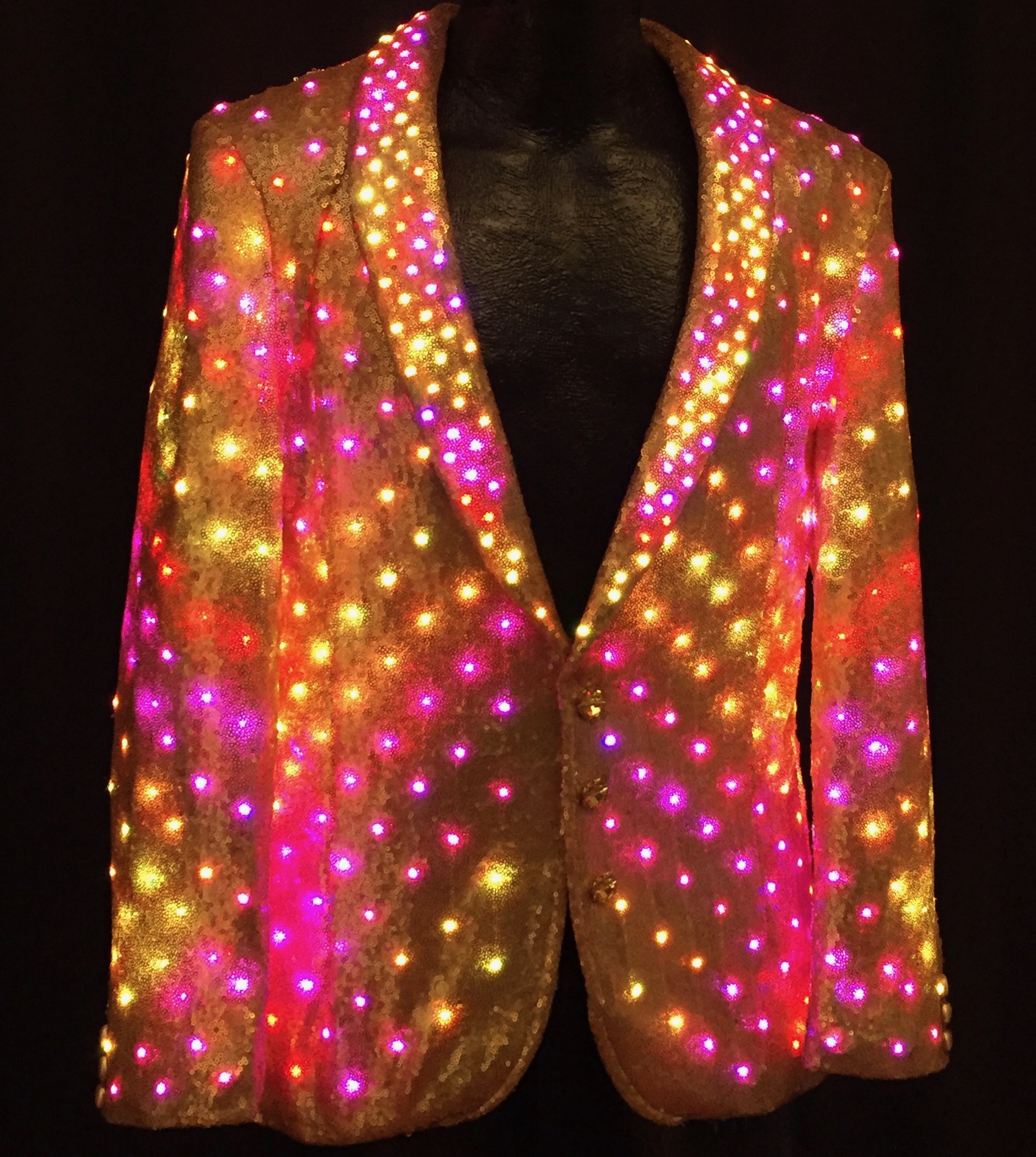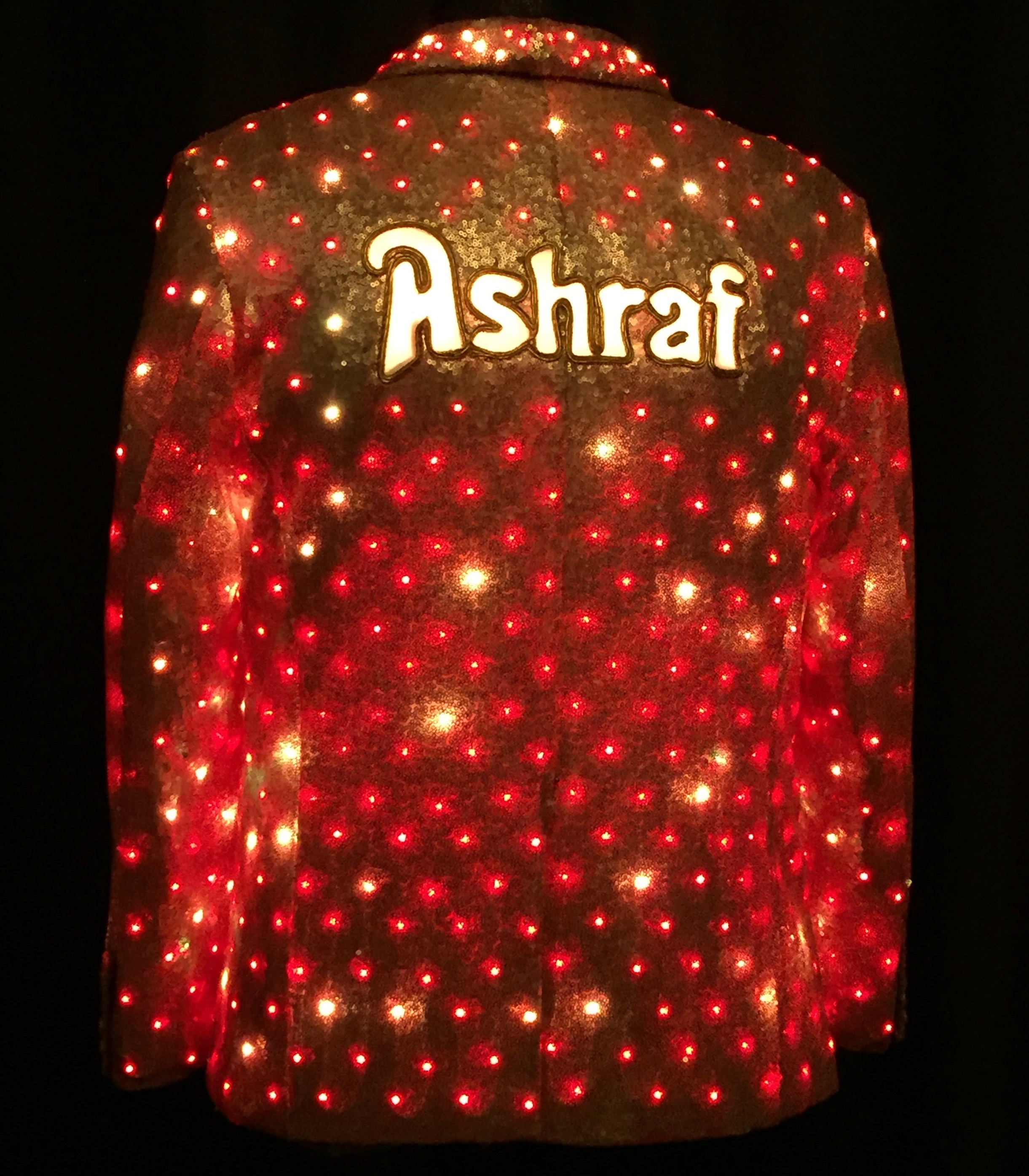 This custom jacket is decorated with about 1000 RGB LED pixels covering the front, back, arms and collar. The name 'Ashraf' is also illuminated on the back, with RGB LED backlighting behind sheer embroidered letters. The entire coat is covered with a sheer gold mesh with mini sequins, to conceal the wiring while letting light pass through.