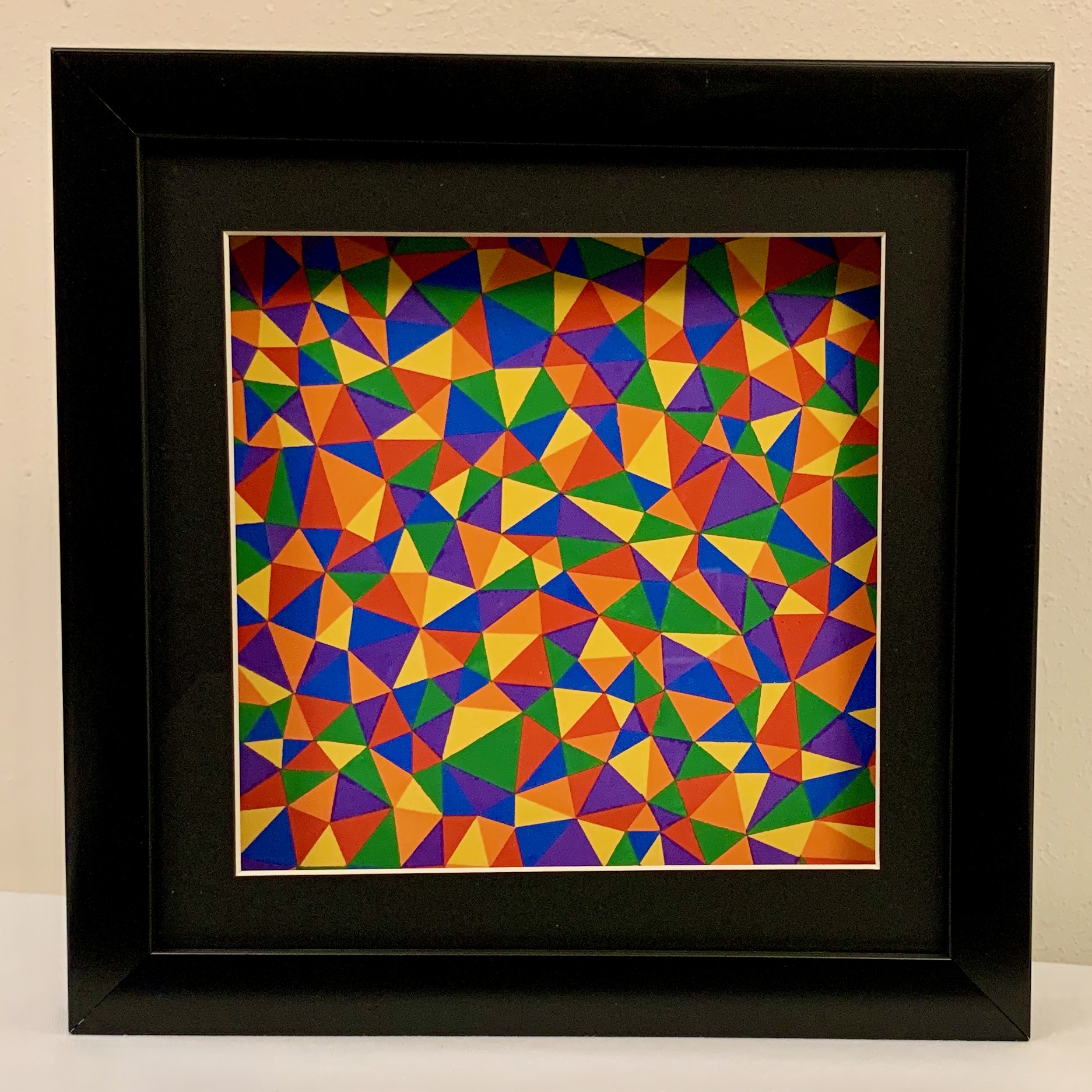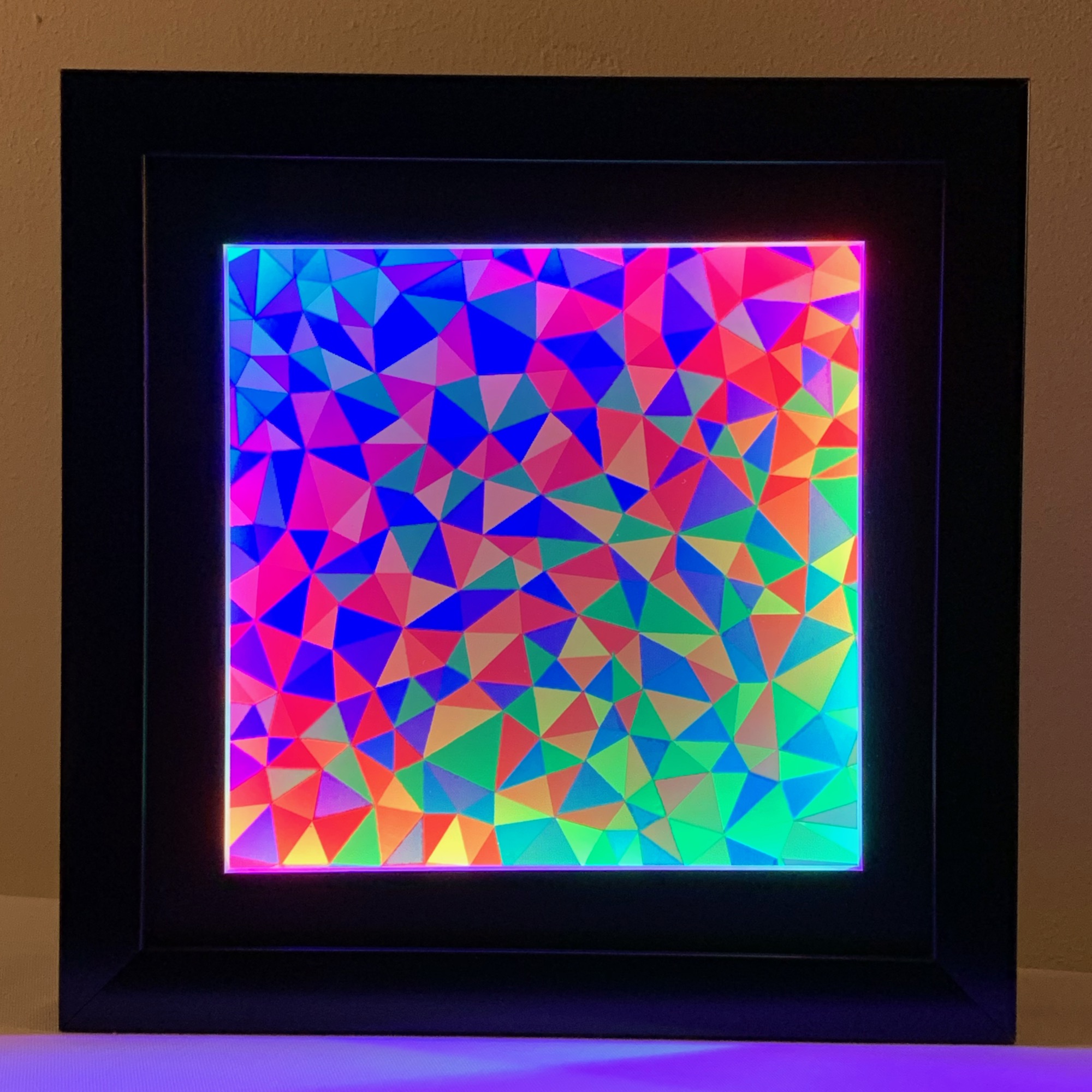 As the light color changes, the printed image appears to move and change. The graphic used in this case is an abstract geometric design created by the artist in 1999 (see Patience for information about the original acrylic on canvas version). The rotating lights create the illusion of a three-dimensional crystal with triangular facets, so the name has been changed for this mixed-media version. The original 36"x36" painting is reproduced here as one quarter of a 16"x16" archival print, so it is a magnified version of LED Geode I.