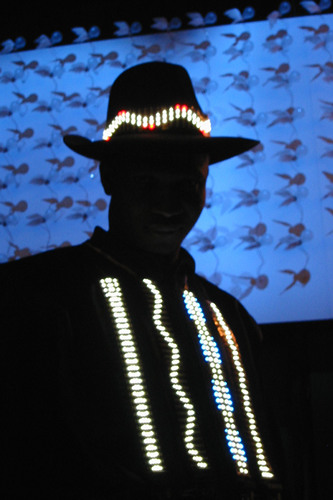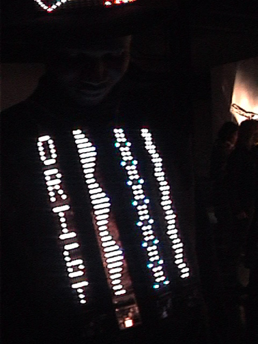 This vest contains over 1000 blue and white LEDs on flexible panels. The lights are used to display scrolling text messages, as well as abstract animation.