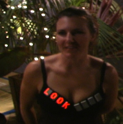 A performance art piece, challenging the viewer to NOT look at the blinky light-up message on the model's cleavage. The entire animated scrolling message moves very slowly, and reads: