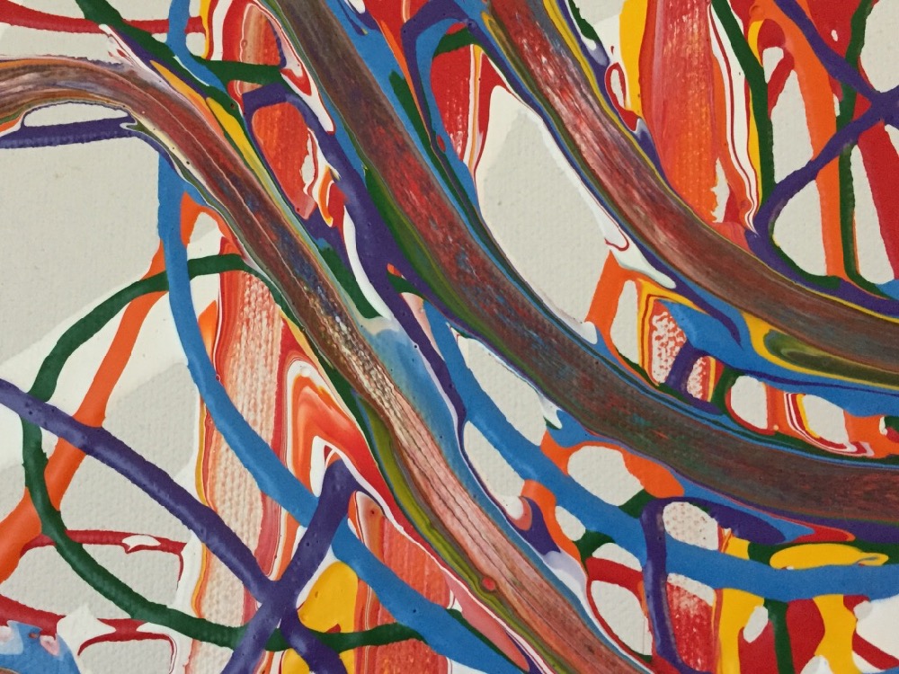 Rainbow Swirl and Chocolate Swirl represent a departure from the artist's hard-edge abstract geometric paintings. Instead of being planned in advance, these works emerged from spontaneous experiments with paint application and manipulation without brushes (aka finger painting).