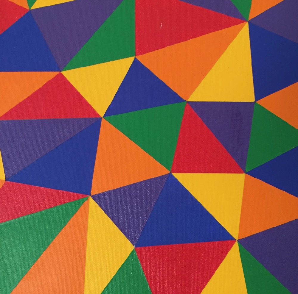 The triangles are filled in with the six basic hues of the color wheel: red, orange, yellow, green, blue, and purple, and no two adjacent triangles are painted the same color.