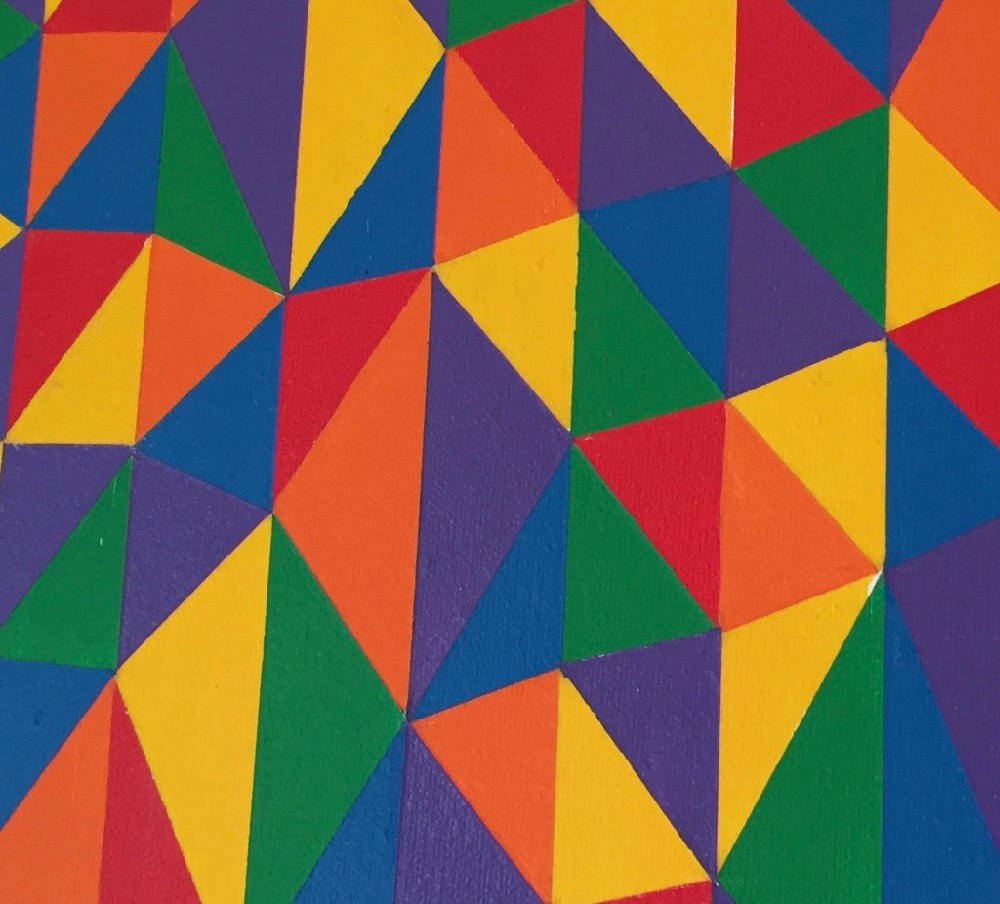 Like Random Triangular I, this painting is also based on a Delaunay triangulation. The seed vertices are points from a series of sinusoidal functions with regular x-axis spacing. This regular spacing creates the vertical lines in the picture. Some people see a scary clown face, but that part wasn't intentional.