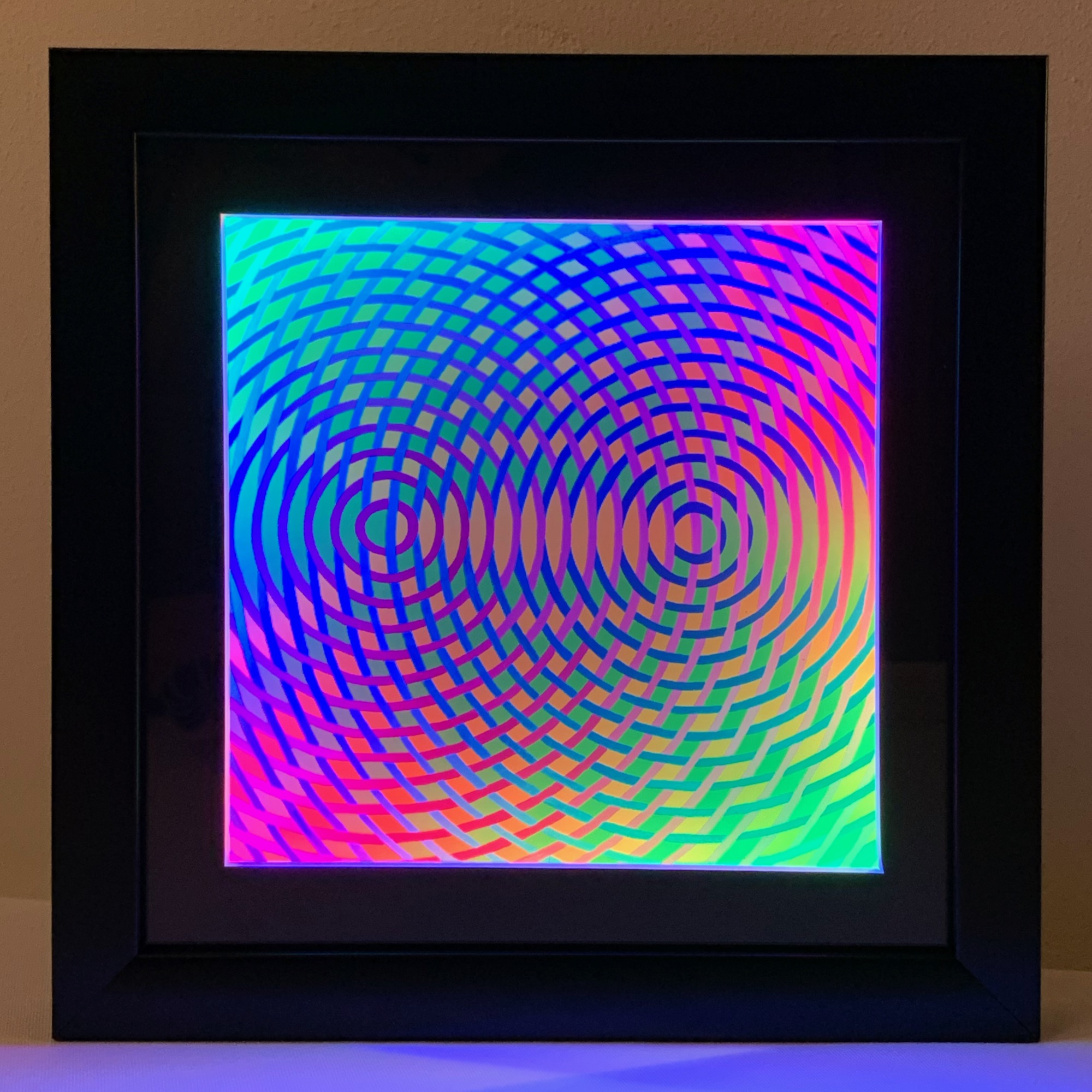 This piece plays with the effects of color-changing light on a multicolor printed surface. The RGB LED light sources are built into the edges of the frame, and the custom control electronics are mounted behind the image (also inside the frame).
