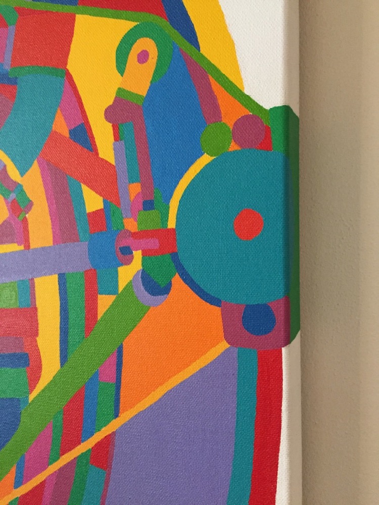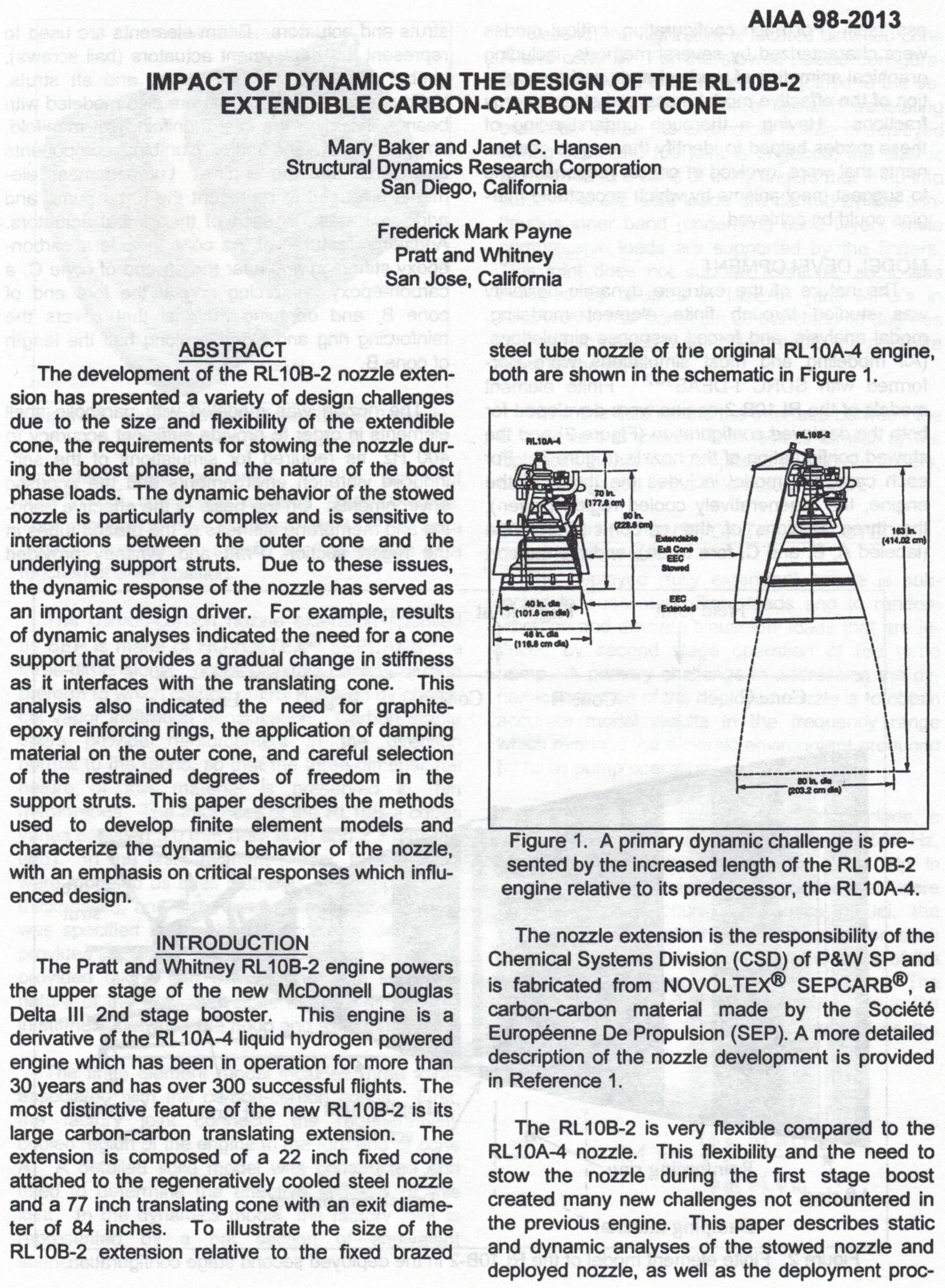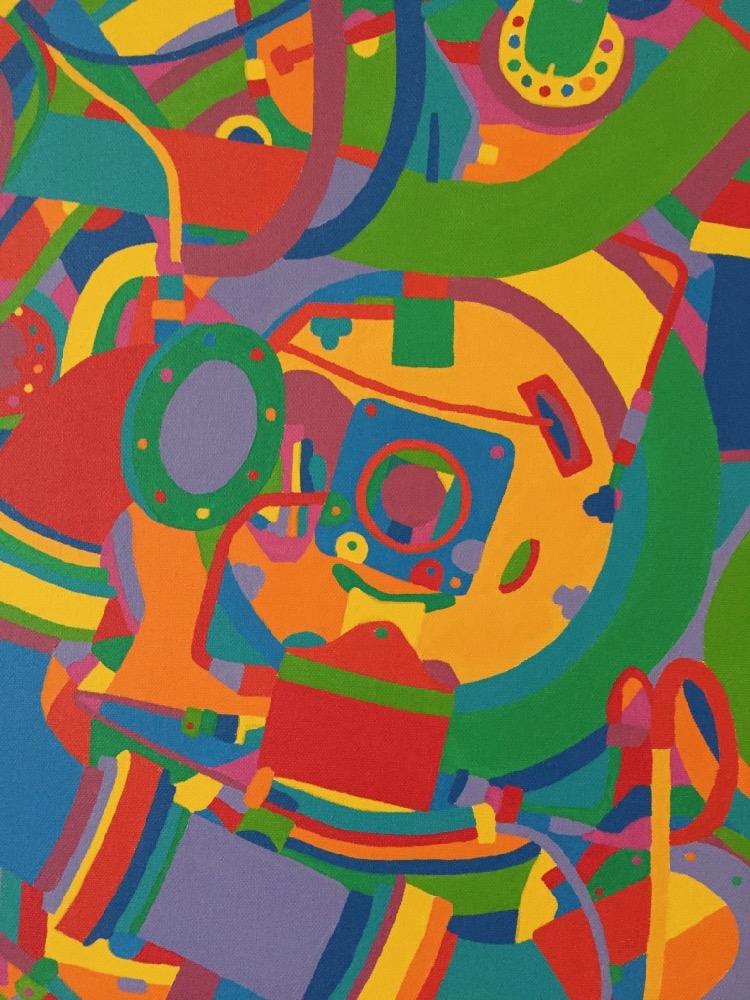 The artist worked on computer models for this engine in her previous career as an aerospace engineer, using finite element methods to calculate structural loads due to vibrations during liftoff. Dr. Hansen co-authored a paper entitled "Impact of Dynamics on the Design of the RL10B-2 Extendible Carbon-Carbon Exit Cone," and one of the figures from this presentation served as the inspiration for this painting.