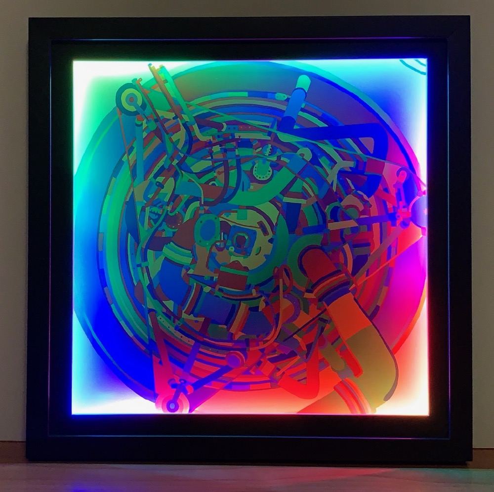 This piece plays with the effects of color-changing light on multi-colored pigments, and combines modern RGB LED illumination techniques with a graphic created by the artist in 1998 (see Rocket for information about the original acrylic on canvas version).