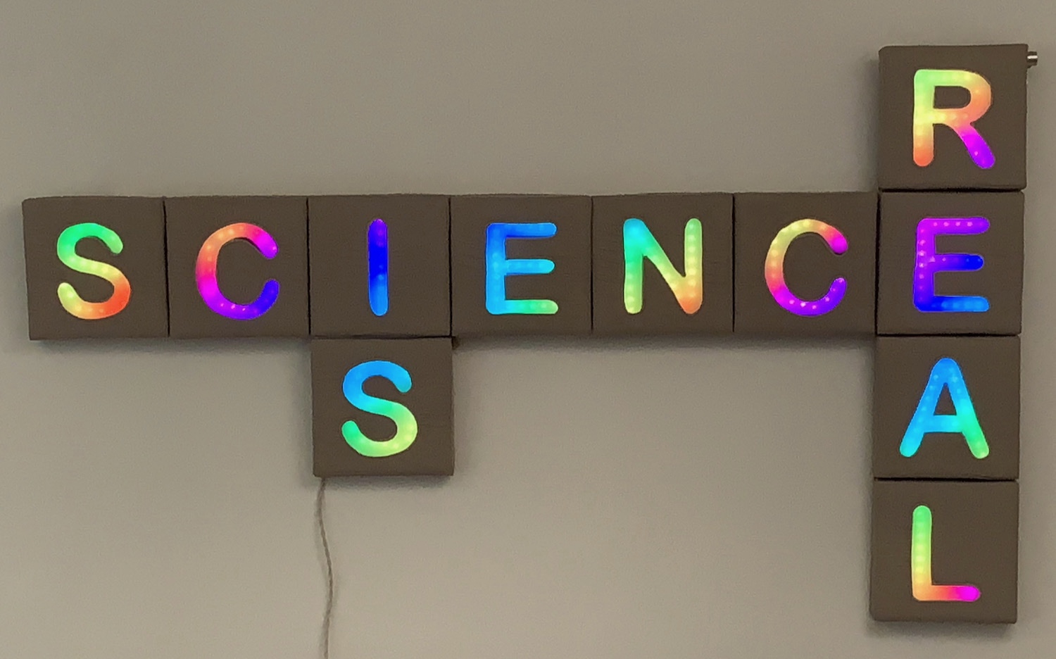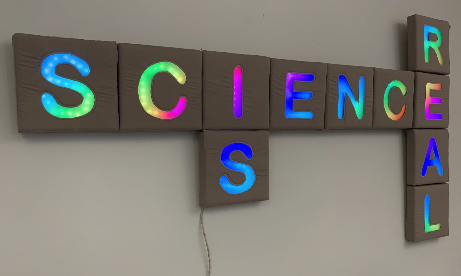 This piece, designed and built mid-pandemic, celebrates the value of evidence-based research with a simple message: Science Is Real. The artist found it therapeutic to build this piece during a time when far too many people are ignoring the recommendations of highly-trained experts, and falling victim to fear-mongering scammers and conspiracy theorists. It should not be controversial to be pro-science, pro-medicine, and pro-vaccine, but here we are.
